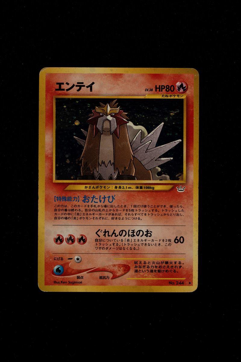 Tre carte olografiche in lingua giapponese, raffiguranti i tre Pokémon leggendari della regione di Johto, noti come i "Cani Leggendari": Raikou, Entei, Suicune (n.243/244/245). Le tre carte sono versioni olografiche dei Pokémon leggendari di Johto (spesso chiamati "Cani Leggendari") del Gioco di Carte Collezionabili Pokémon in lingua giapponese. Fanno parte del set giapponese chiamato "Awakening Legends" (che corrisponde al set occidentale Neo Revelation). Le carte non sono gradate e sono giocate. Per le condizioni dettagliate guardare bene le foto.