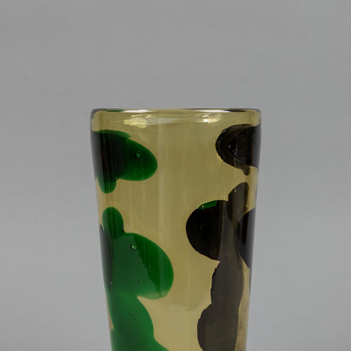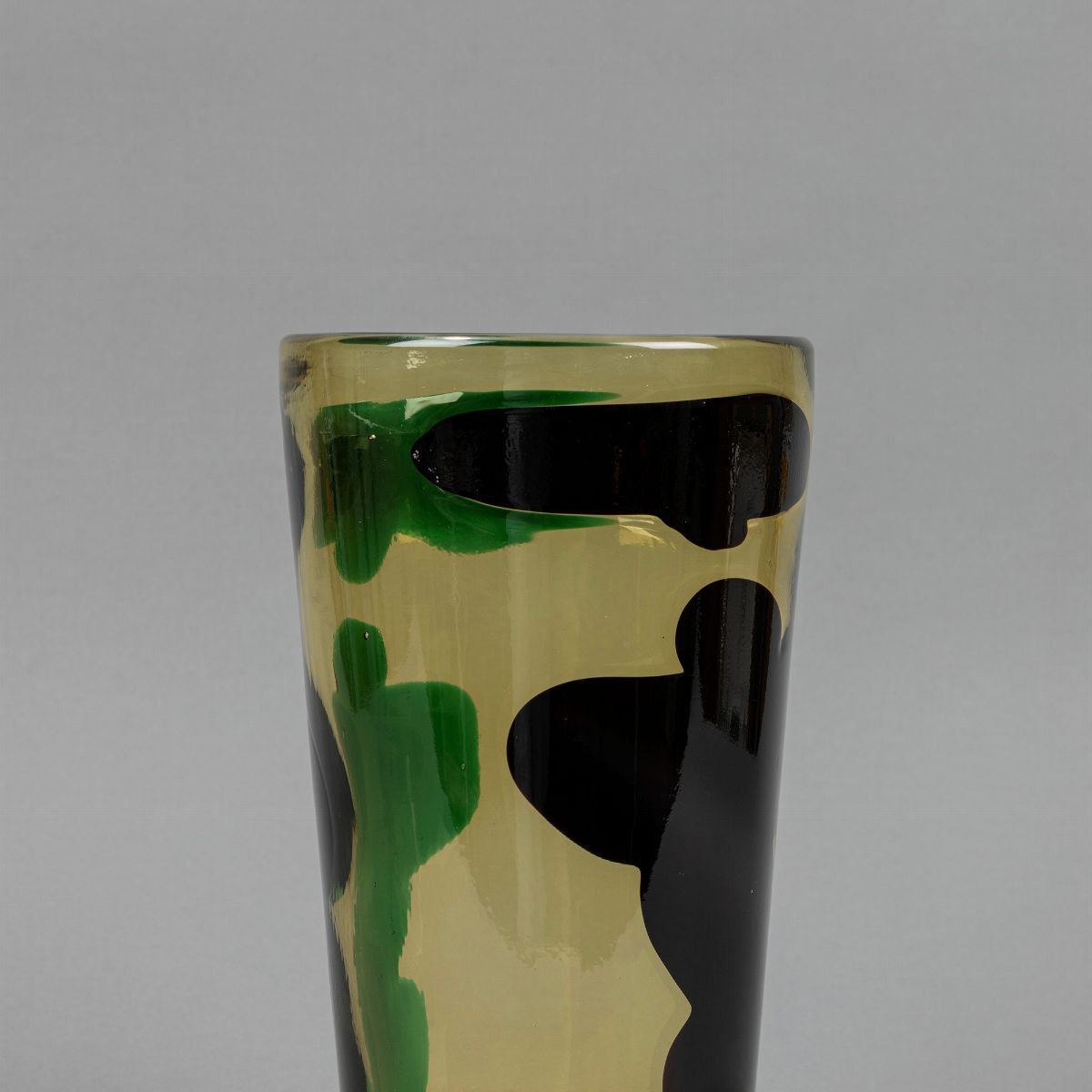 Della serie a Macchie con decoro astratto verde e nero. Produzione Venini. Etichetta originale sotto la base. Firma ad acido Venini Murano Italia.