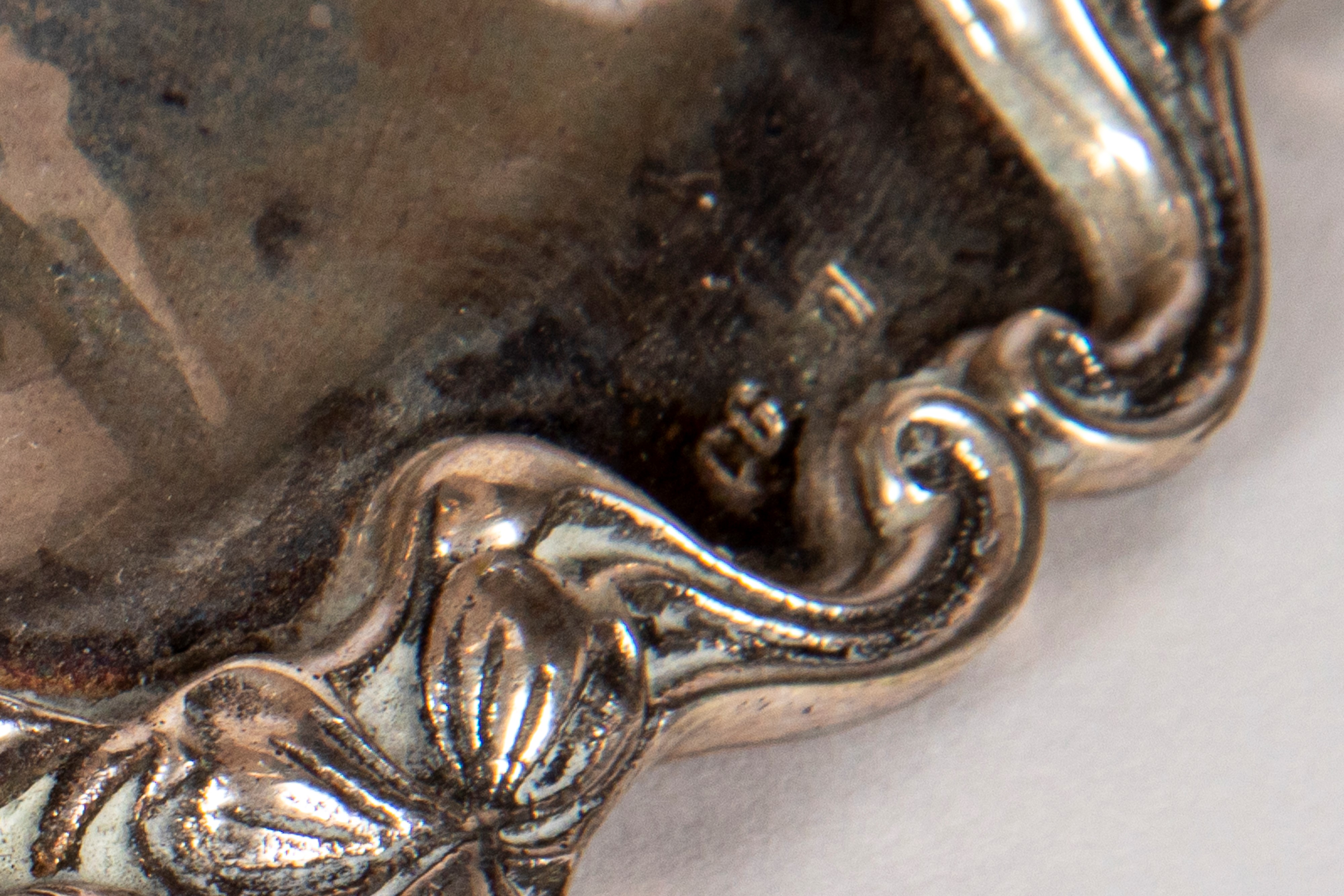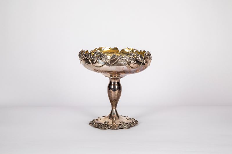 di gusto Art Nouveau, parte superiore circolare con cavetto dorato e bordo cesellato e traforato a motivi vegetali e rami con foglie, parte centrale tornita terminate con base circolare ulteriormente decorata.