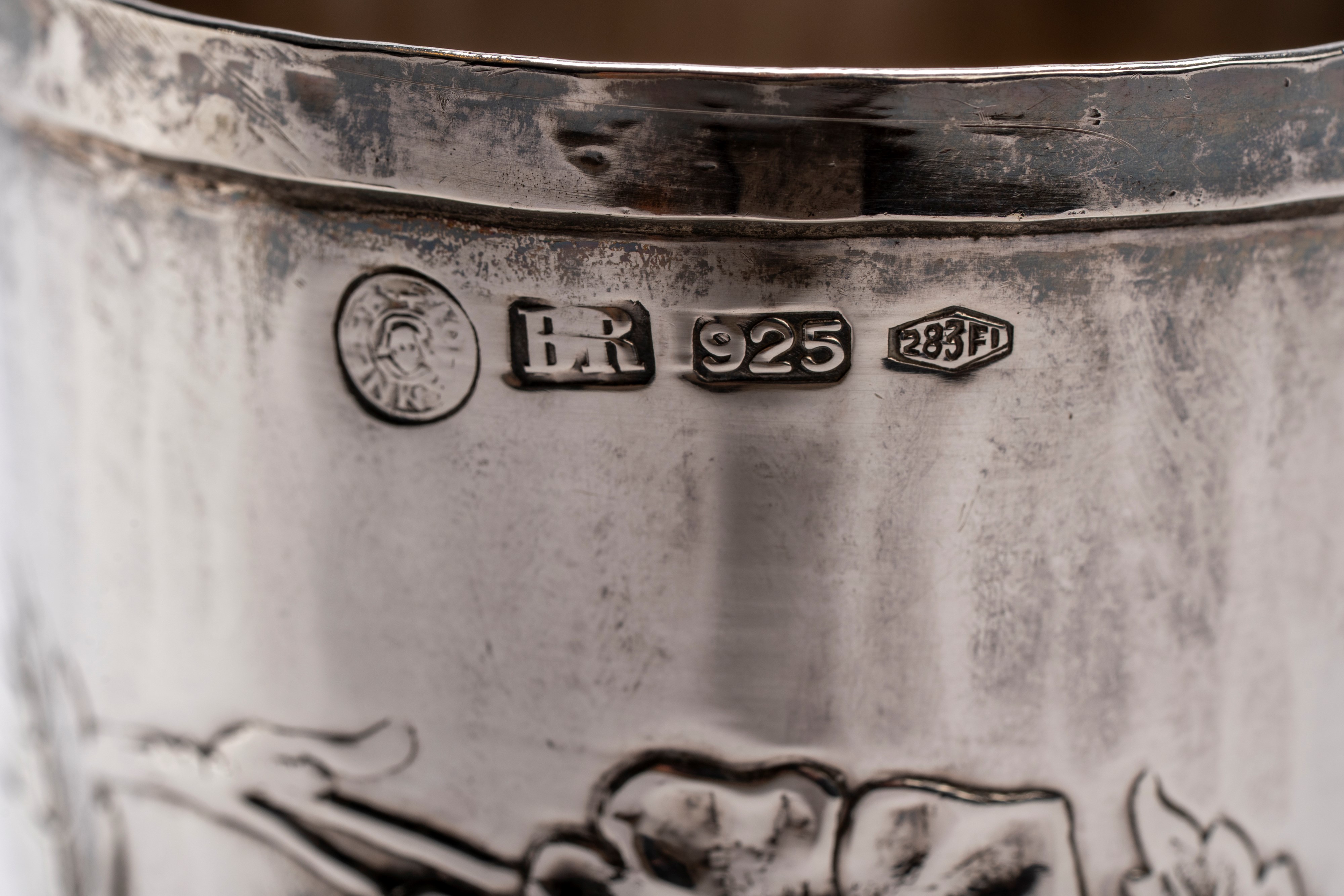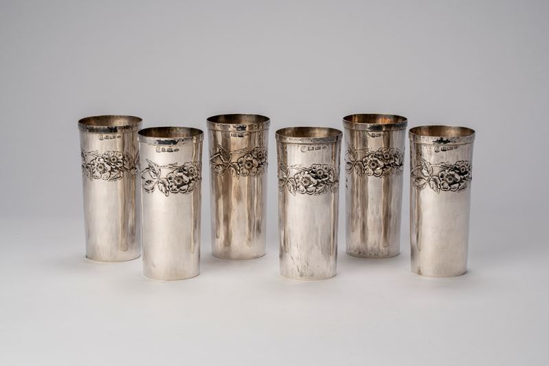 corpo di forma cilindrica con fascia superiore a decoro di rami fioriti leggermente sbalzati.