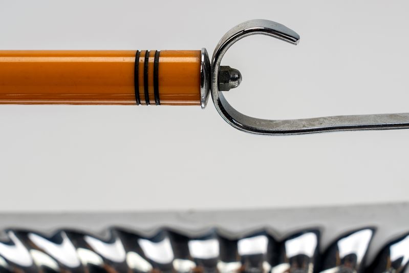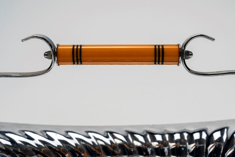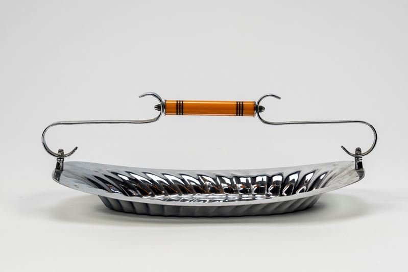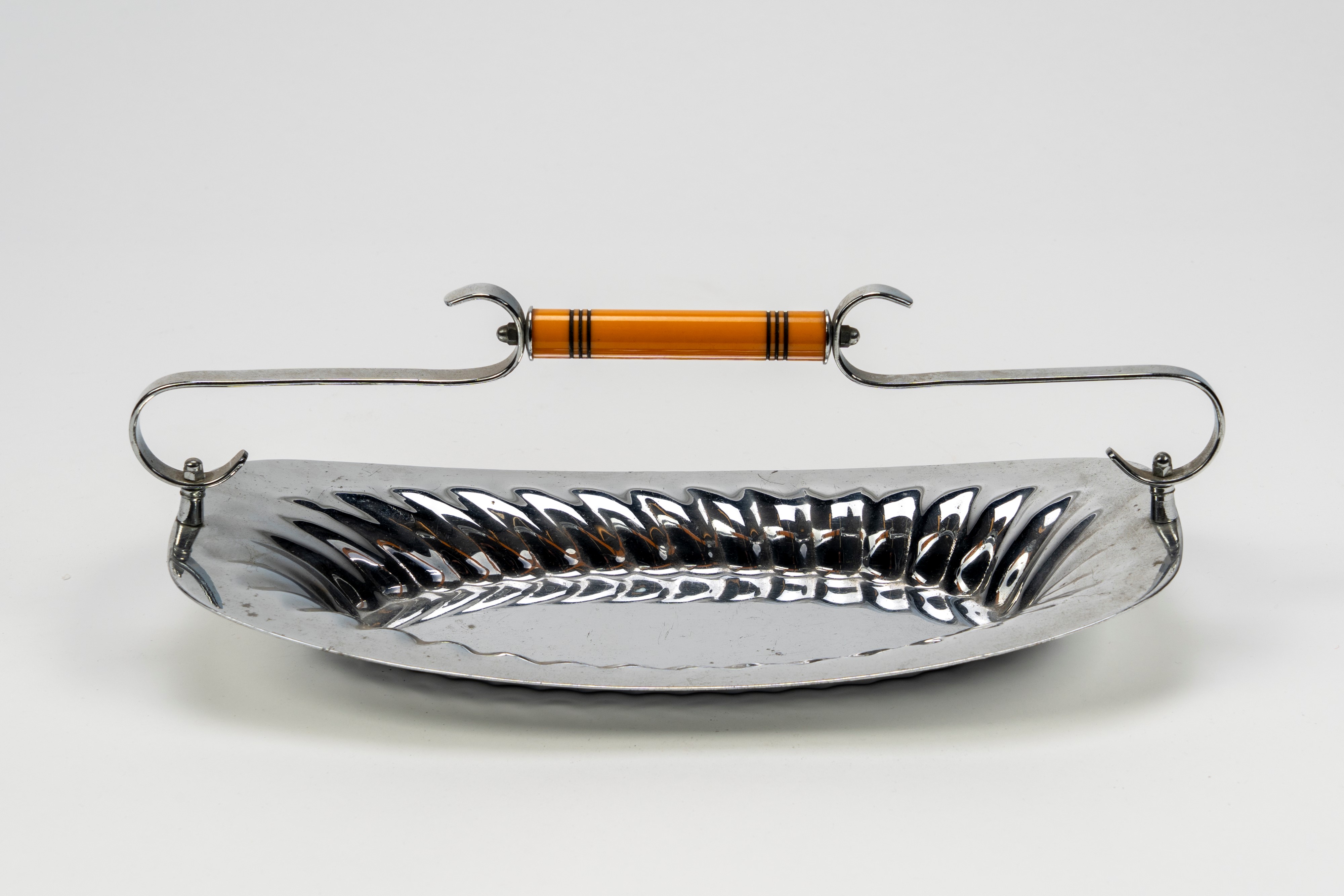 Vassoio biansato specchiato e un piatto da portata con coperchio in metallo cromato e bachelite, Secolo XX