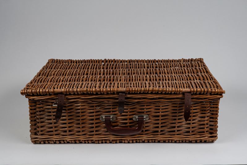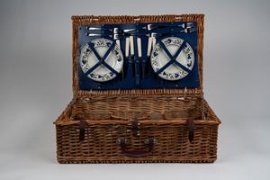 in vimini, contenente 6 piatti in porcellana, sei bicchieri in vetro, sei forchette sei coltelli, sei cucchiaini, sei tazze in porcellana