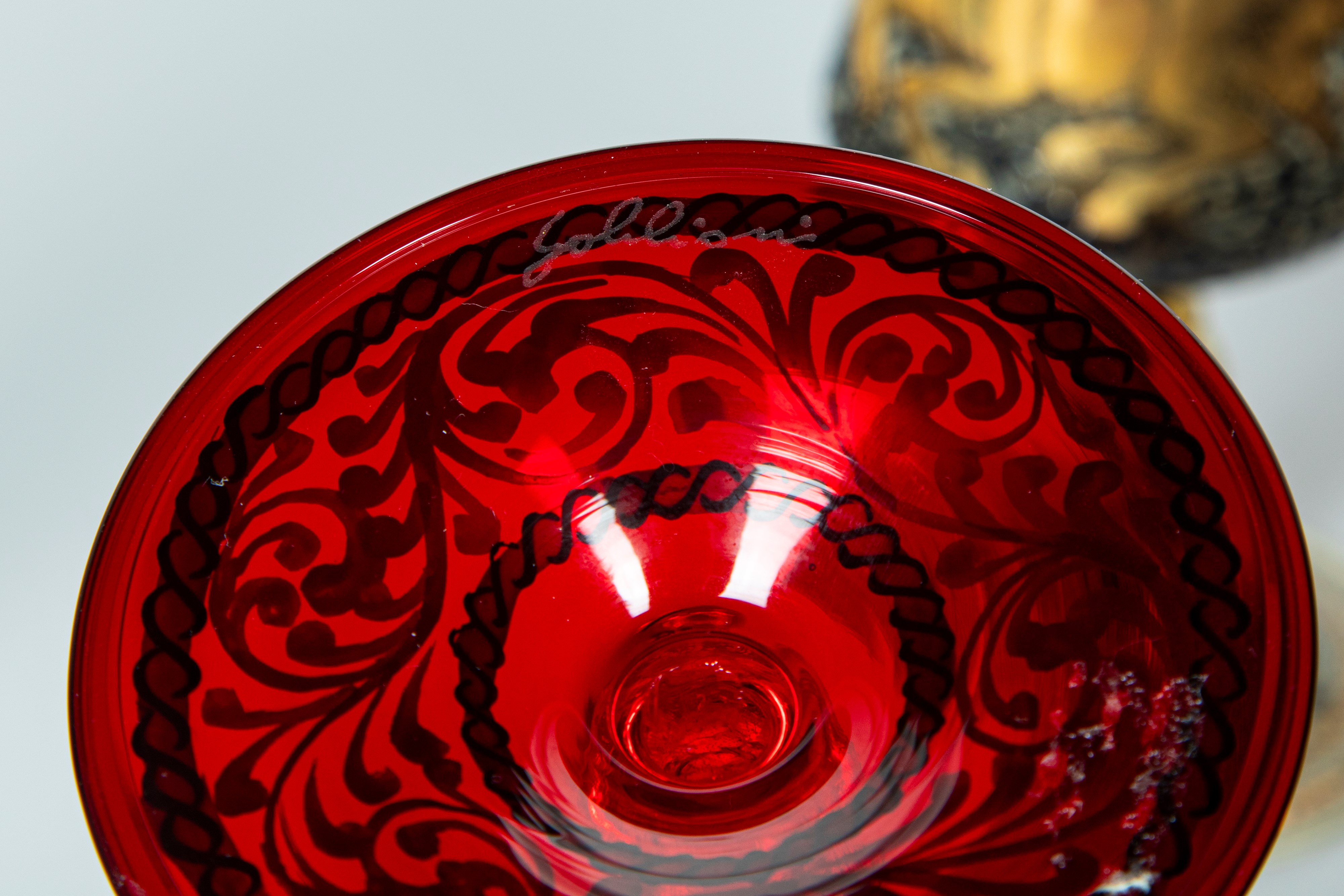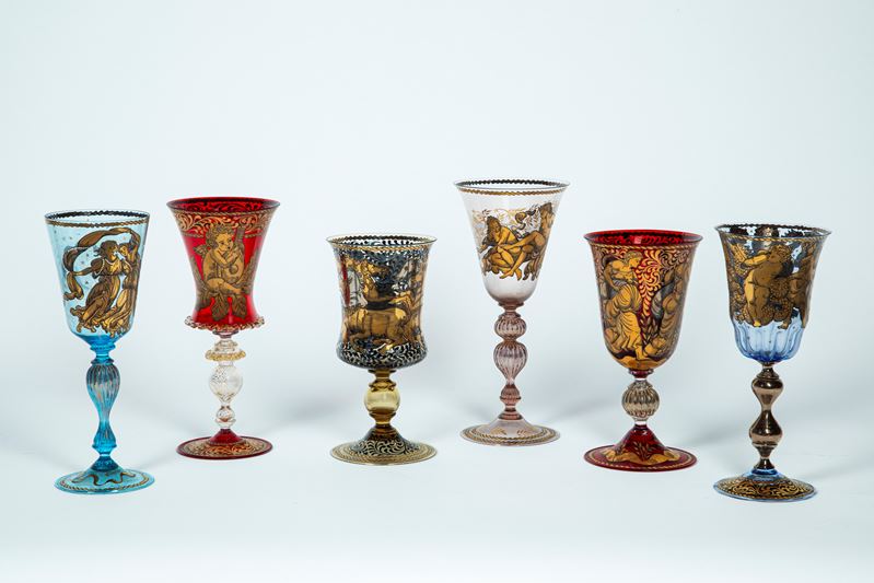 Collezione di sei coppe di diverse misure in vetro di Murano policromo dipinti a mano in oro a soggetti mitologici. Inizio secolo XX