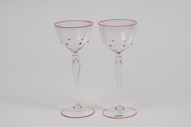 Coppia di calici in vetro di Murano incolore con applicazioni puntiformi e profili color rubino, secolo XX