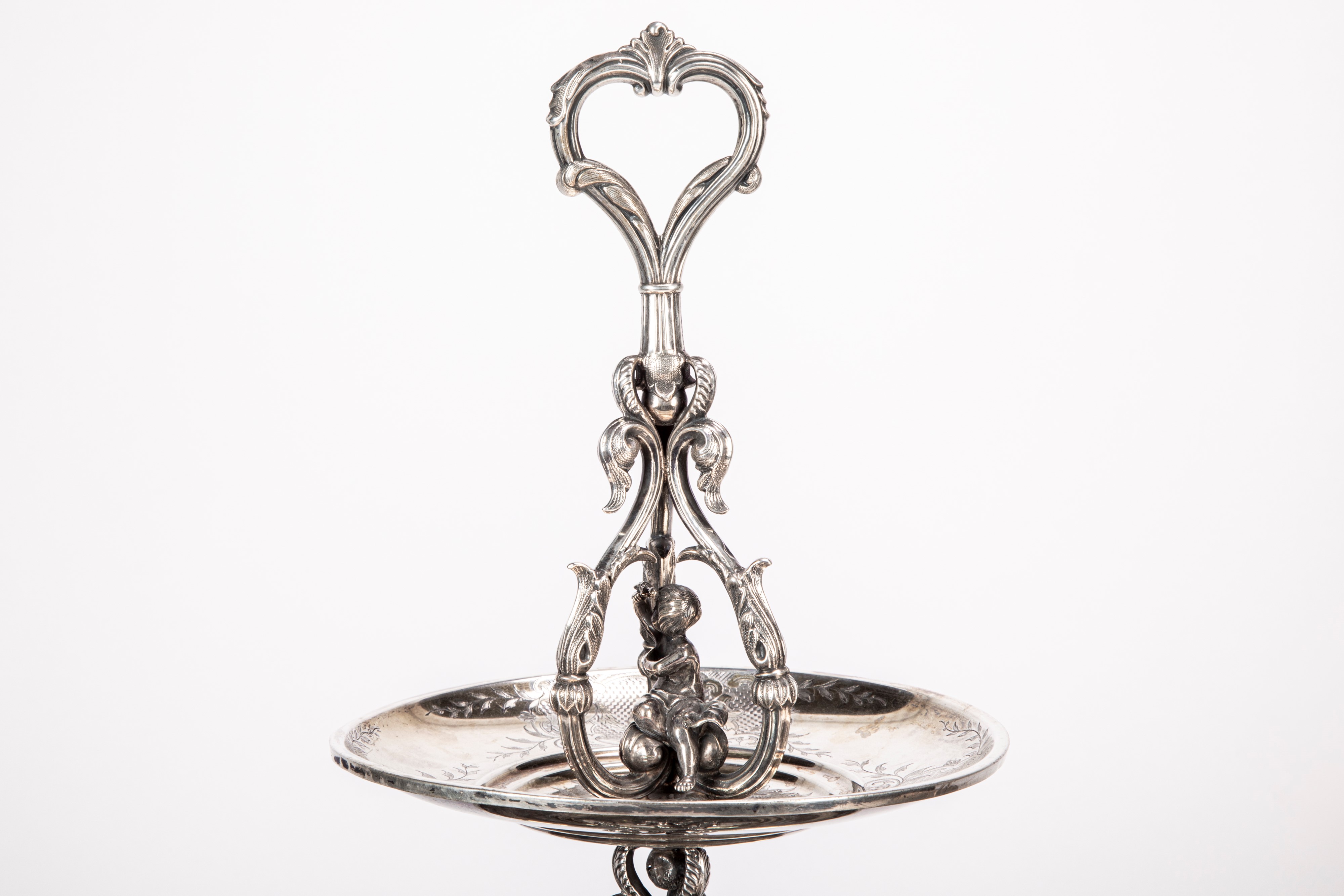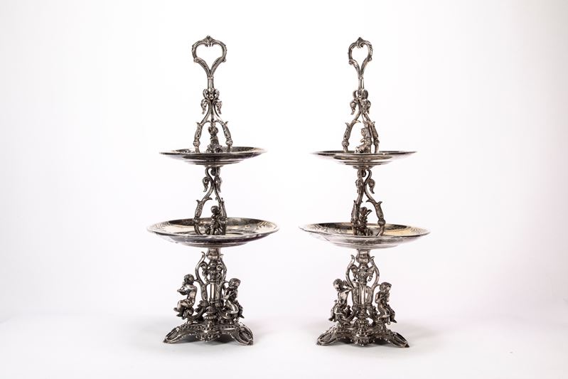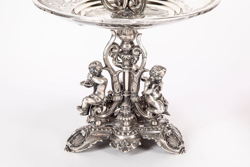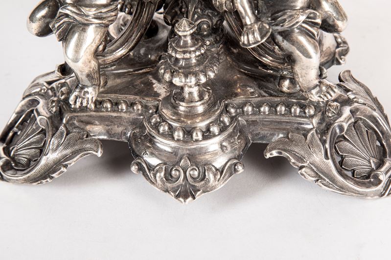 in argento, a due ripiani circolari decorati con incisioni a volute e motivi geometrici sorretti da montante centrale decorato in latro e al centro da volute mosse e putti centrali a tutto tondo, base decorata con putti musicanti cesellati a tutto tondo poggianti su base triangolare sbalzata e traforata a volute e foglie e piccoli vasi a tutto tondo. Difetti.