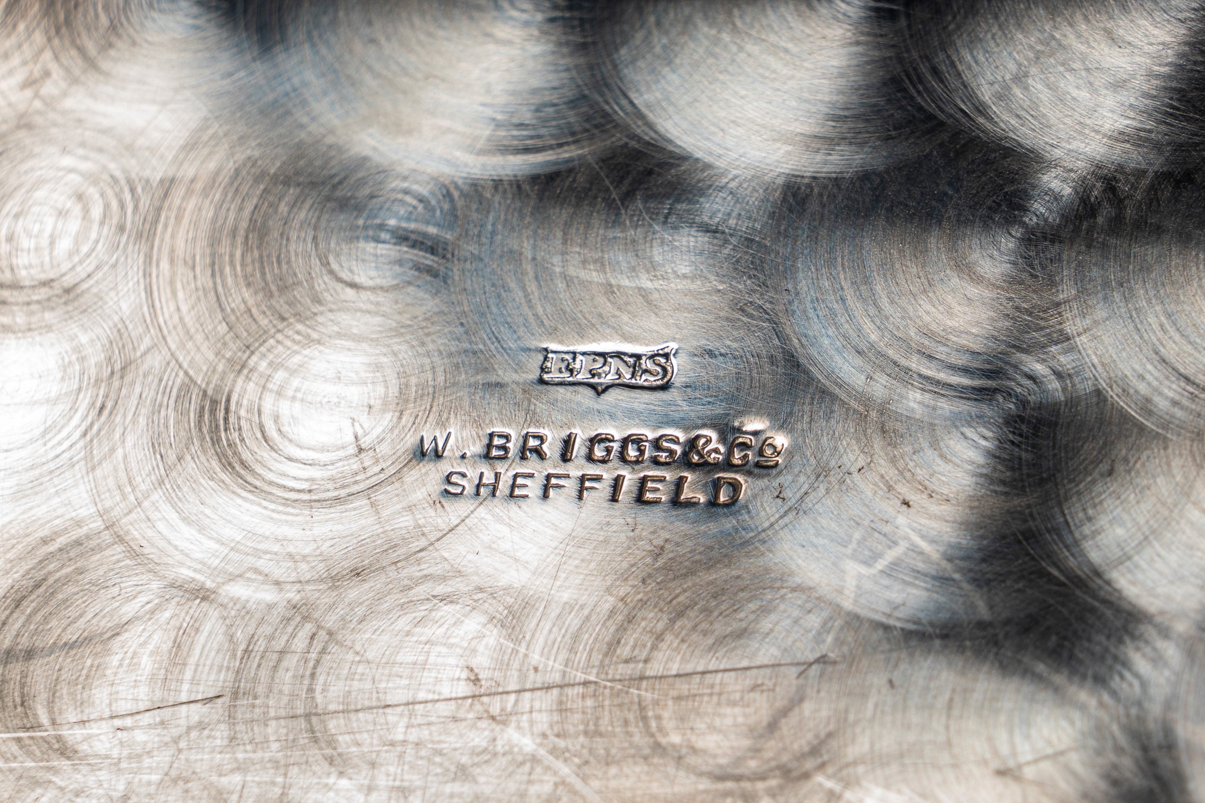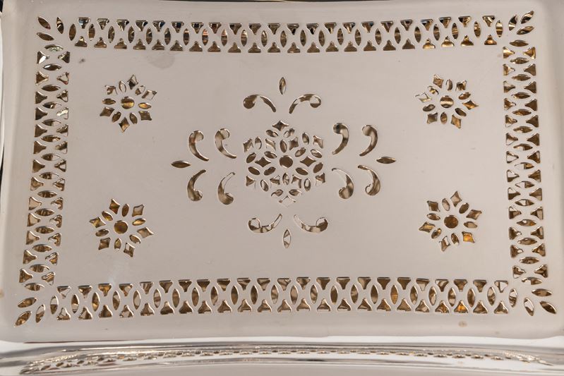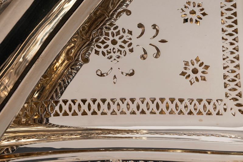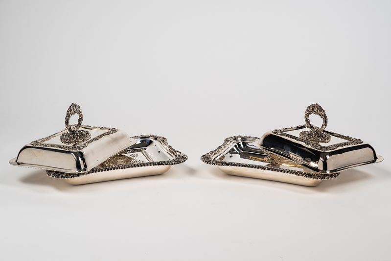 Coppia di legumiere in Sheffield con bordi mossi e presa ad anello decorati a valve di conchiglie e foglie