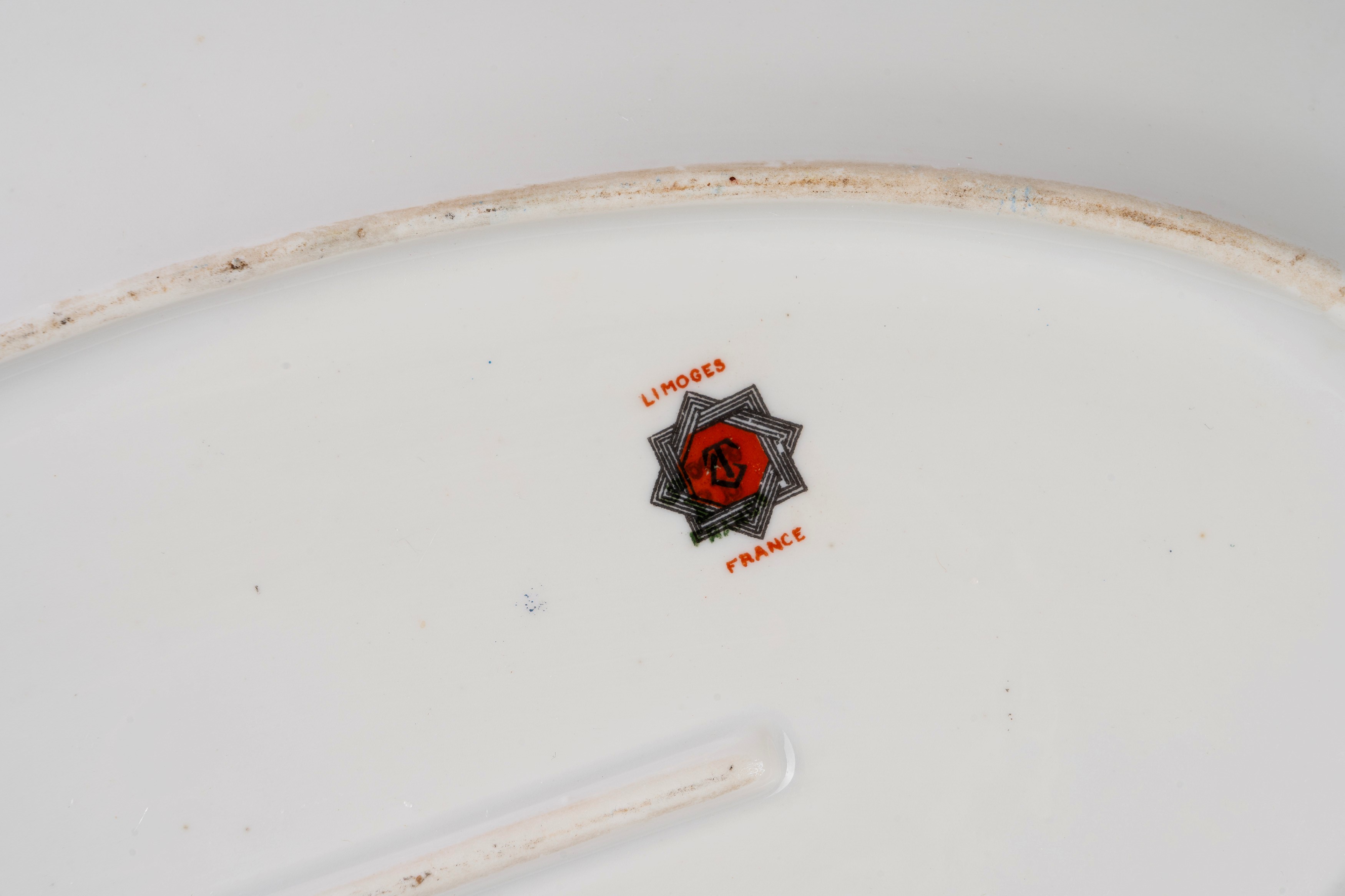 Coppia di piatti da portata in porcellana decorata in policromia con uccelli su rami fioriti, Limoges France