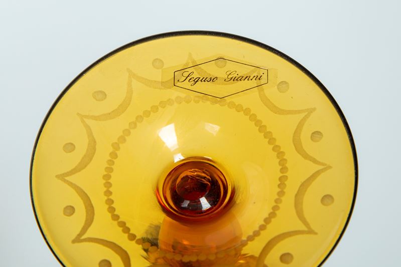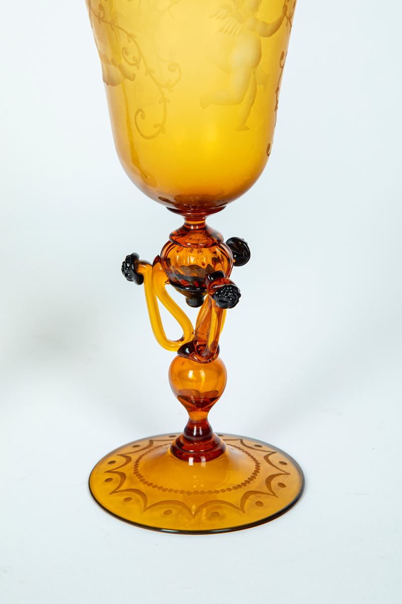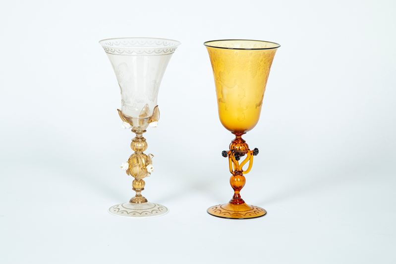 Due calici da parata in vetro soffiato di Murano uno trasparente e l'altro color ambra incisi a bulino uno con leone di san Marco e l'altro a putti bacchici, XX secolo