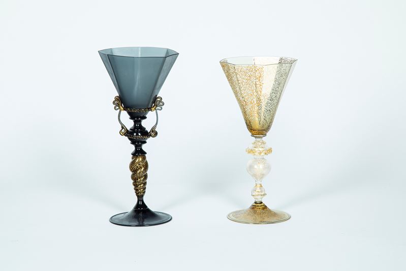 Due calici in vetro di Murano con decoro a foglia d'oro, uno firmato Gabbani, XX secolo