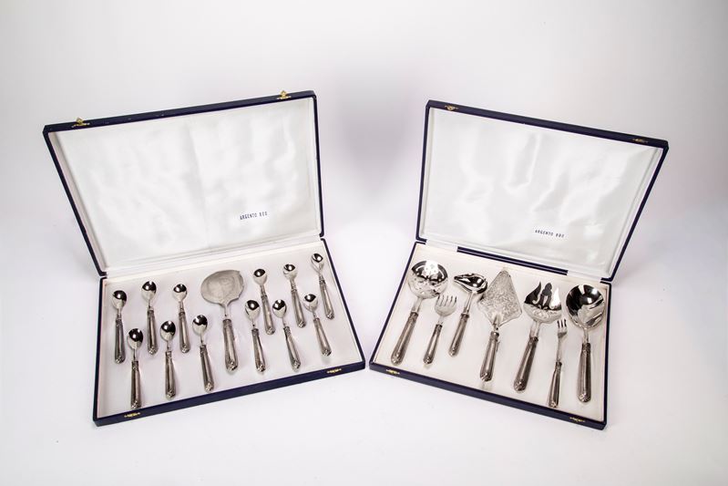 composto da 10 cucchiai, 1 paletta da dolce, 2 forchettine, 2 cucchiai, 1 paletta da servizio e 2 posate da insalata; con manici rivestiti in argento sbalzato.