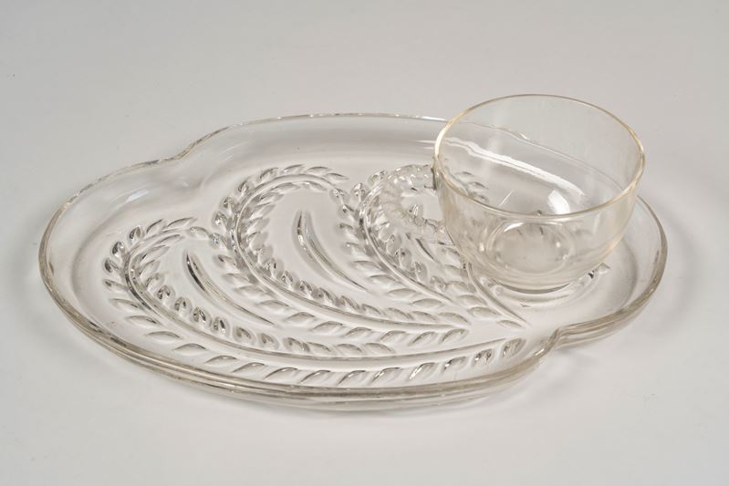 Due Snack set composti da quattro tazze e quattro vassoietti di forma mossa con decoro a rami fogliati in vetro trasparente, Produzione americana, Ohio