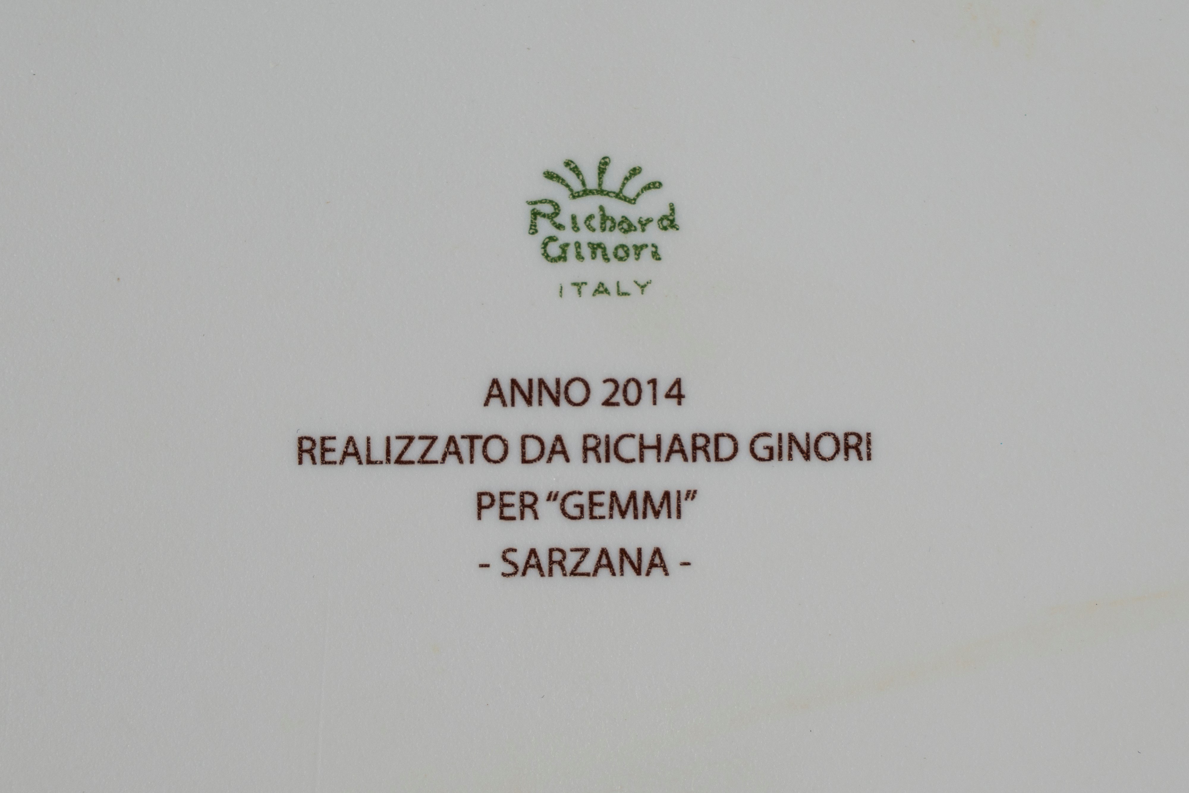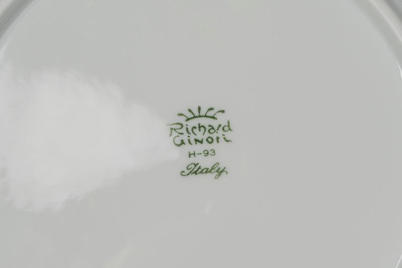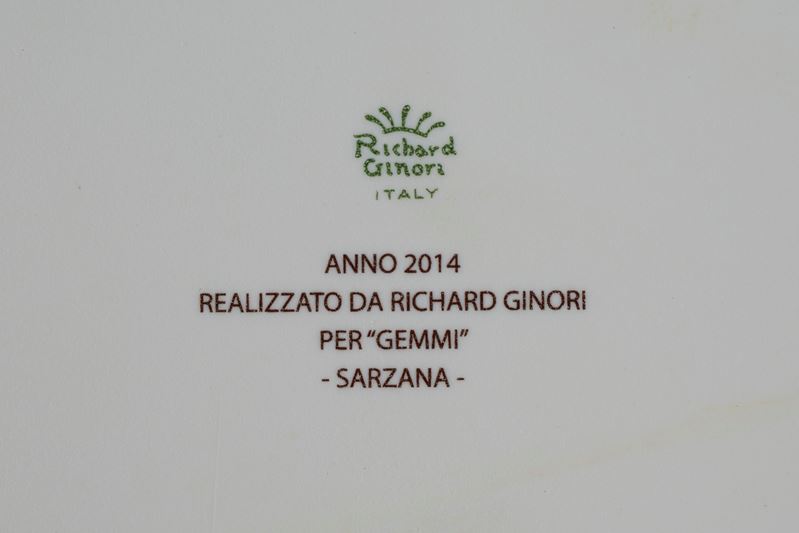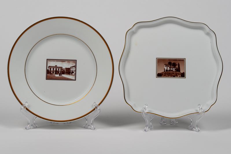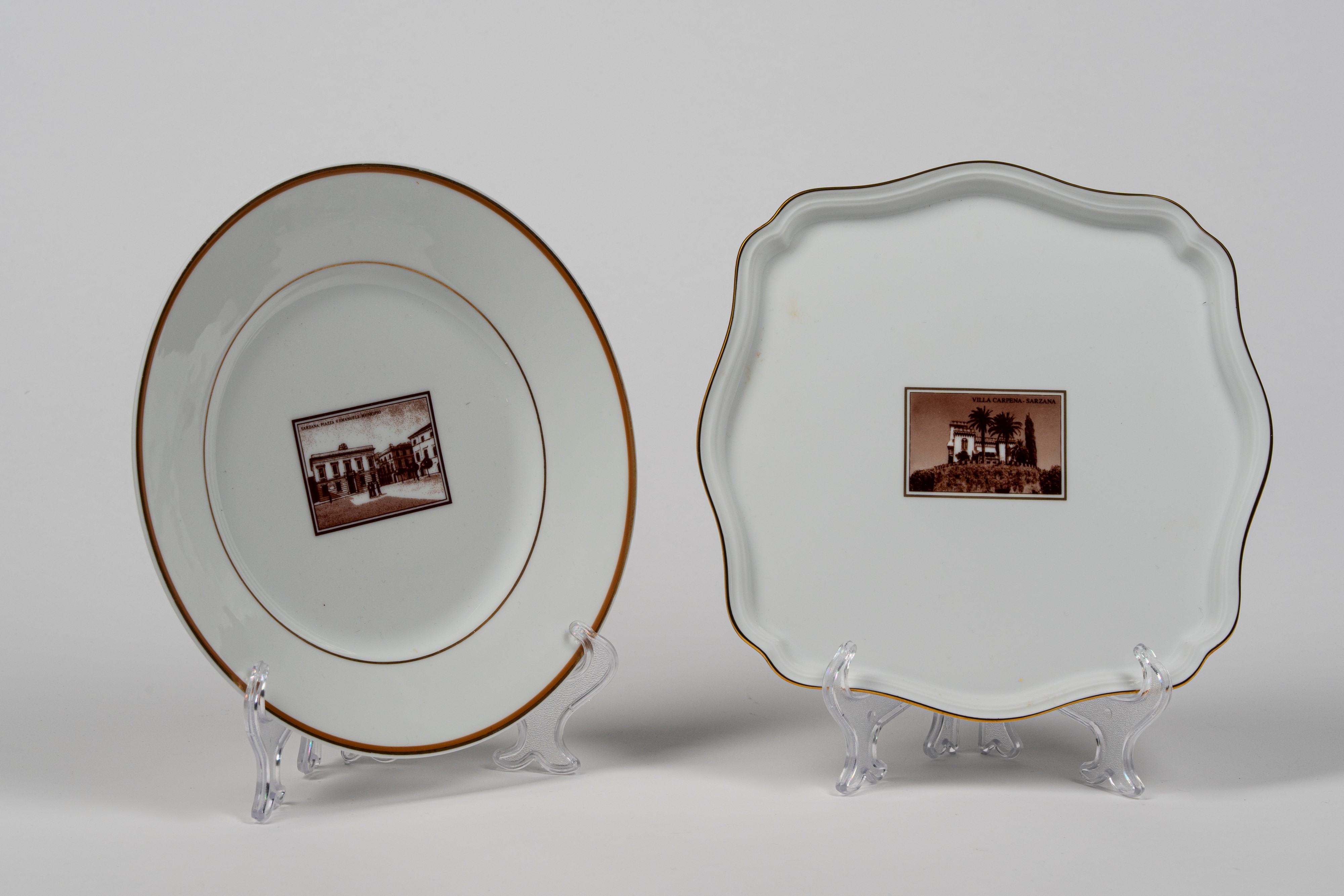 uno di forma quadrata lobata con bordo dorato e uno tondo, ciascuno decorato al centro con immagine architettonica in monocromia seppia recante la dicitura “Villa Carpena - Sarzana” e "Sarzana: Piazza V.Emanuele Municipio"; marchio e manifattura al verso.