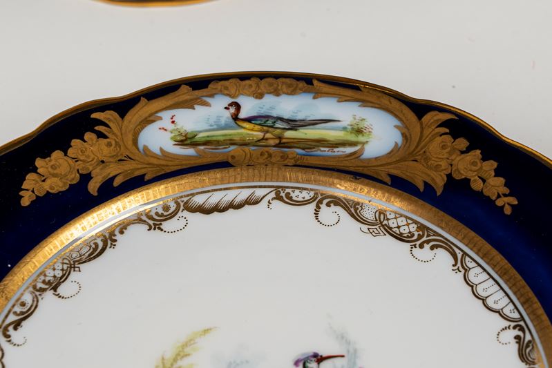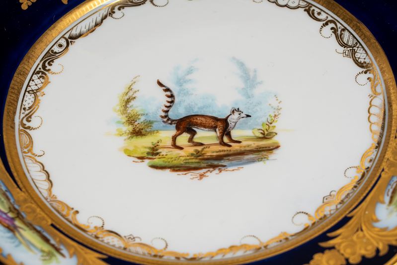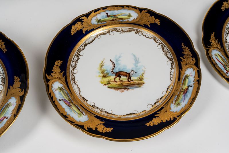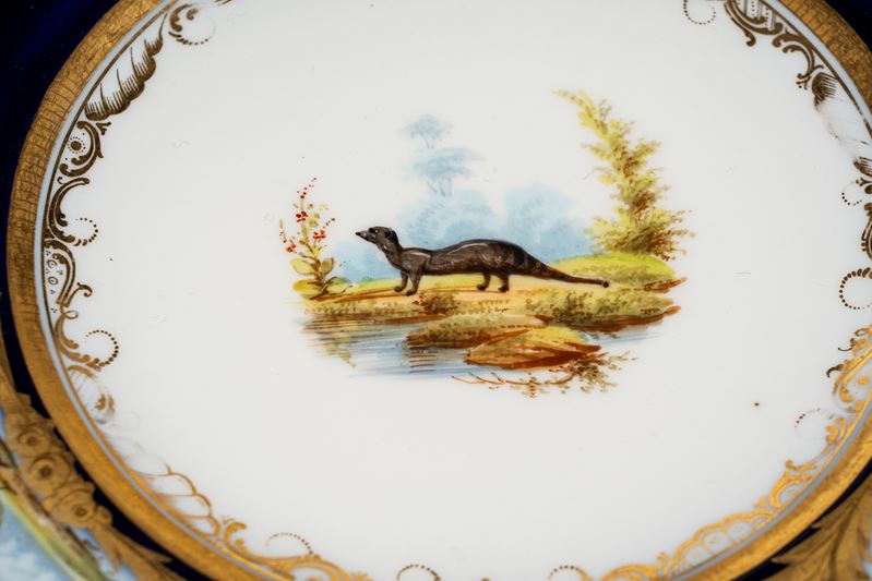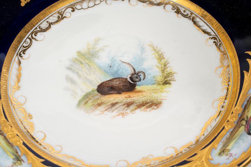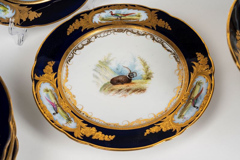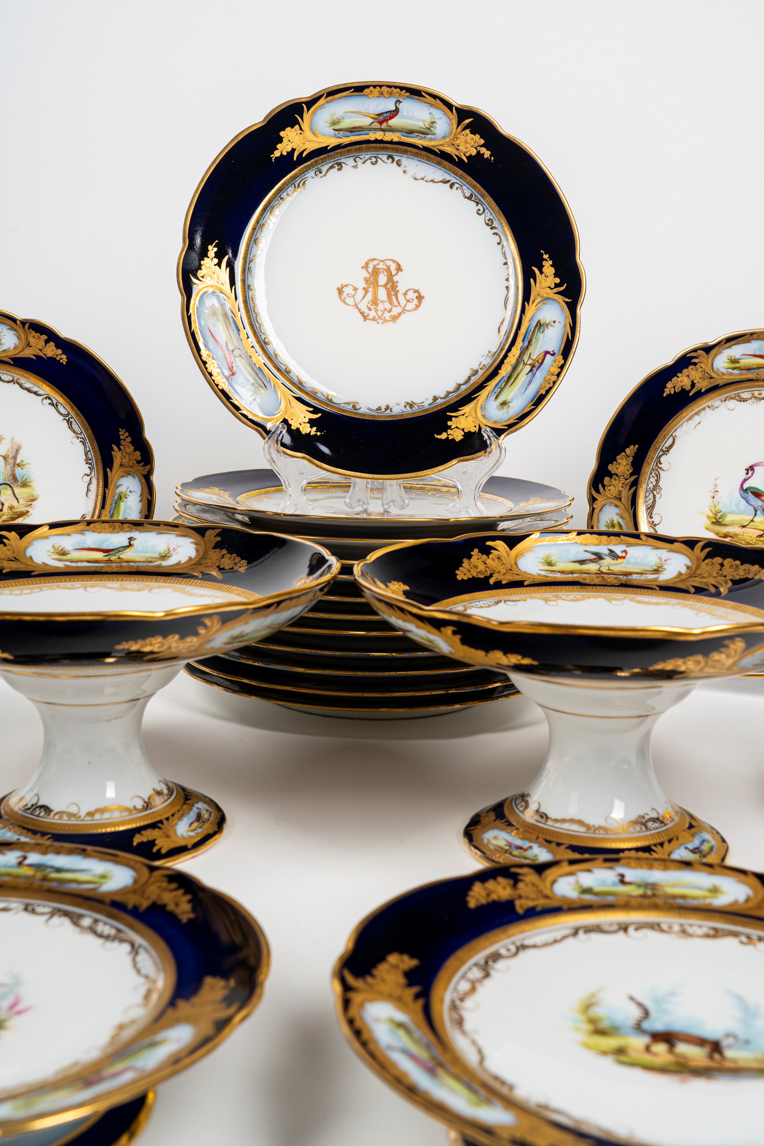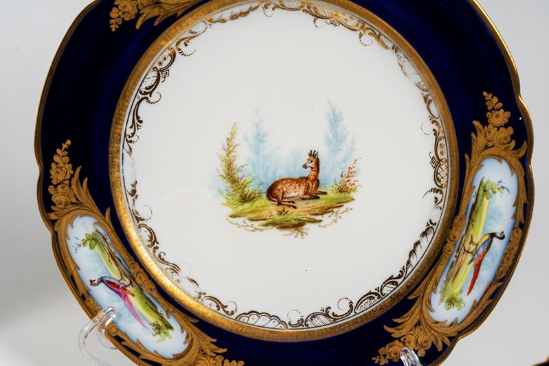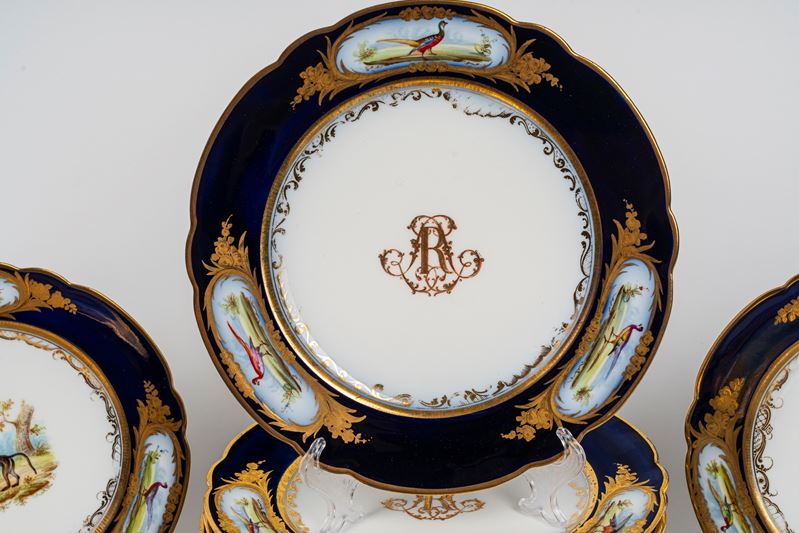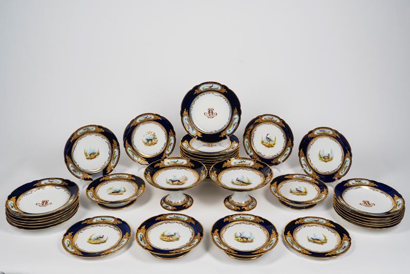 Elegante servizio in porcellana a bordo blu cobalto e oro con animali e monogramma "R". Parigi, Pillivuyt & CH.s Dupuis e Cis, 1860 circa