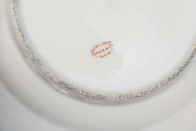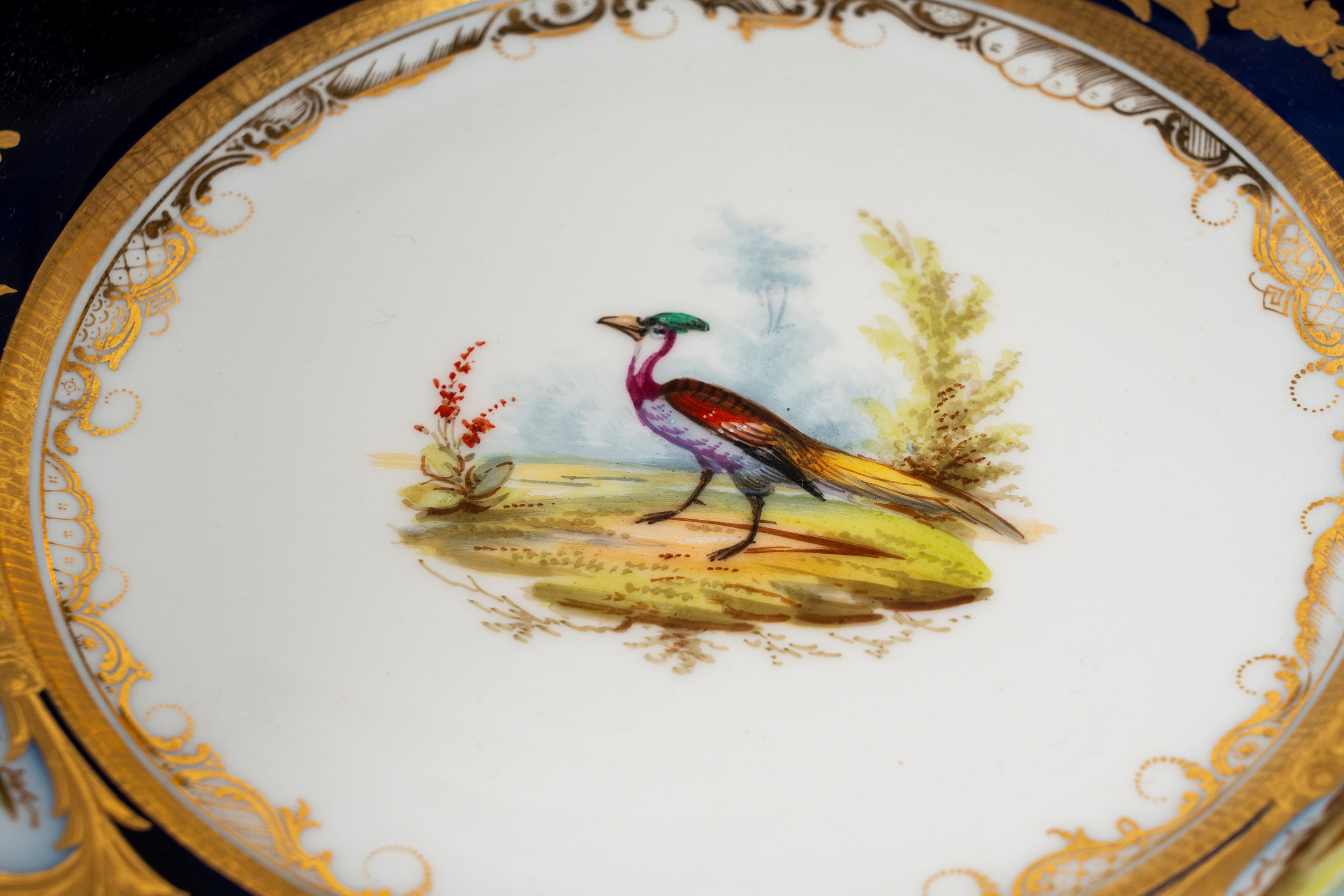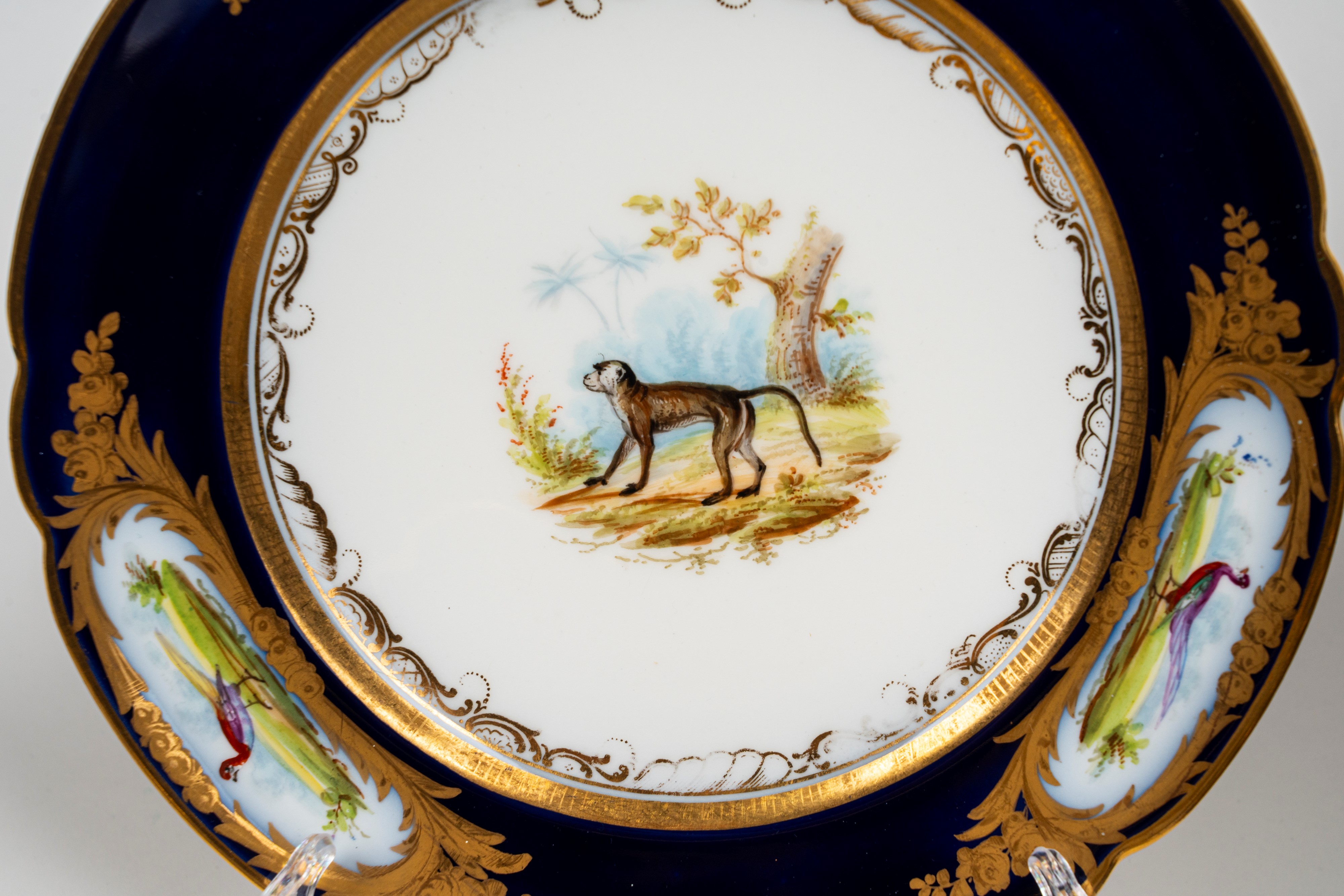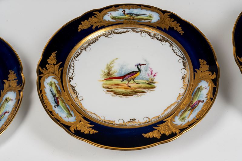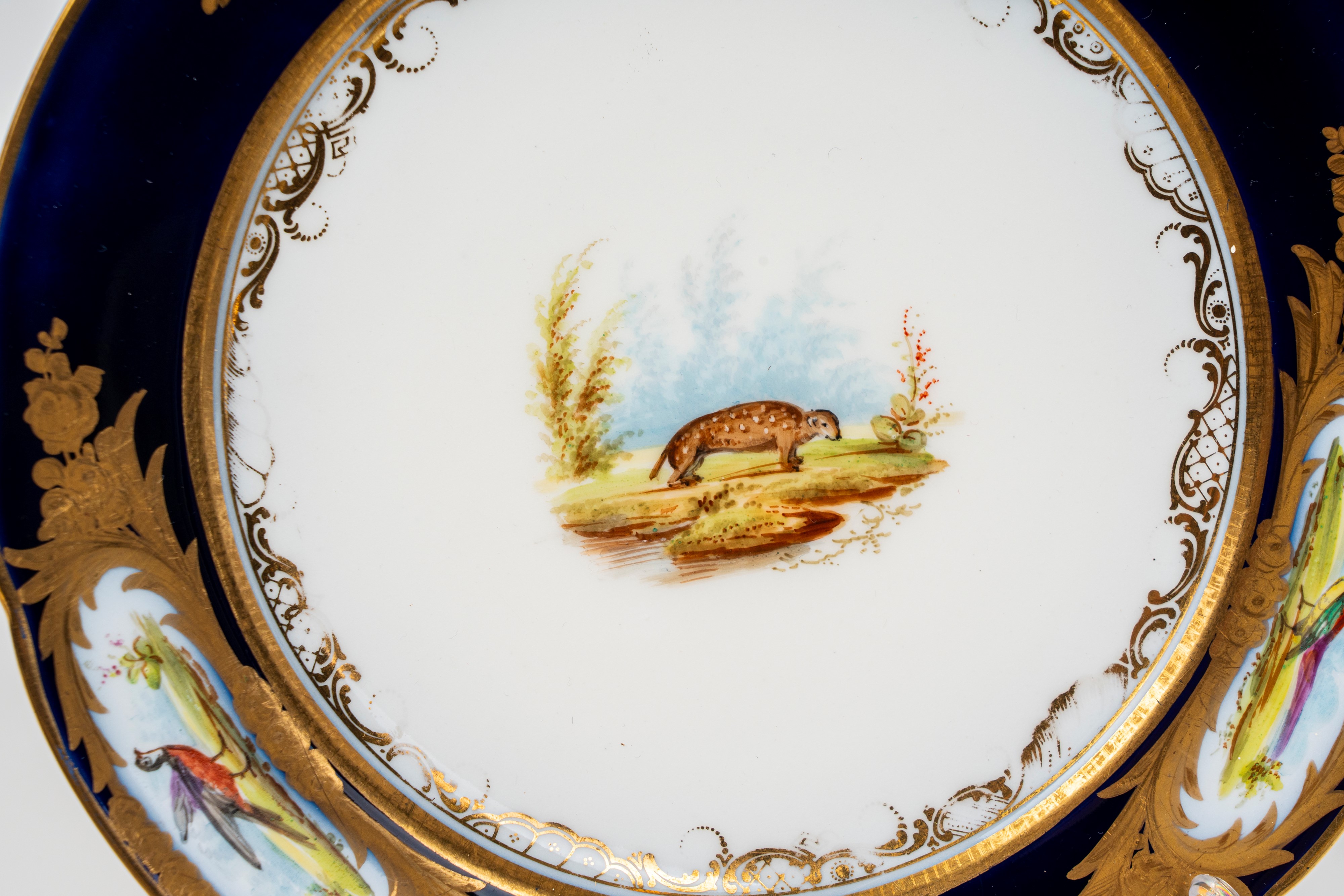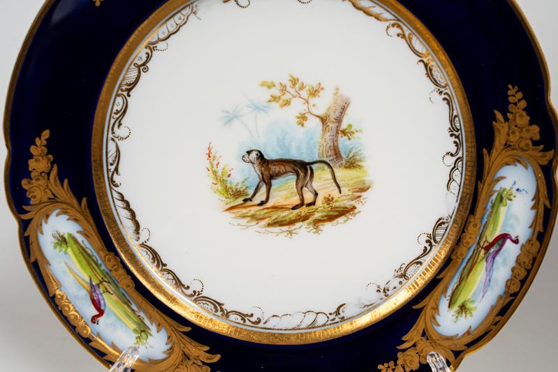 Elegante servizio in porcellana a bordo blu cobalto e oro con animali e monogramma "R". Parigi, Pillivuyt & CH.s Dupuis e Cis, 1860 circa