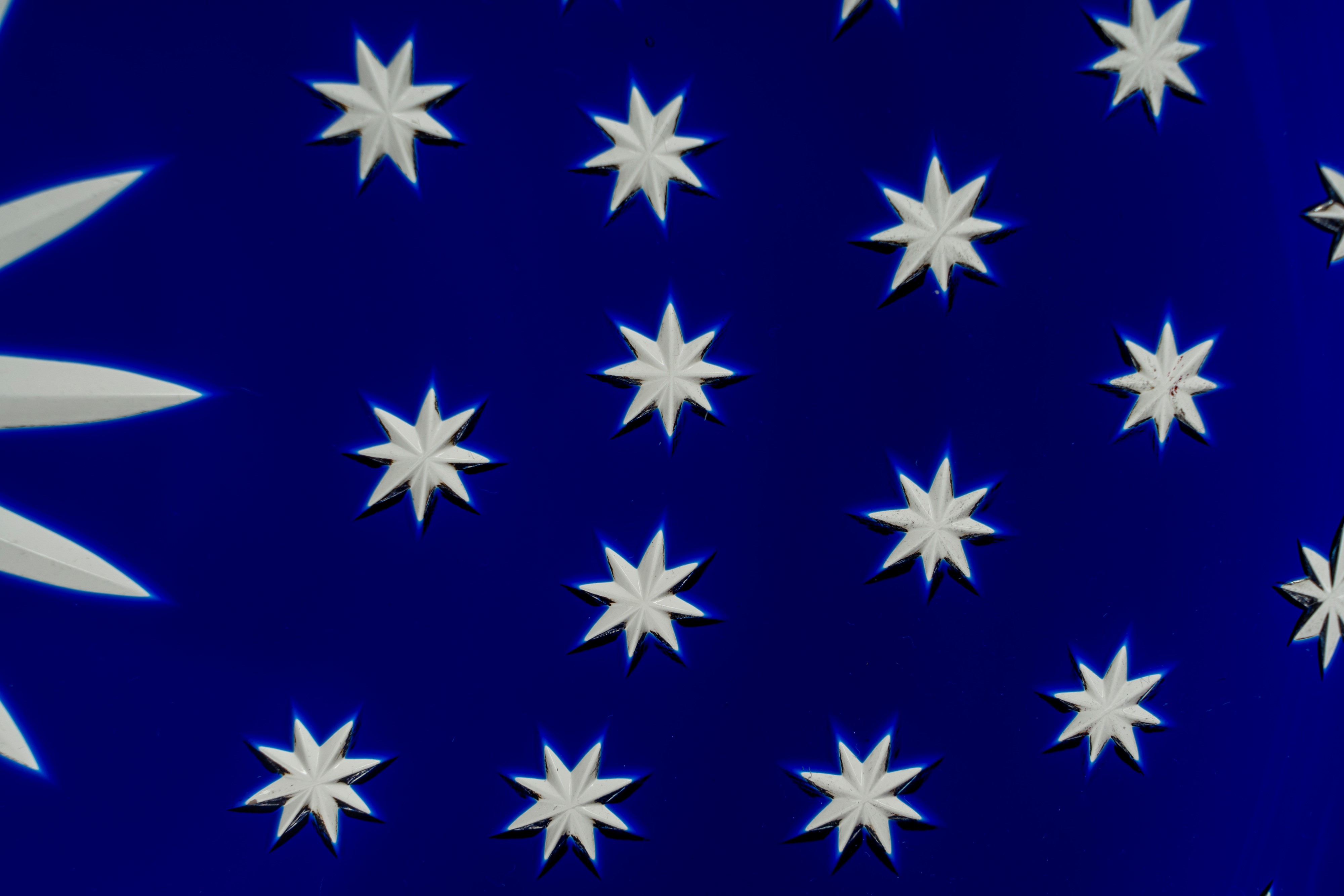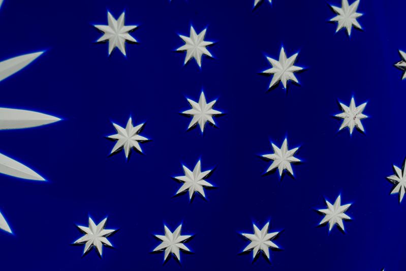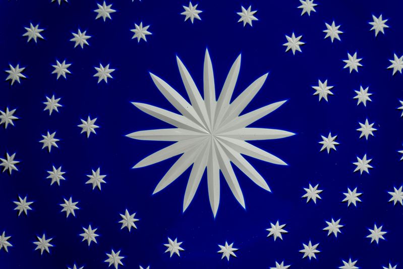 Sei bicchieri in cristallo policromo inciso a soggetti vari. Manifattura russa, metà secolo XX