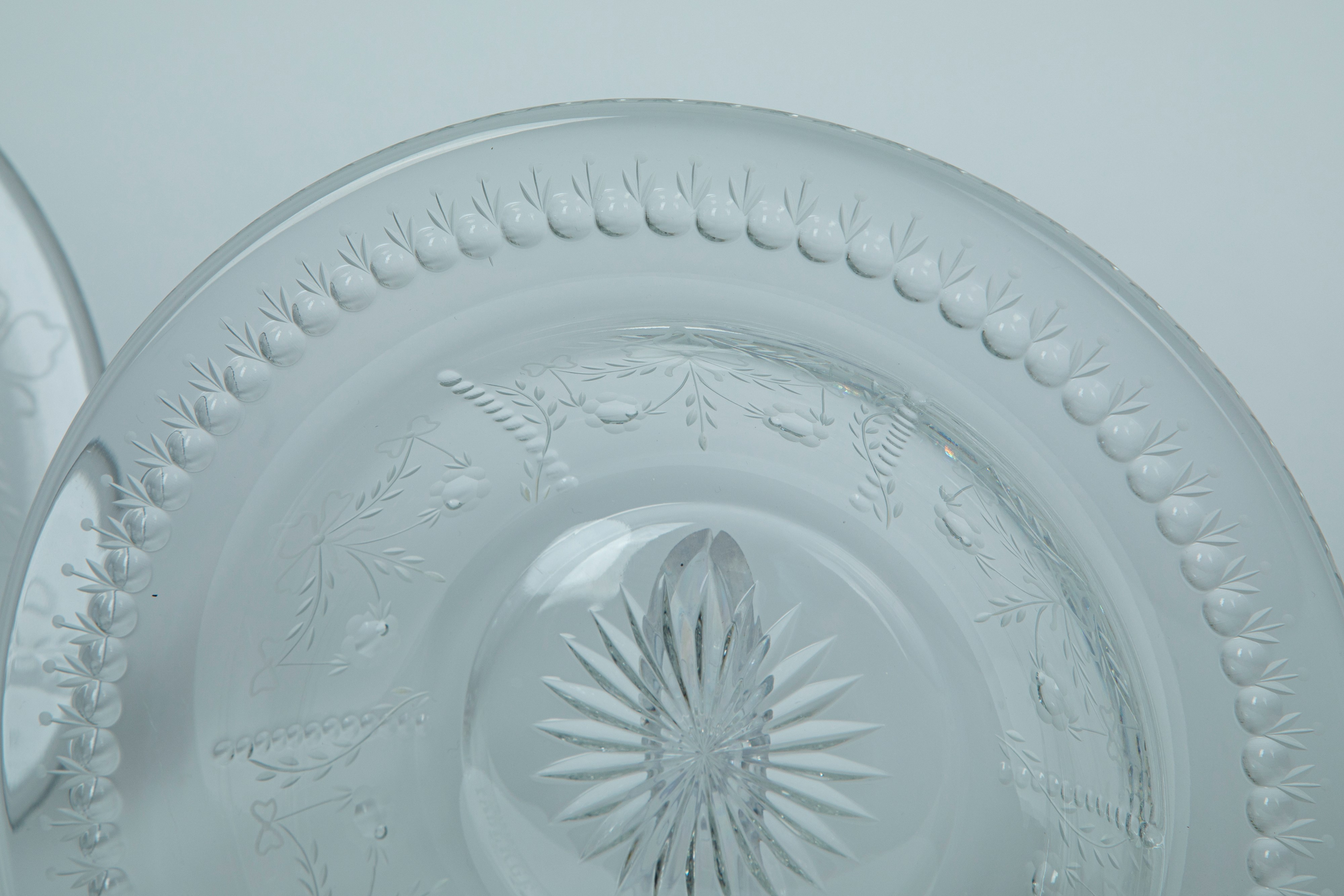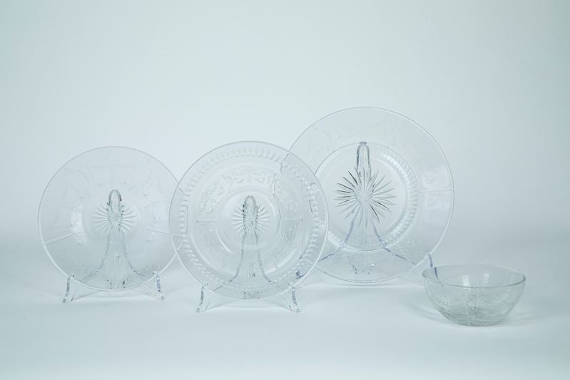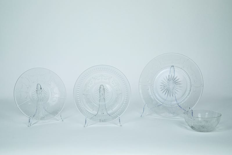 composto da nove piatti piani, nove piatti fondi, otto ciotoline con piattino decorato in gusto classico a nastri fiocchi e fiori