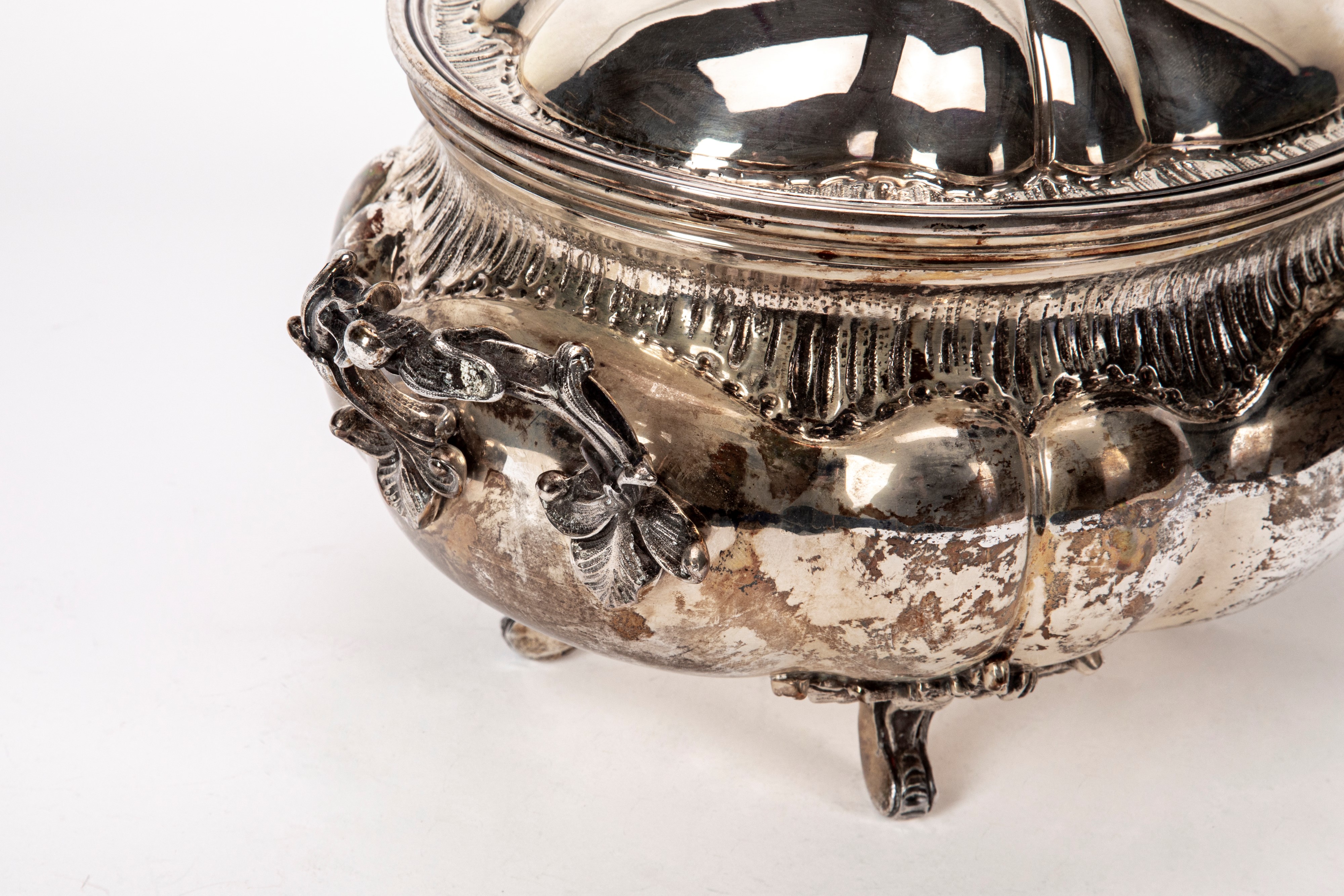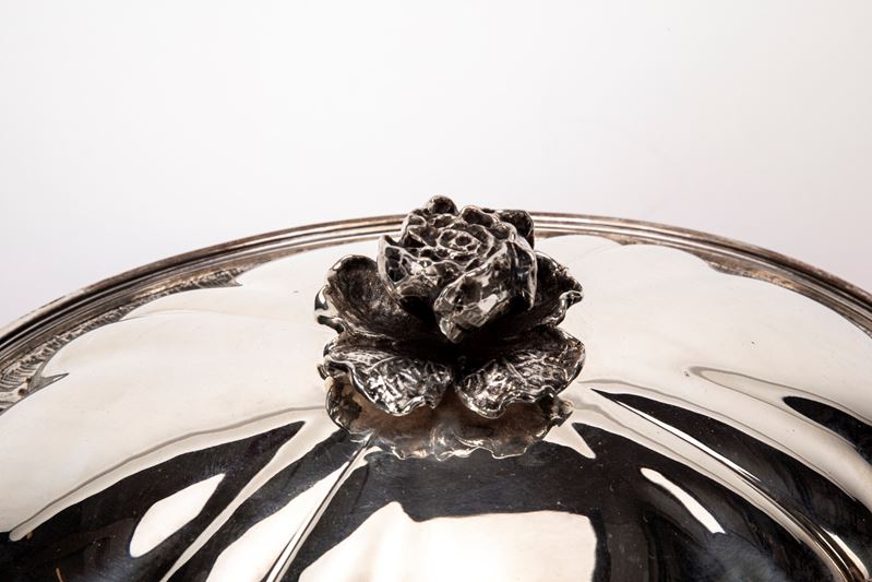 corpo bombato di forma ovoidale decorato con incisioni sulla fascia prese cesellate e pomolo del coperchio a fiore a tutto tondo, piedini a ricciolo.