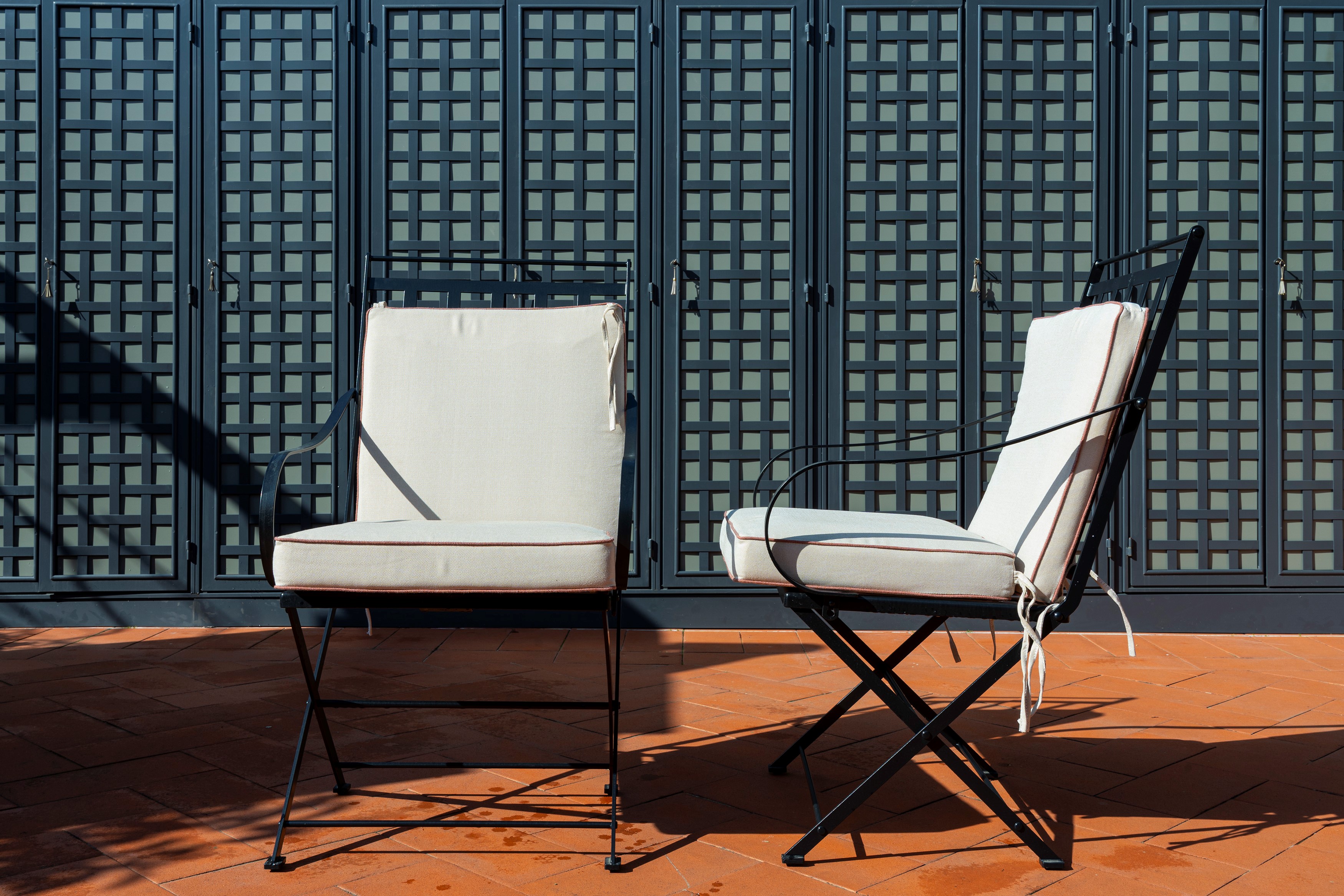 Quattro sedie in ferro battuto con cuscini da giardino o da interno