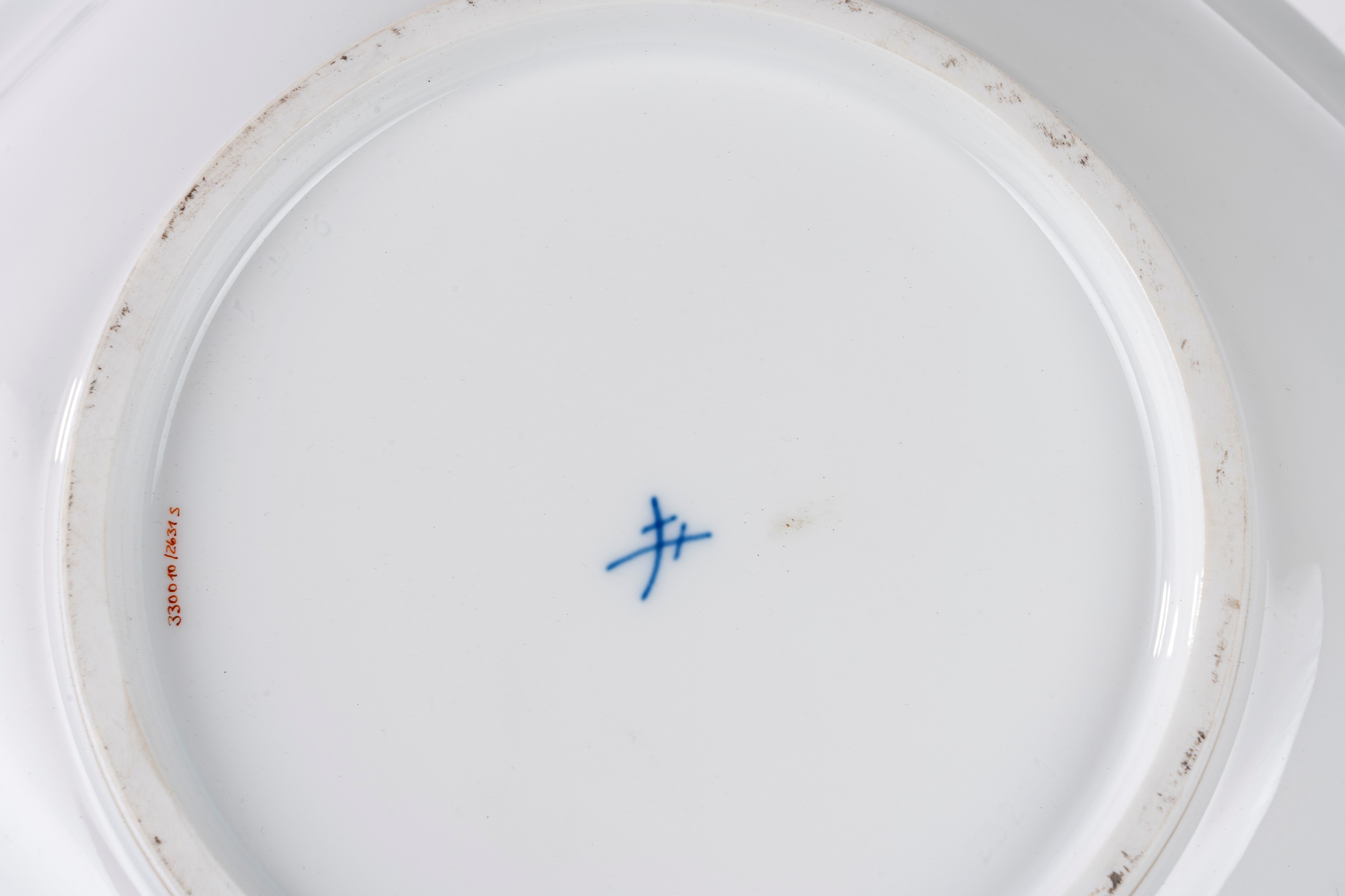 12 piatti piani (diametro cm 28), 12 piatti fondi (diametro cm 23), 11 piatti da dolce (diametro cm 22), un'insalatiera, un piatto da portata tondo, un piatto da portata ovale, una salsiera