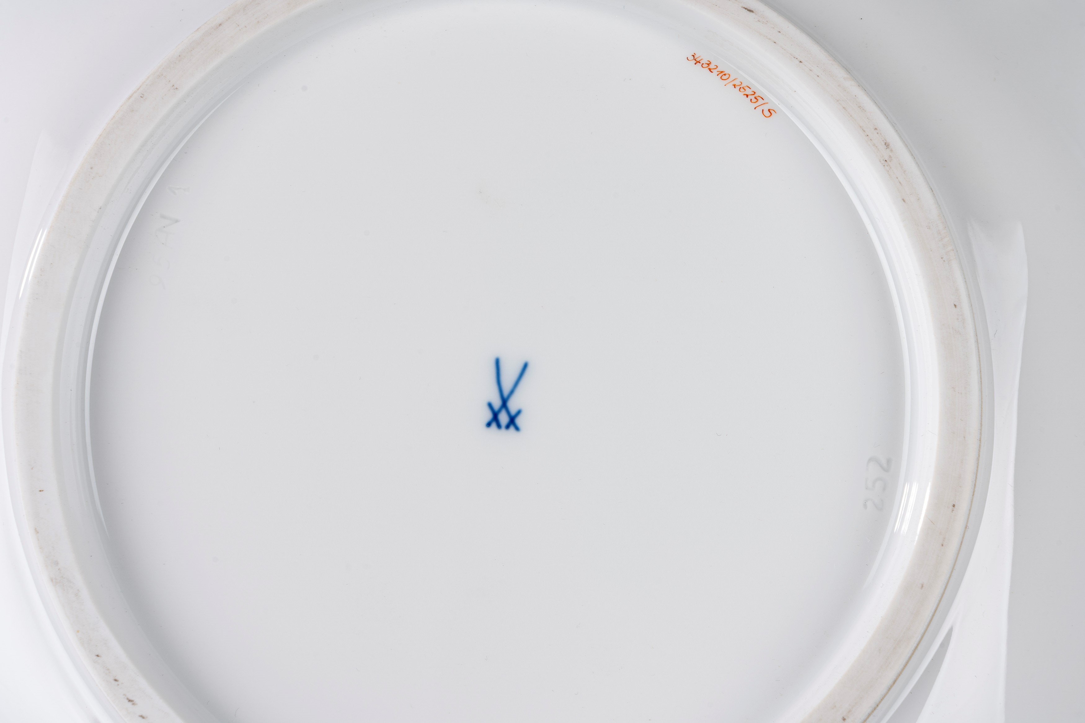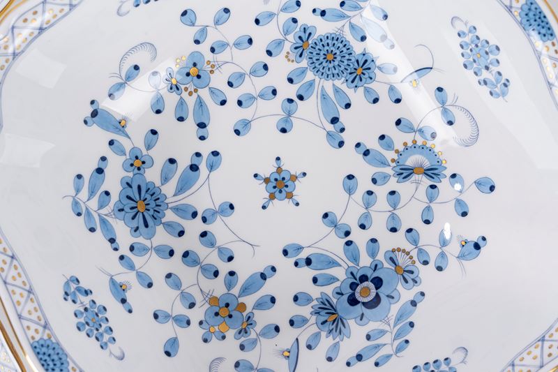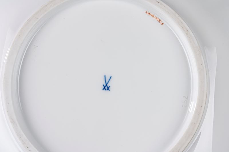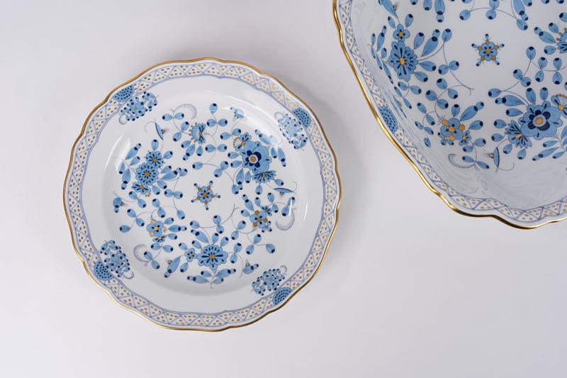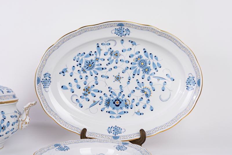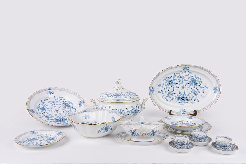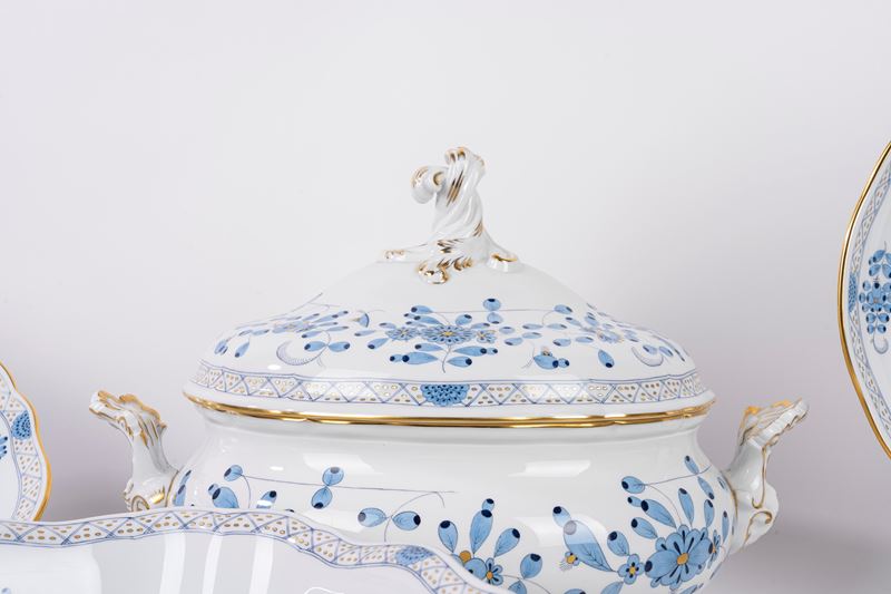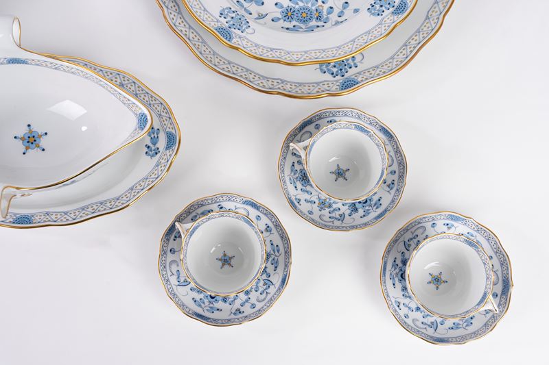 12 piatti piani (diametro cm 28), 12 piatti fondi (diametro cm 22), 12 piatti da frutta (diametro cm 22,5), 12 tazzine da caffè con piattino (altezza tazzina cm 5 e diametro piattino cm 11), una salsiera, un piatto da portata tondo, un piatto da portata ovale, un'insalatiera e una zuppiera con coperchio