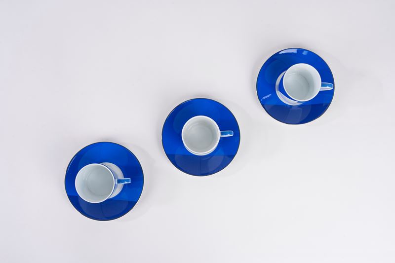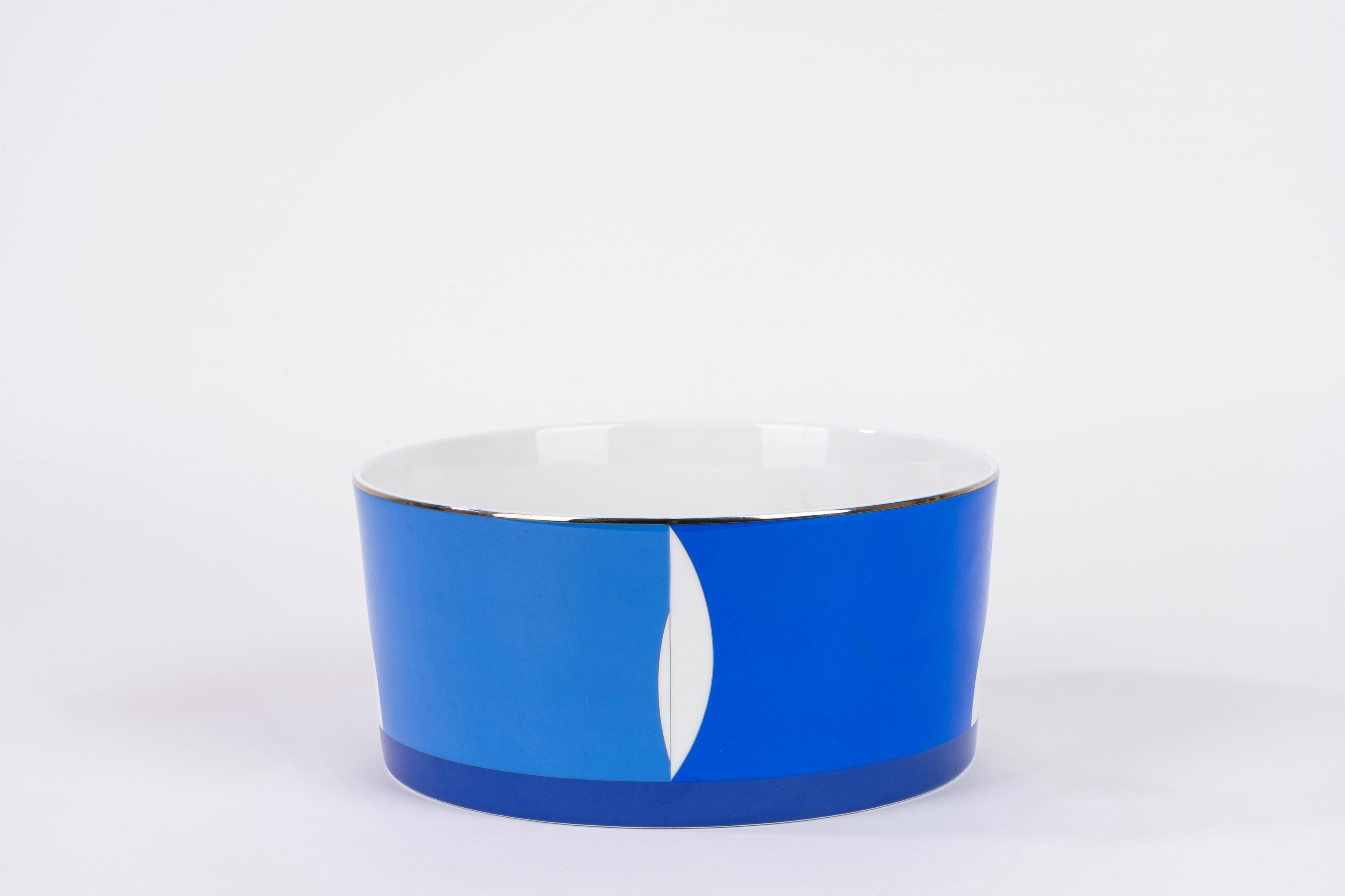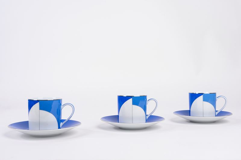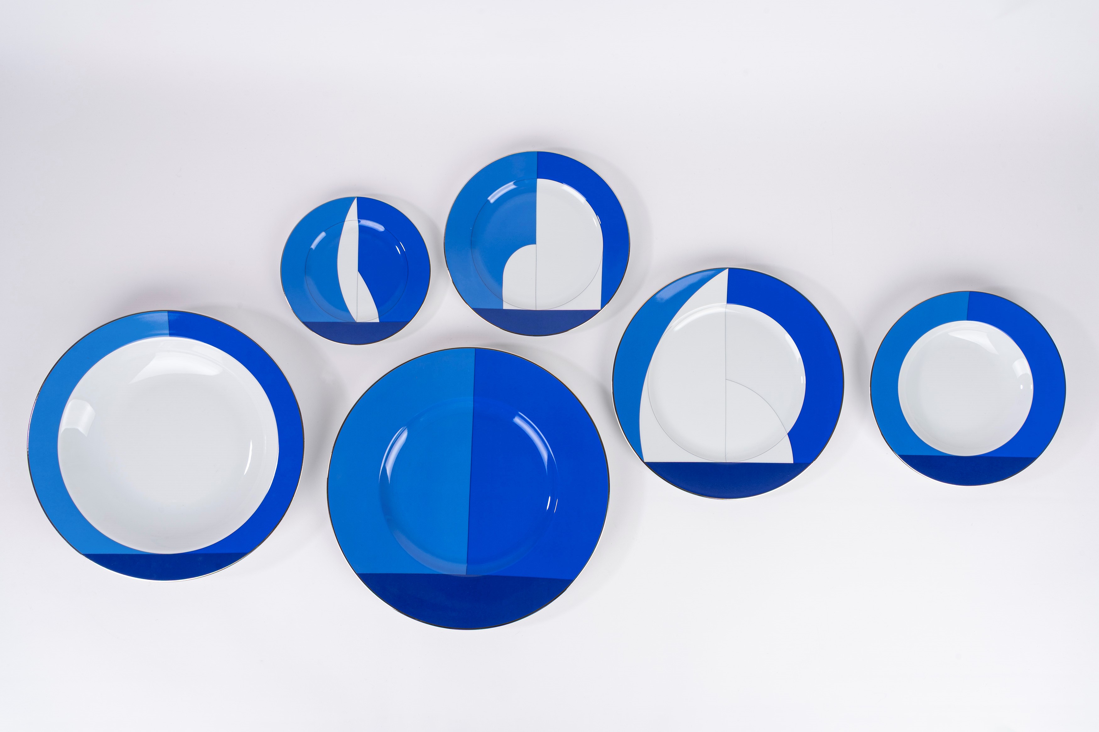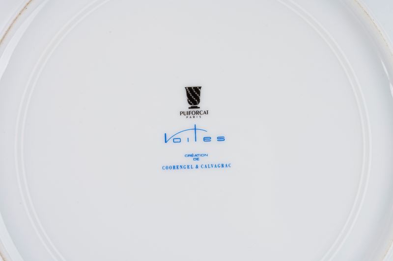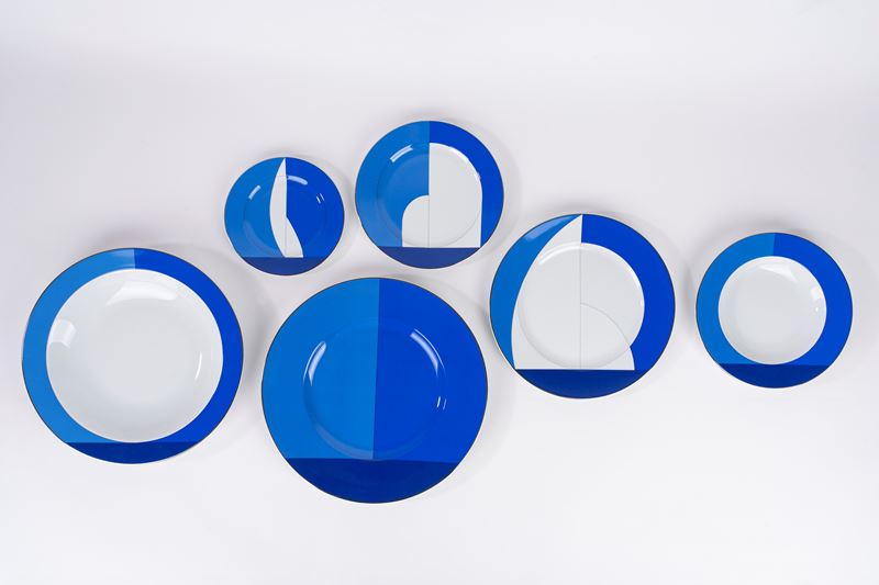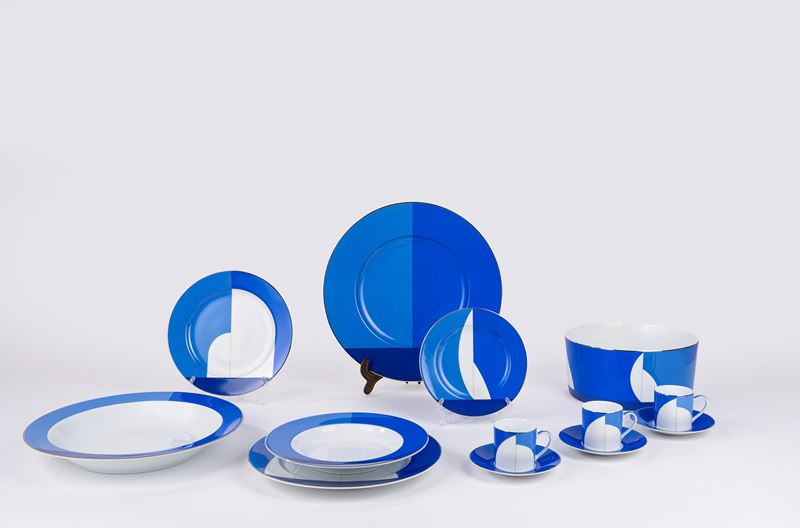 8 sottopiatti (diametro cm 32), 8 piatti piani (diametro cm 26,5), 8 piatti fondi (diametro cm 22,5), 8 piattini da dessert (diametro cm 21), 8 piattini da pane (diametro cm 17), 8 tazzine da caffè con piattino (altezza tazzina cm 5,6; diametro piattino cm 12), un'insalatiera, un piatto da portata tondo.