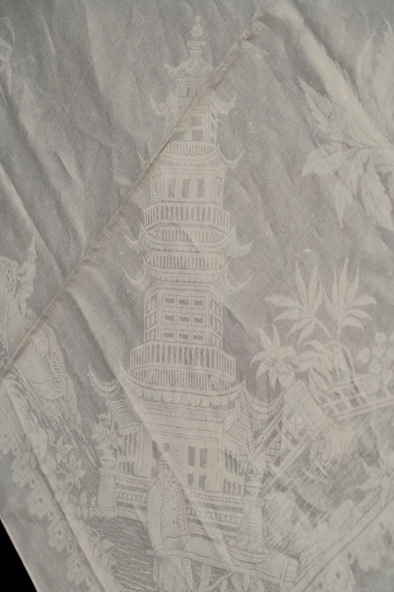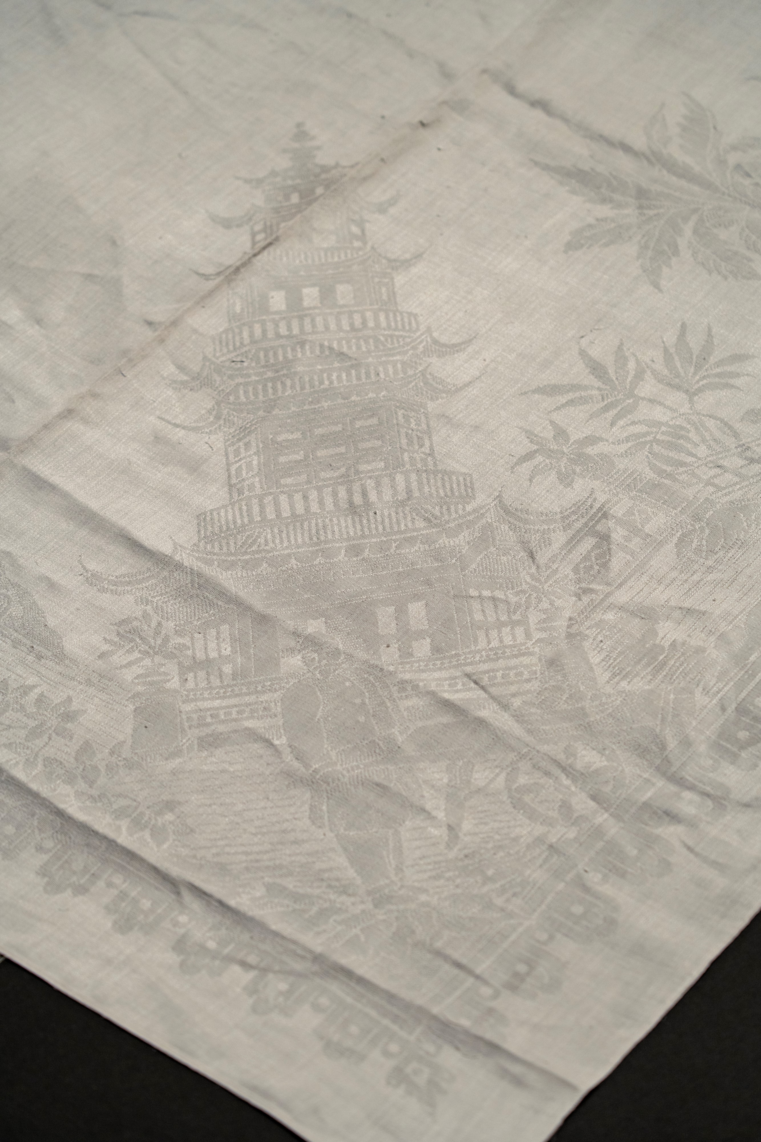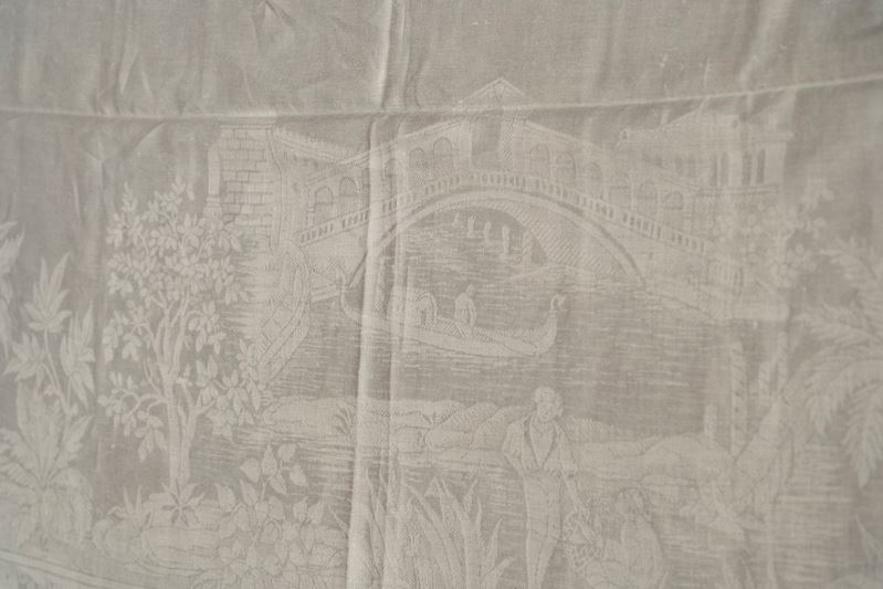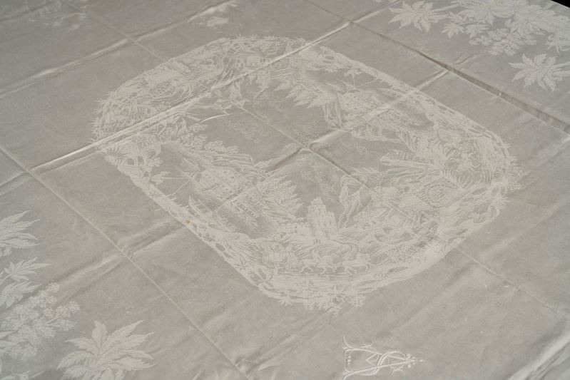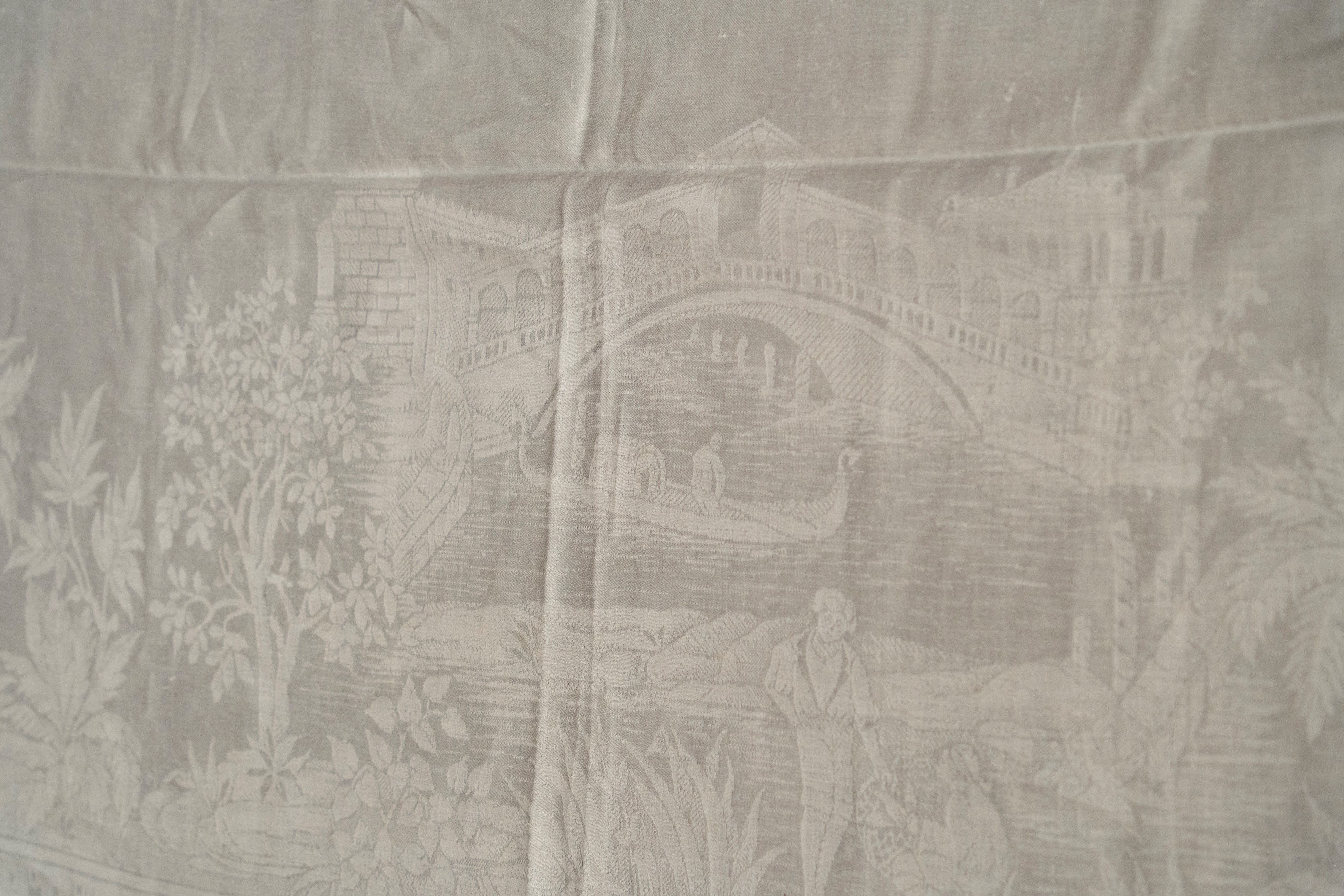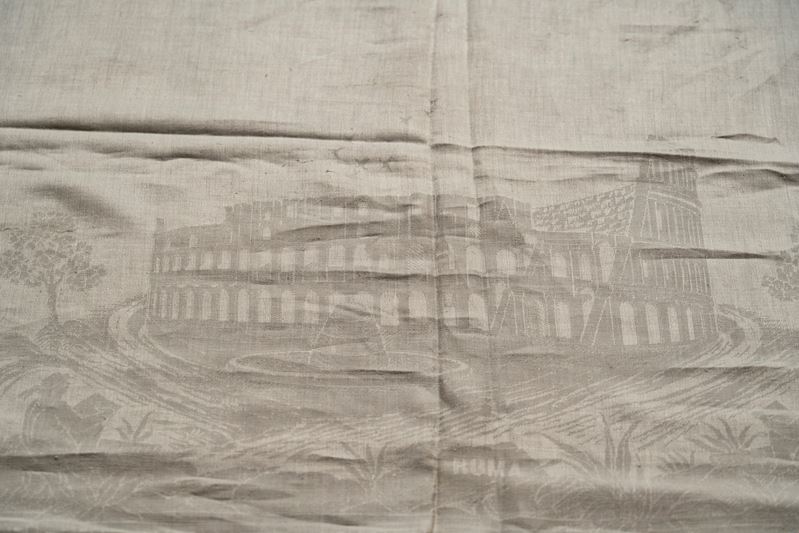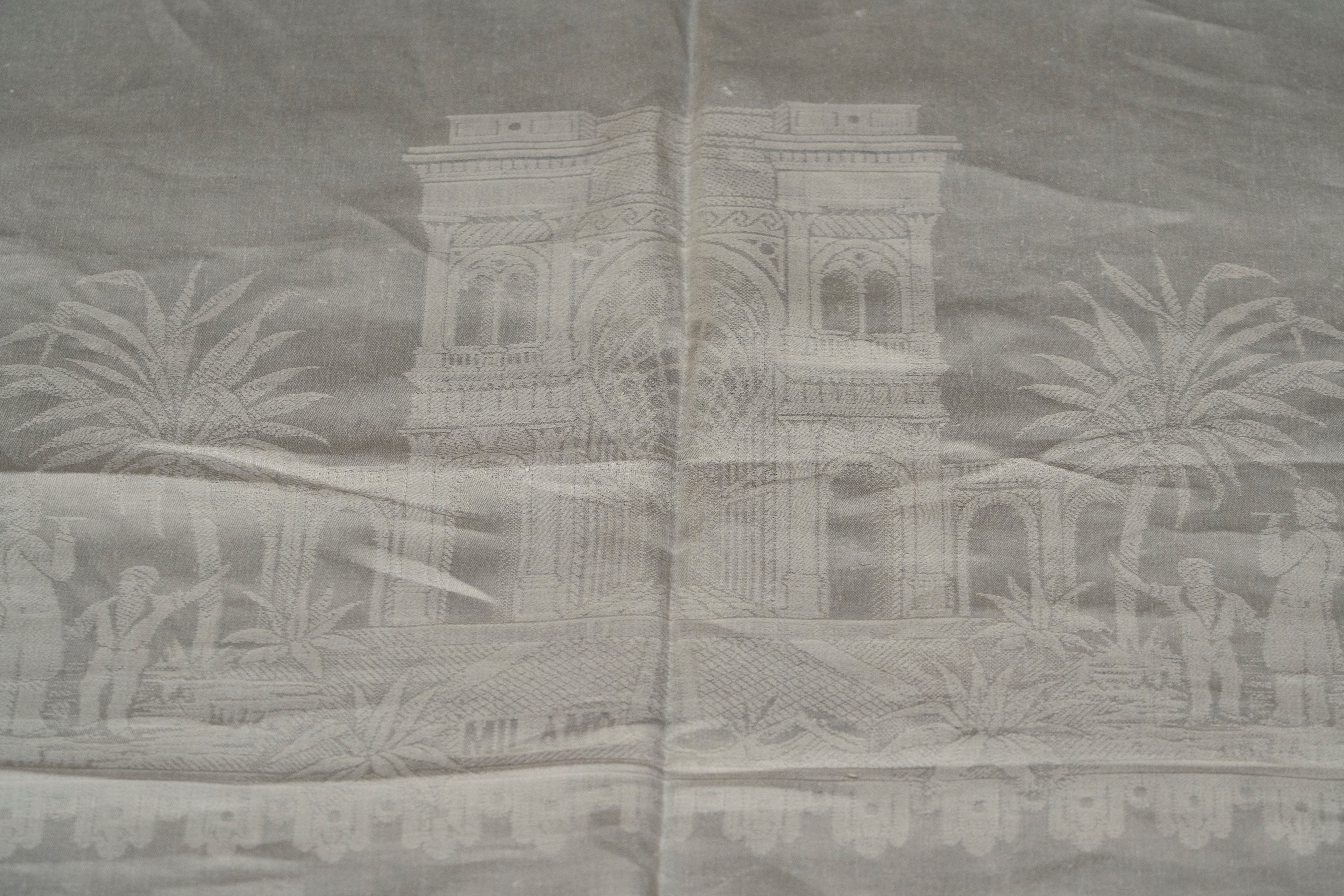 Importante tovaglia in lino decorata con vedute di Roma, Venezia e Milano tra pagode angolari lungo il bordo