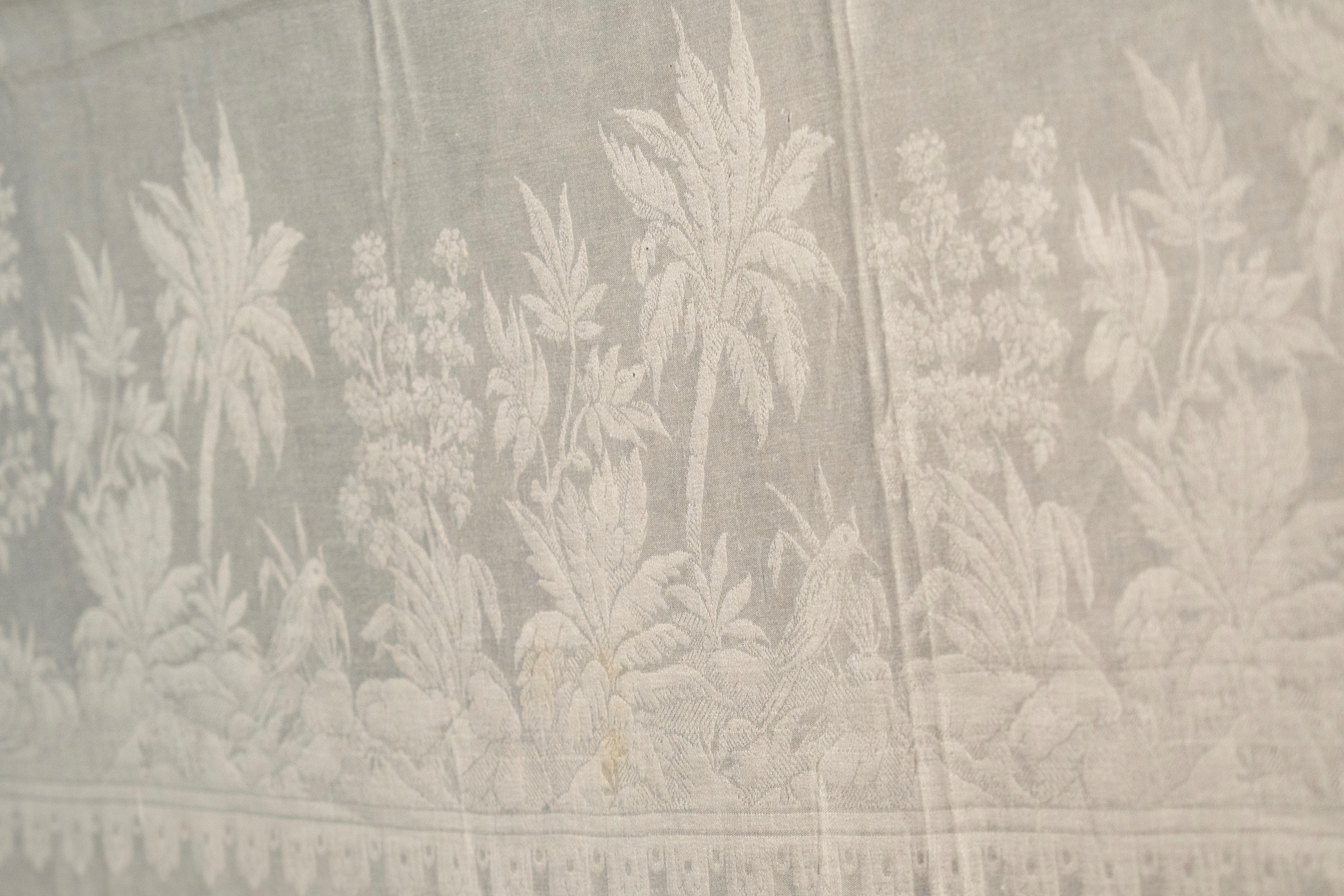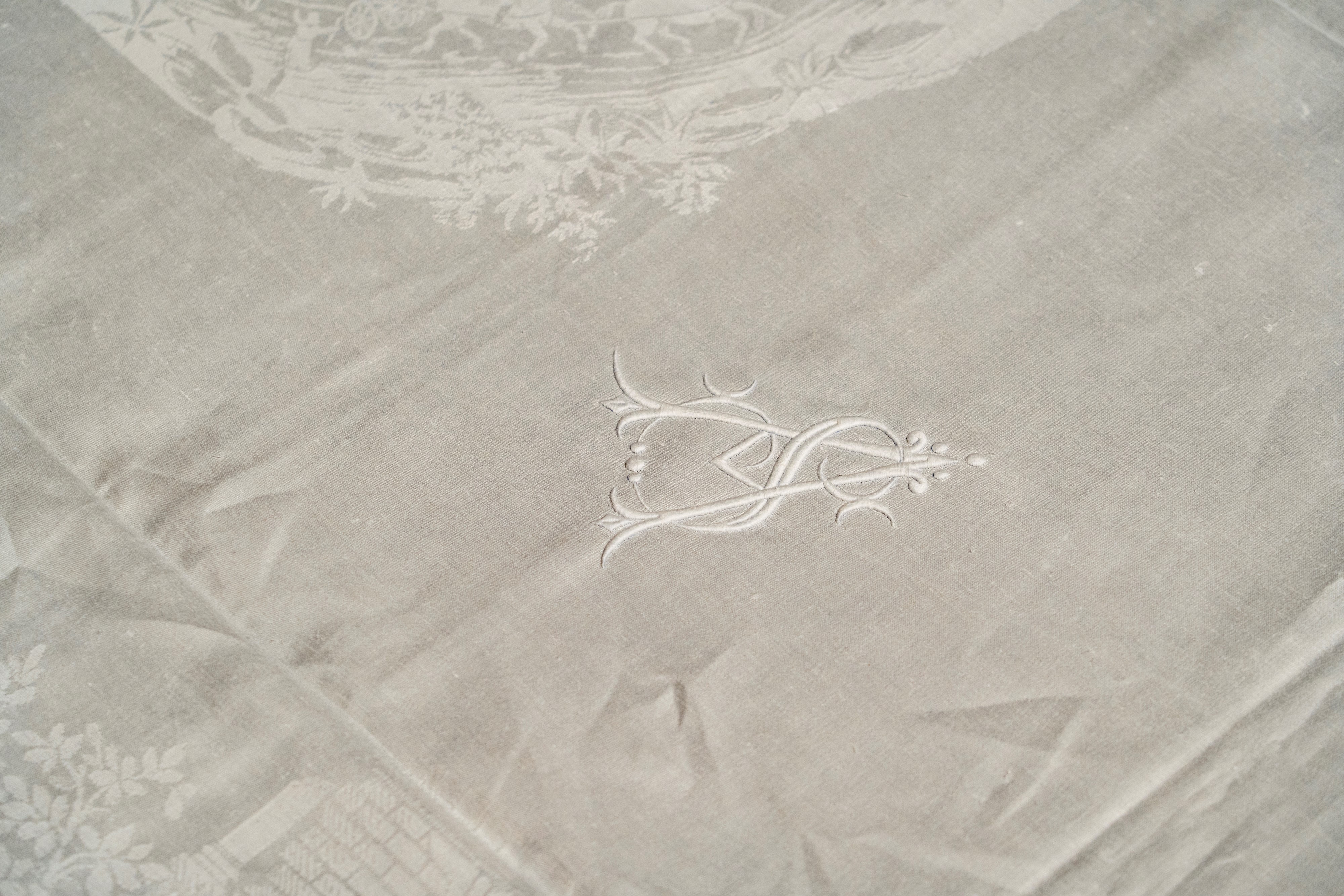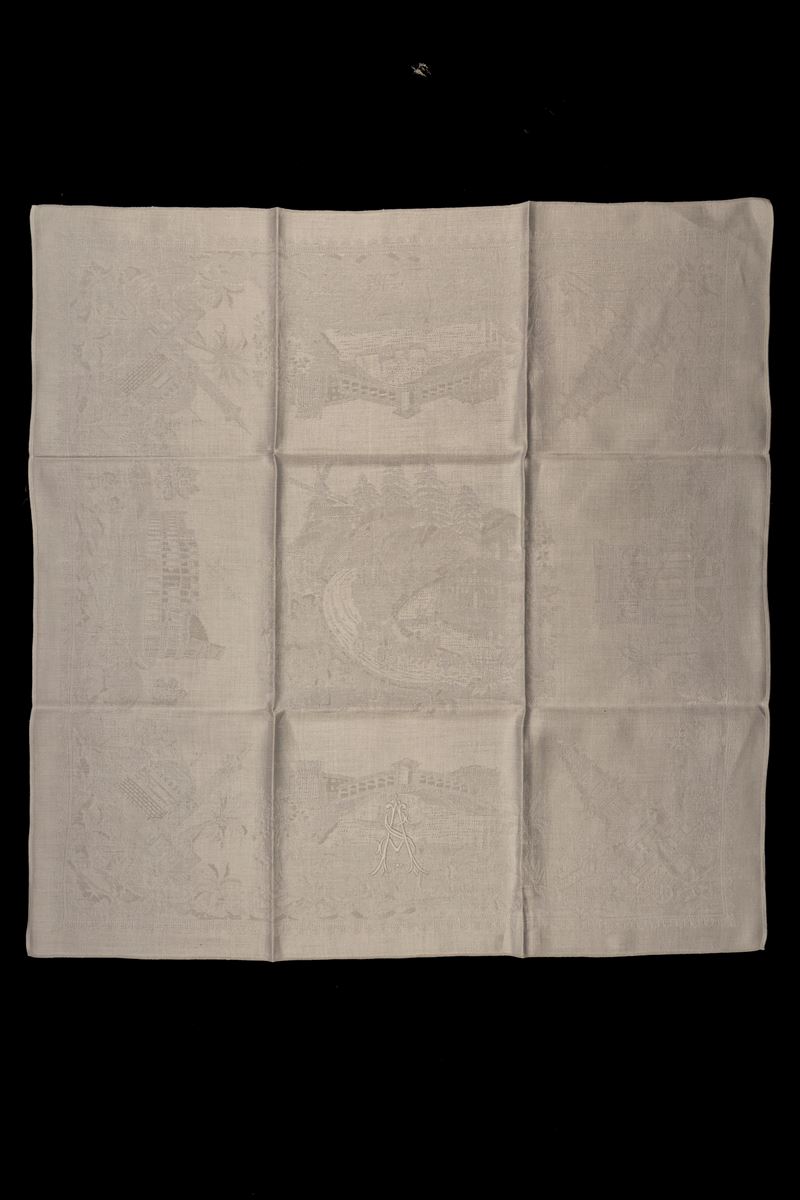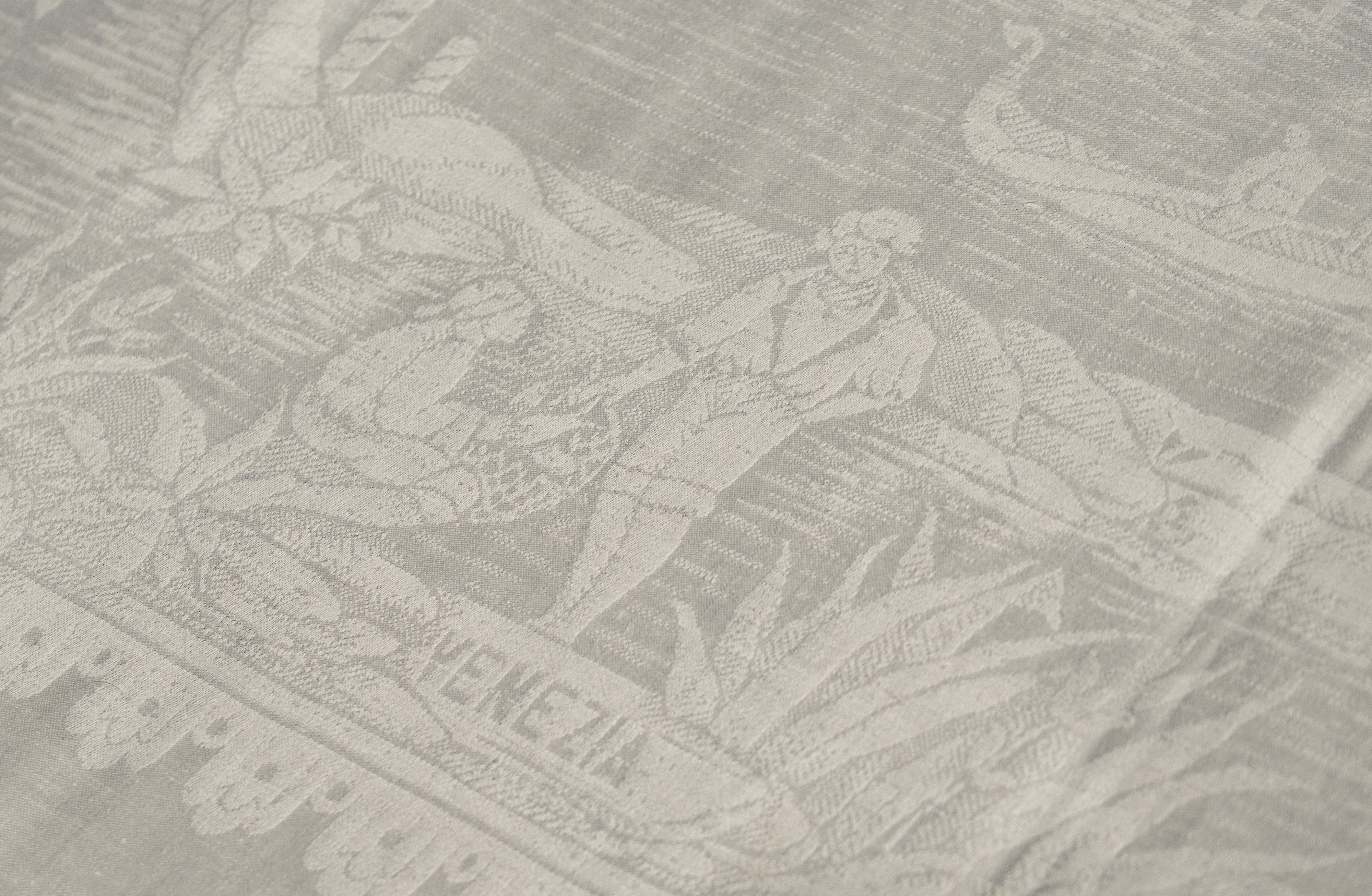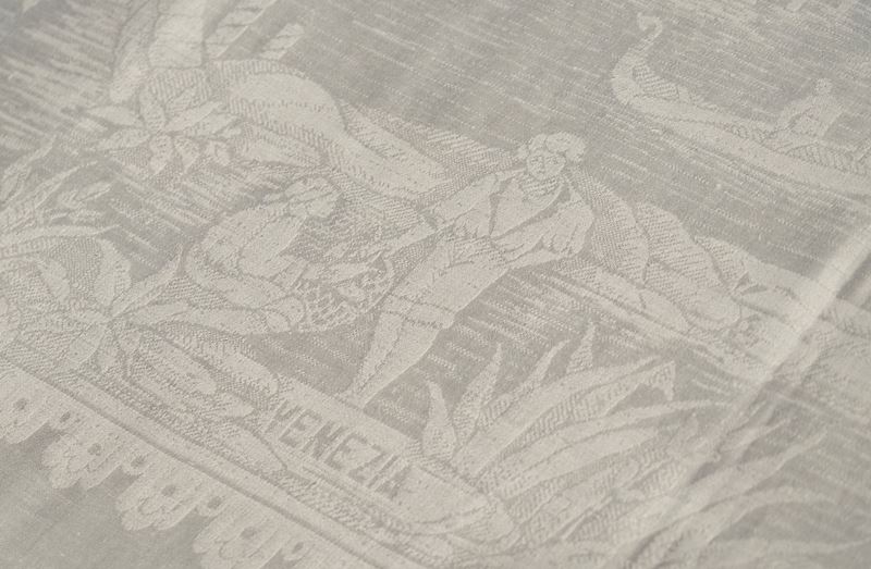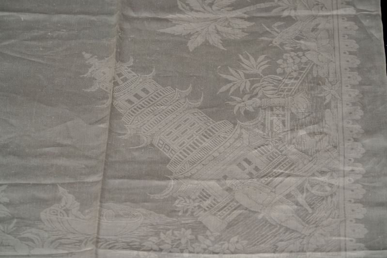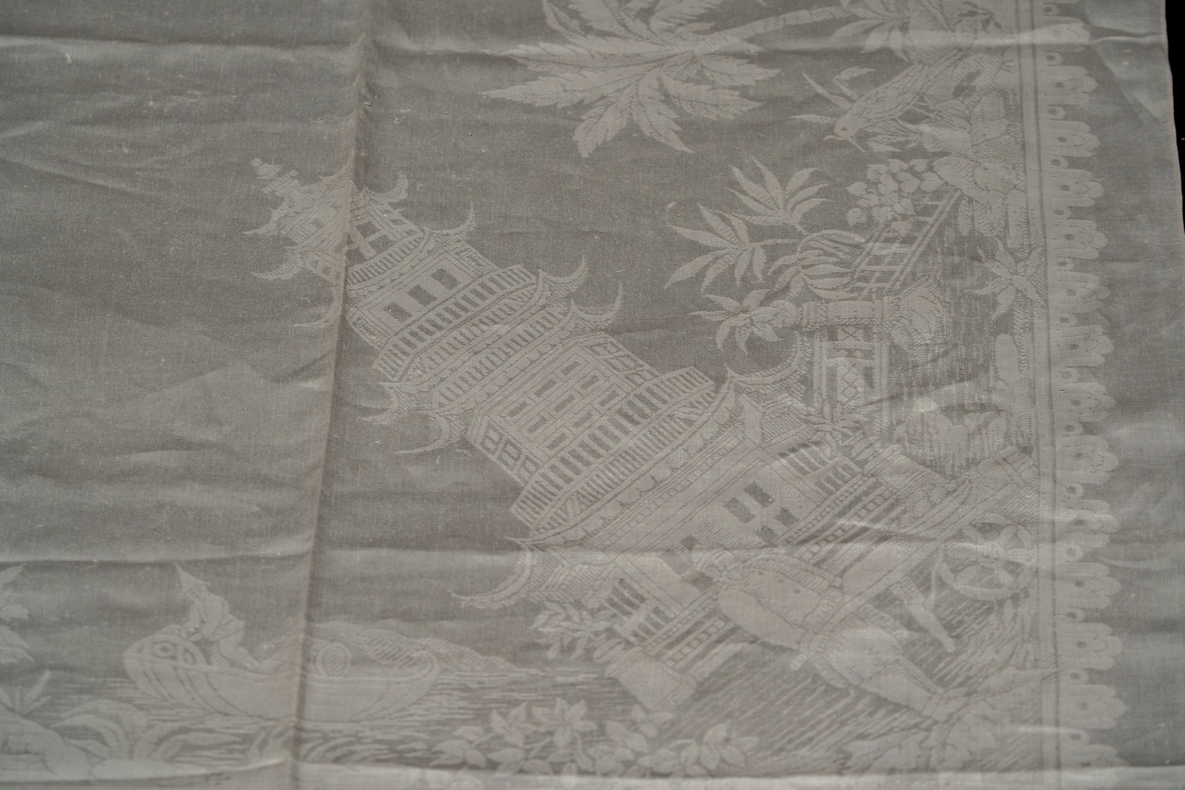 Importante tovaglia in lino decorata con vedute di Roma, Venezia e Milano tra pagode angolari lungo il bordo