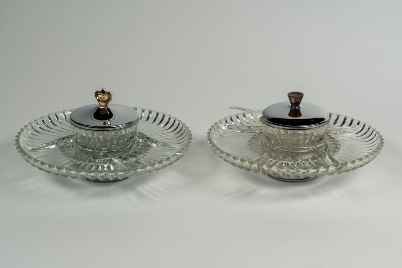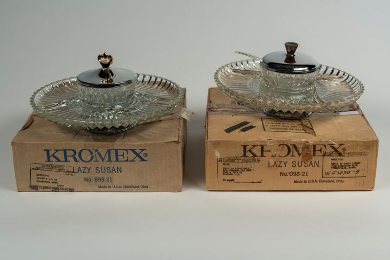 Kromex Lazy Susan coppia di vassoi girevoli in metallo cromato e vetro per antipasti, Manifattura statunitense, Anni 60