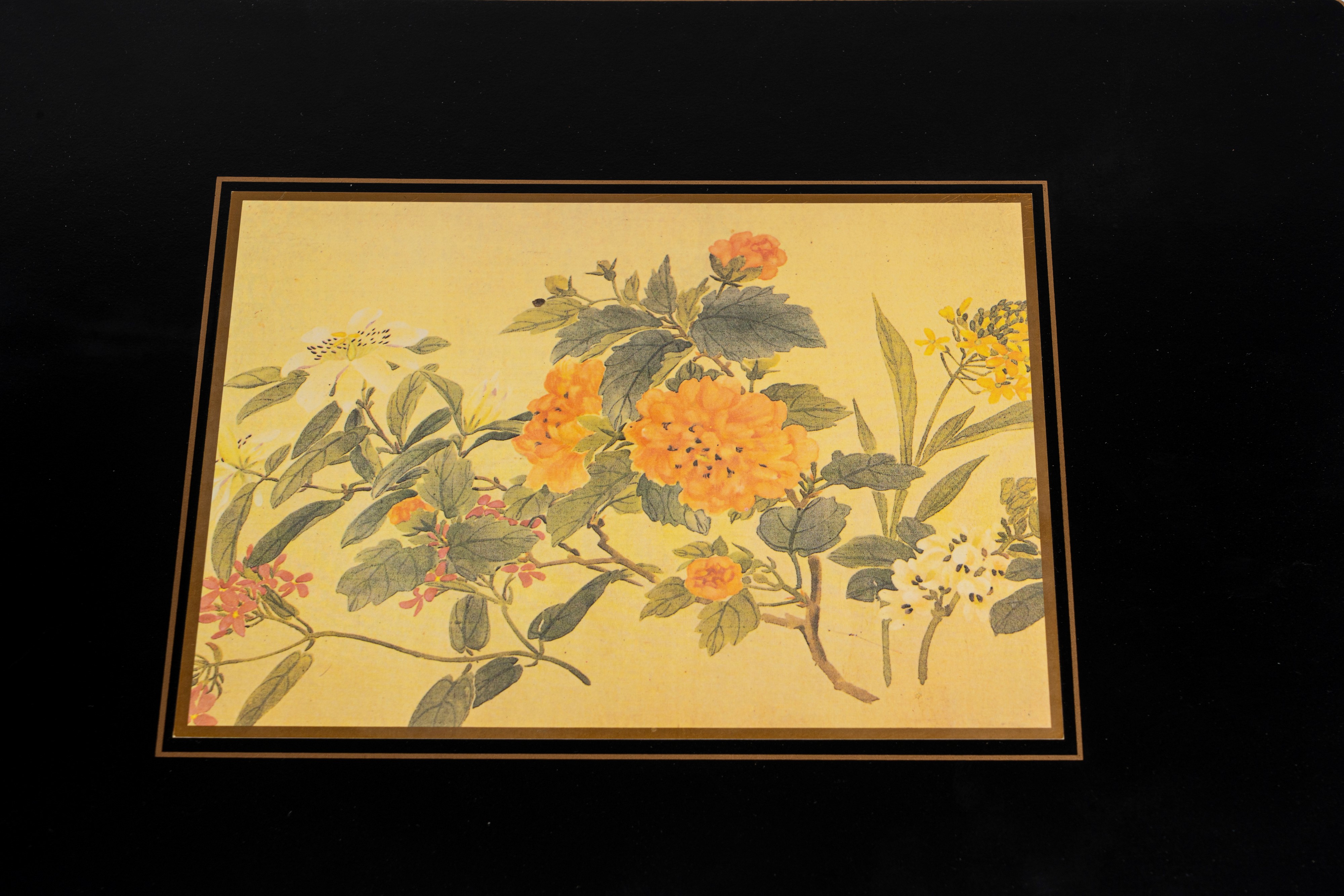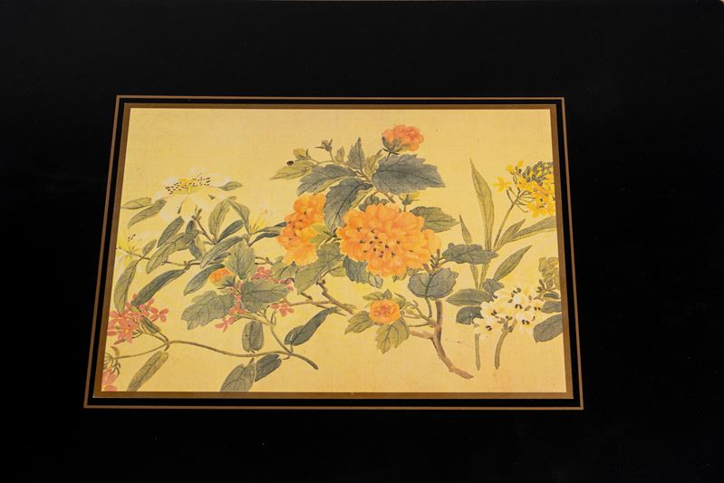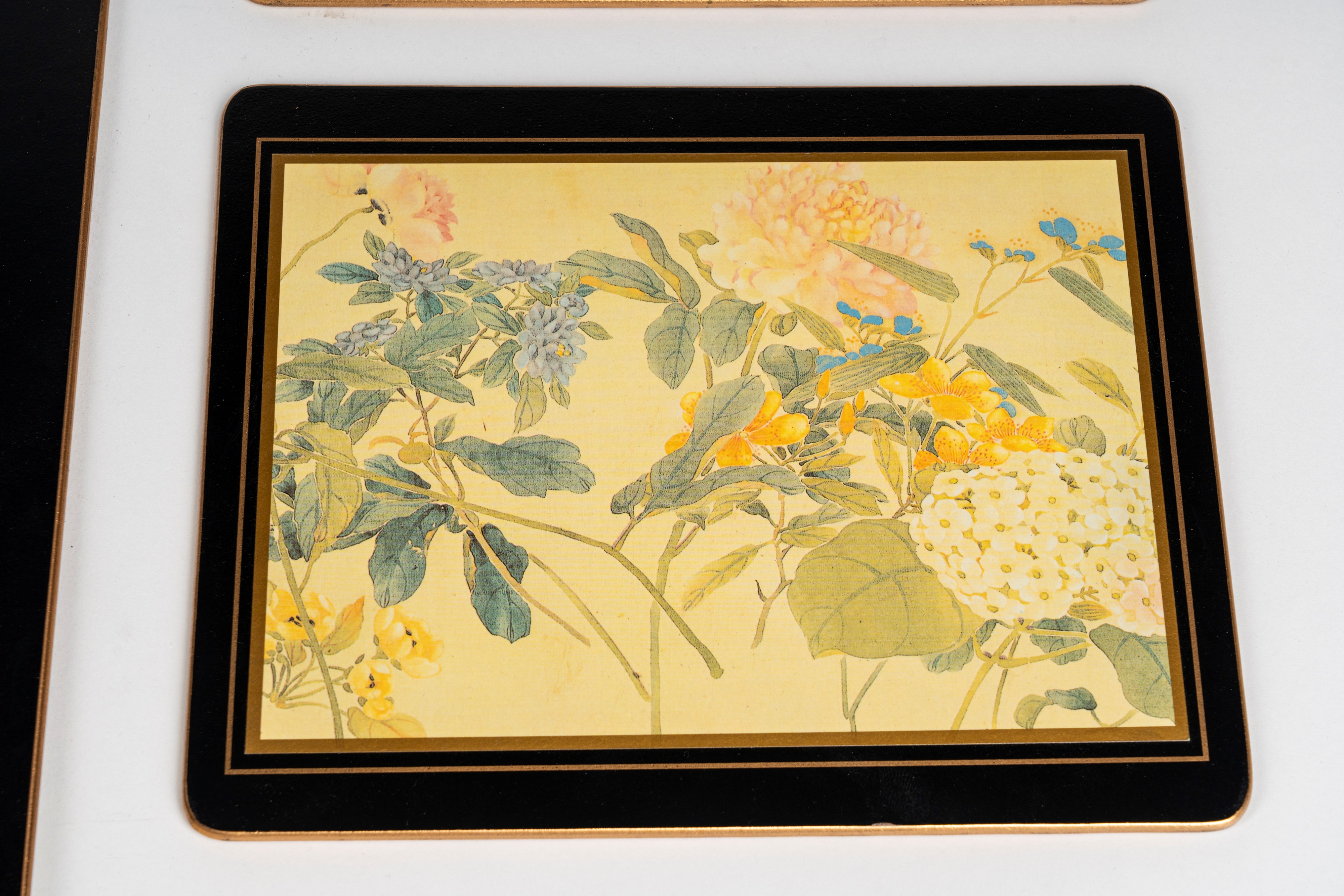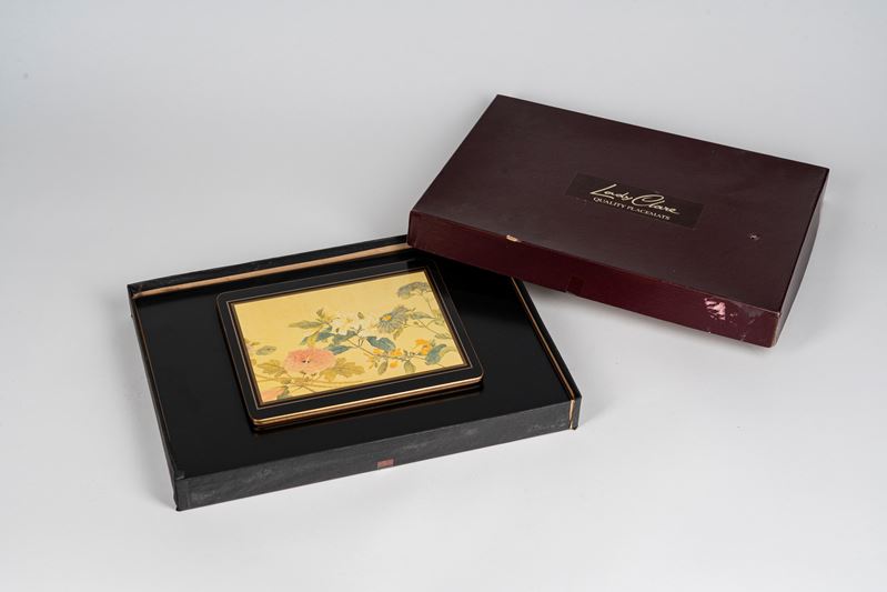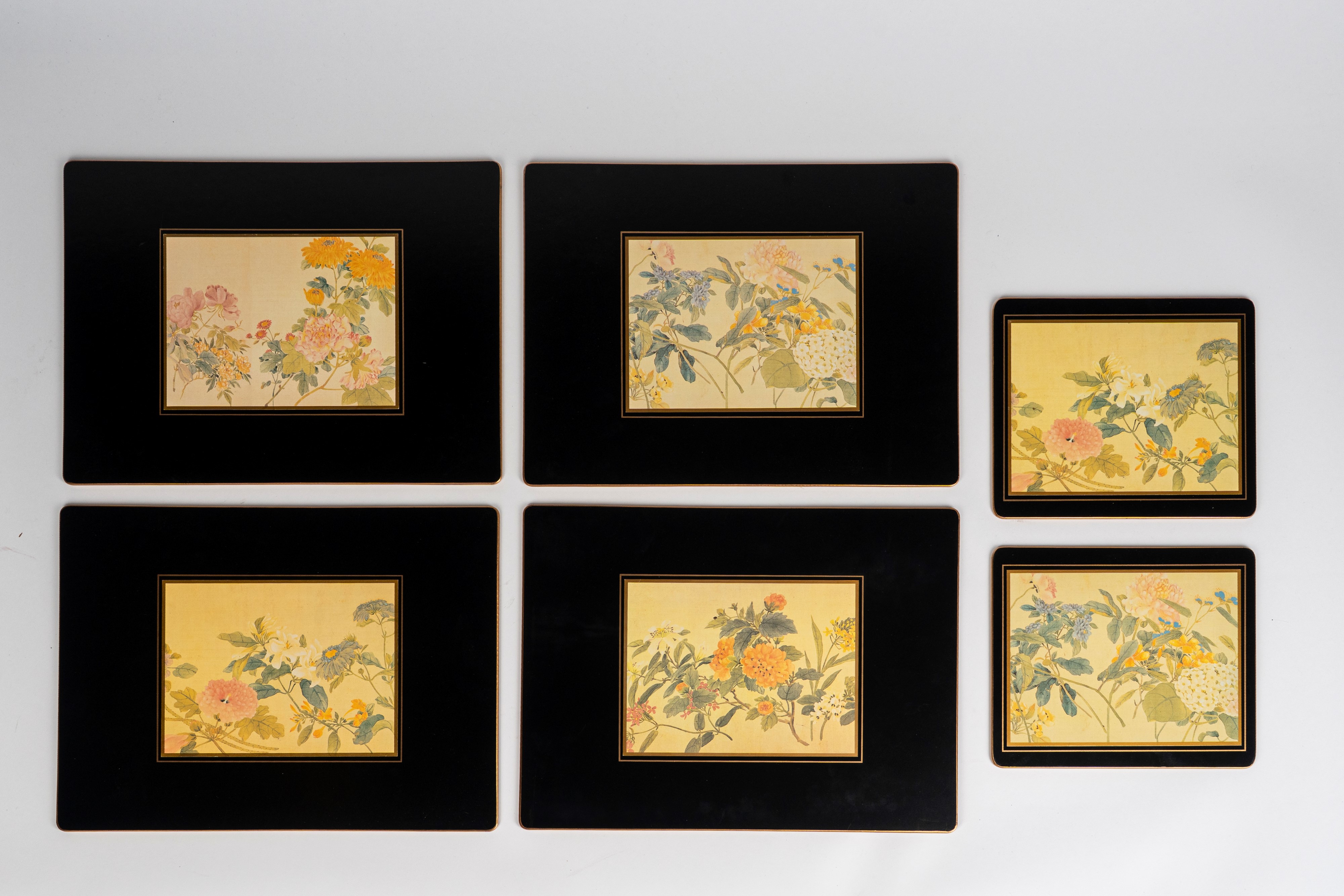 composto da 4 tovagliette all'americana e 2 sottopiatti con decorazione floreale policroma su fondo avorio entro conrice nera con filetto dorato.