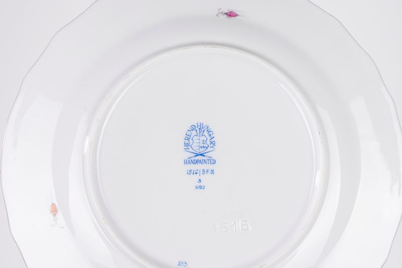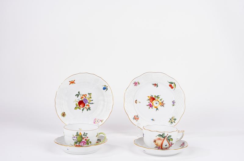 Lotto composto da due differenti tazze da te con piattino e piatto da dolce, in porcellana decorata a frutti. Herend, Hungary