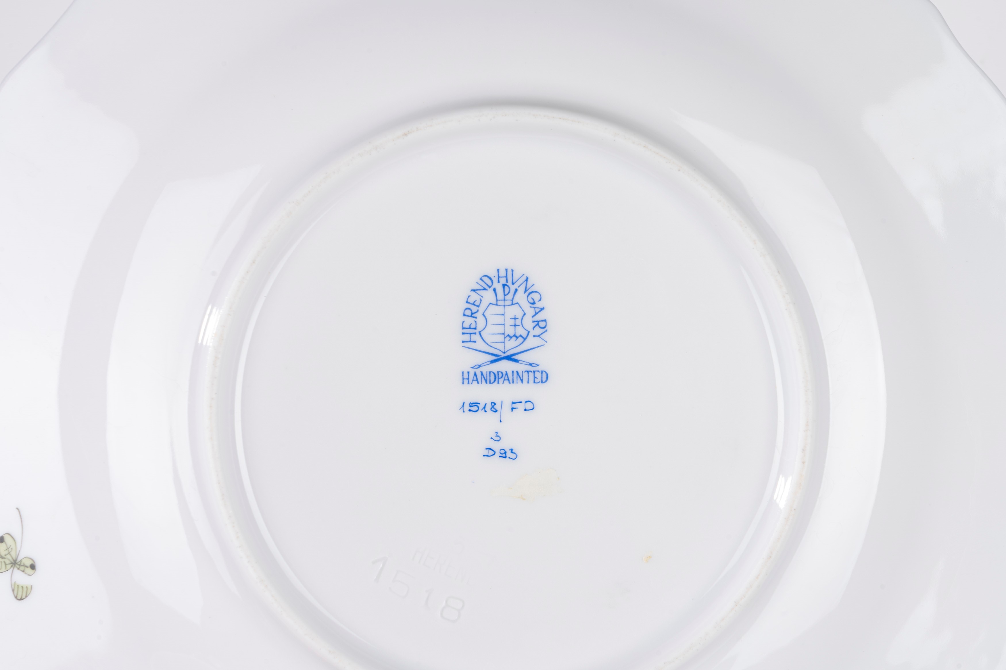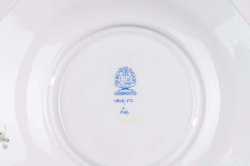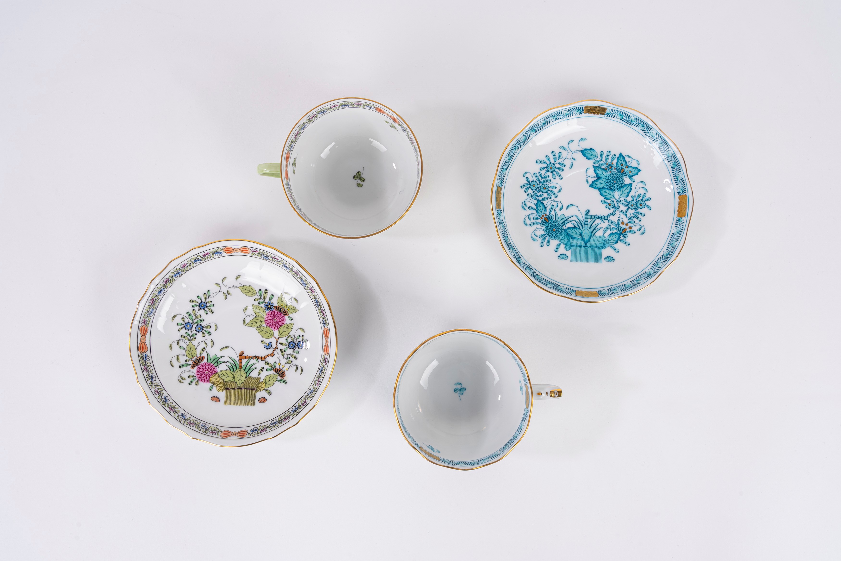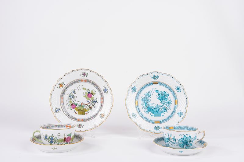 Lotto composto da due differenti tazze da te con piattino e piatto da dolce, in porcellana decorata in policromia, Herend