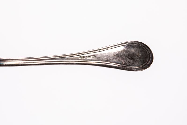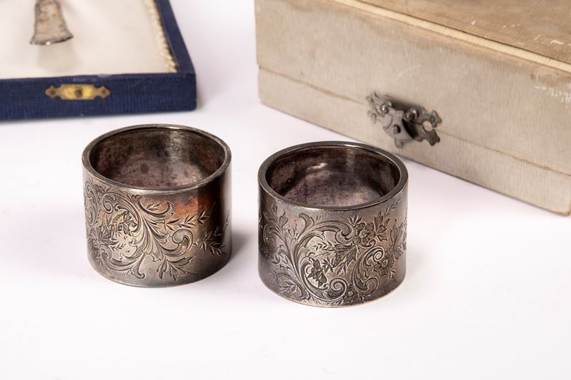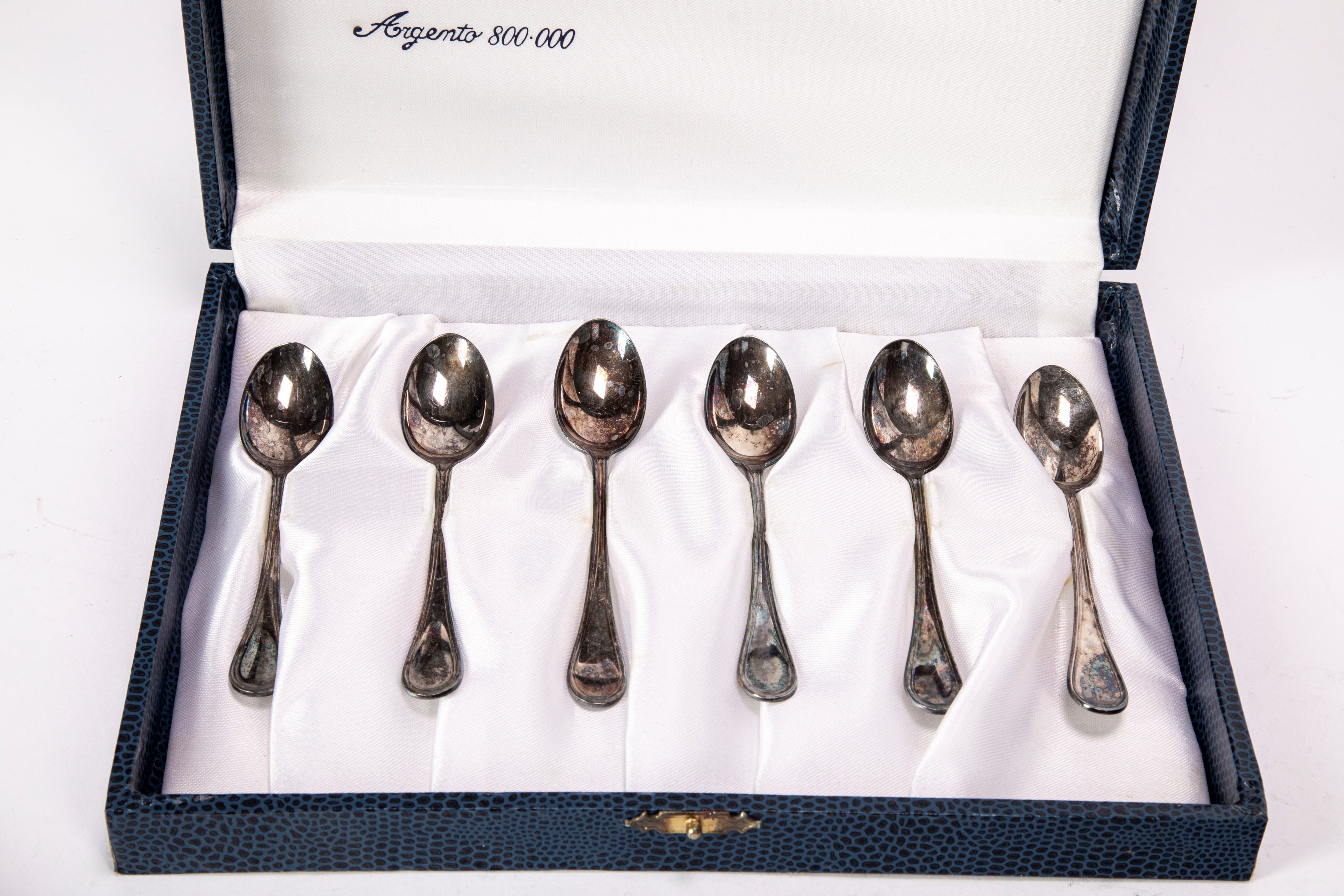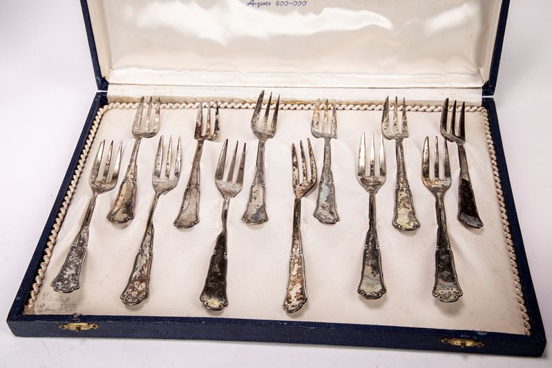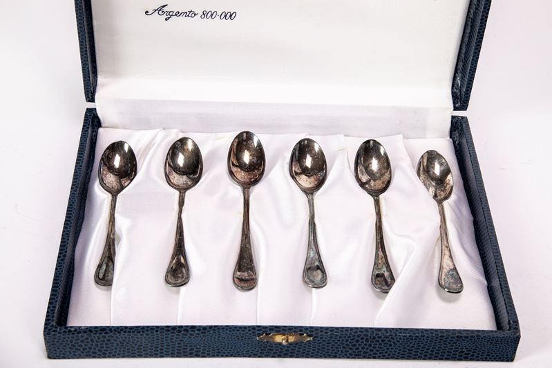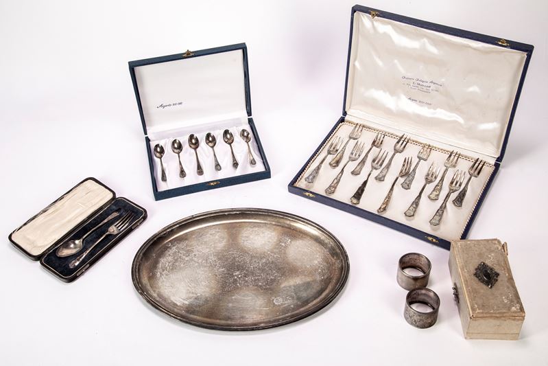 composto da 4 set: uno di sei cucchiaini, uno di dodici forchettine, uno con cucchiaio e forchetta da dolce e uno di due porta tovaglioli con custodie originali; uniti ad un vassoio ovale. Epoca e decori diversi.