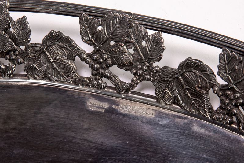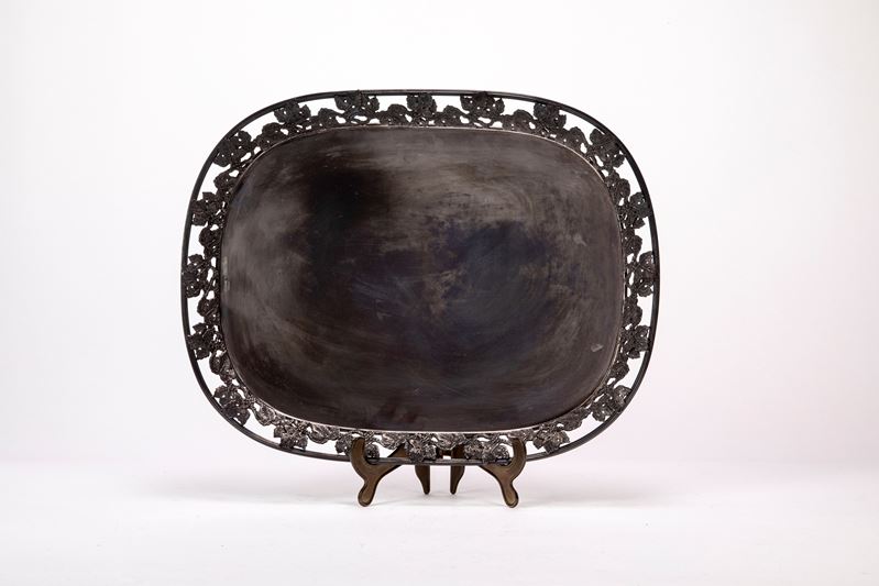 di forma rettangolare ad angoli arrotondati con bordi riccamente traforati, cesellati e incisi a tralci di vite con uva.