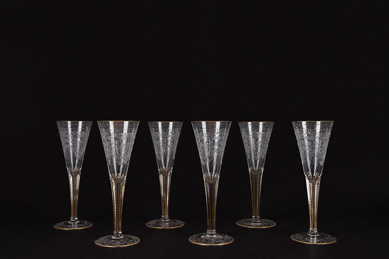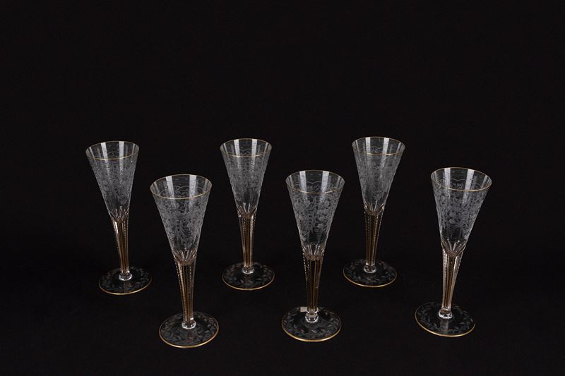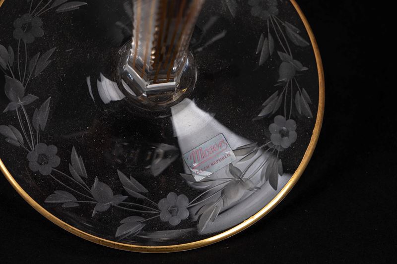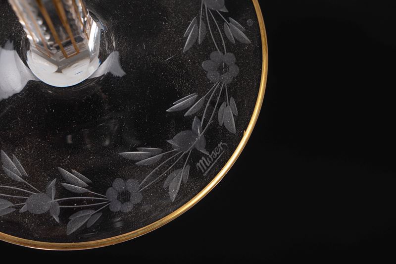in cristallo inciso a motivi floreali con bordi in oro