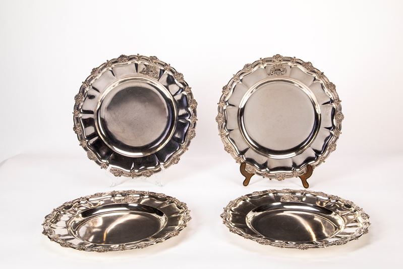 di forma tonda sagomata con bordo cesellato a fiori e valve di conchiglie stilizzate, sulla fascia stemma araldico in rilievo.