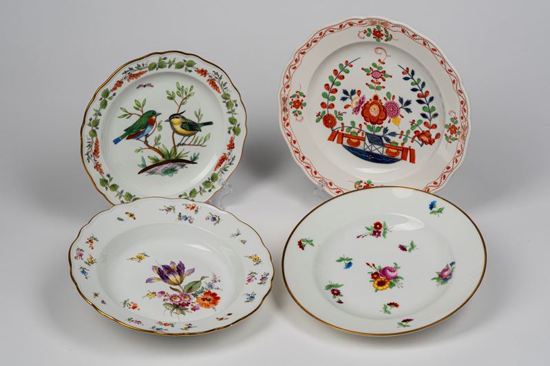 Quattro piatti in porcellana policroma. Manifatture differenti, Meissen e Ginori, fine secolo XIX