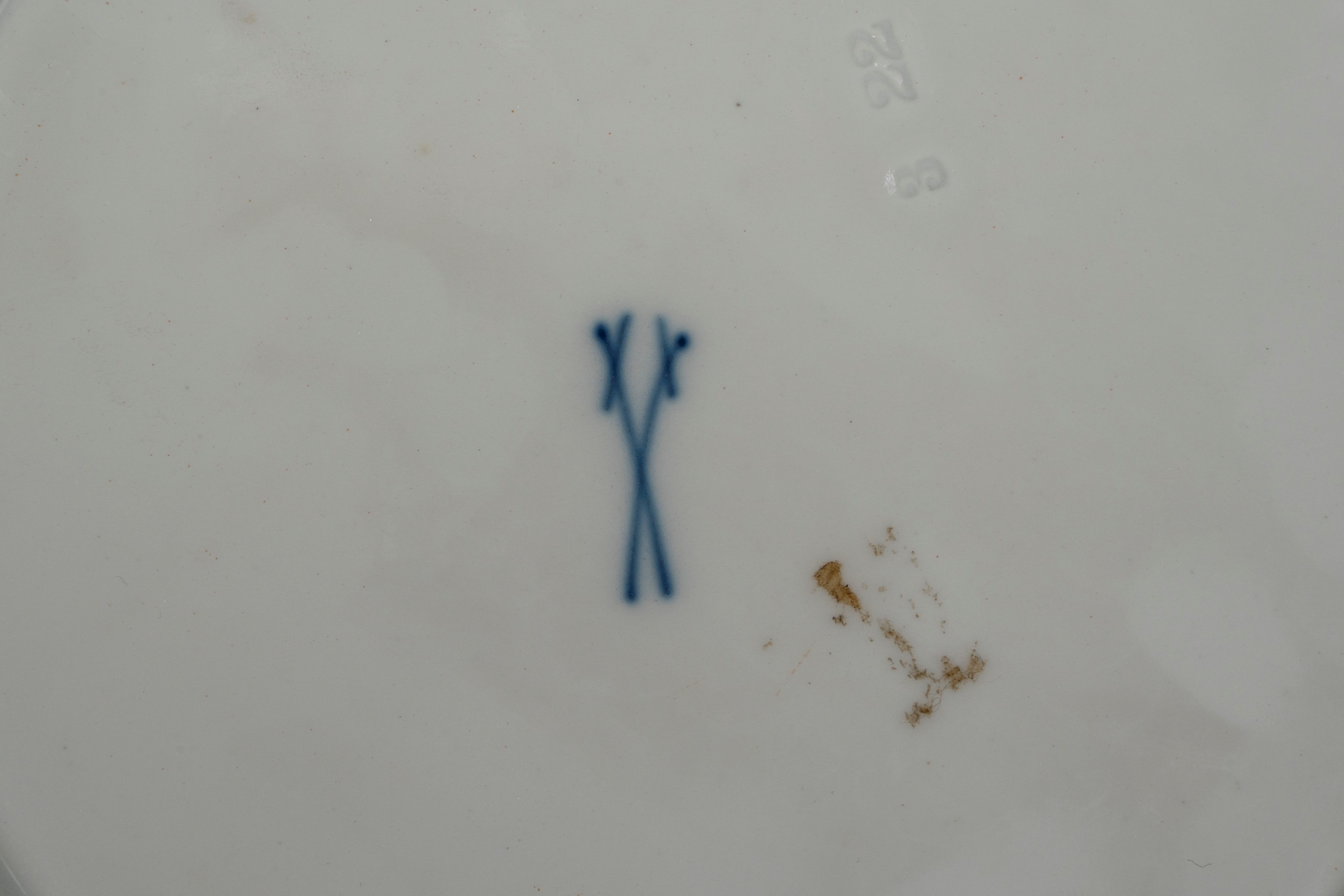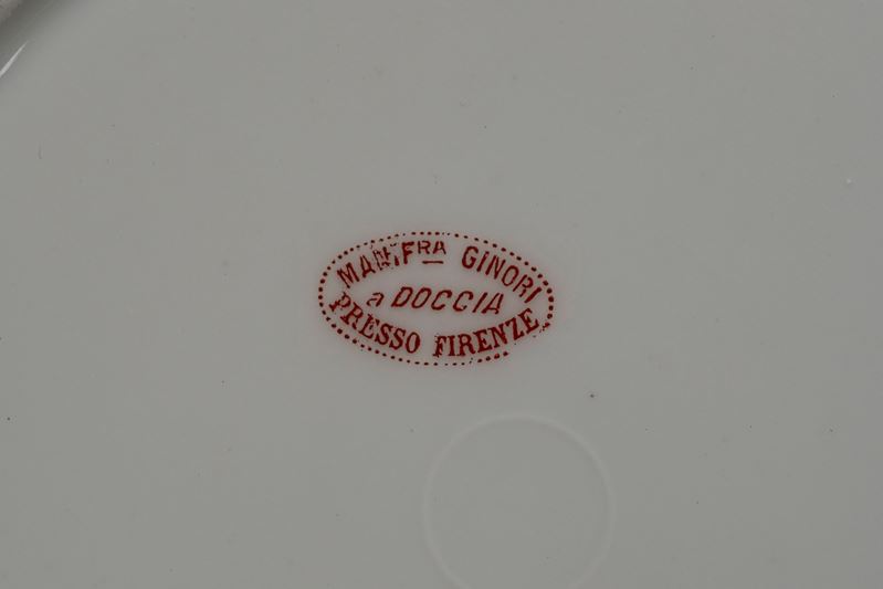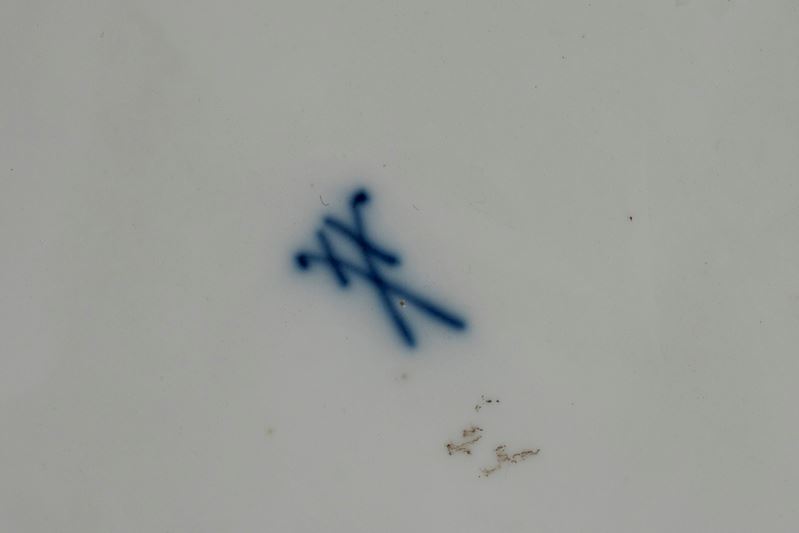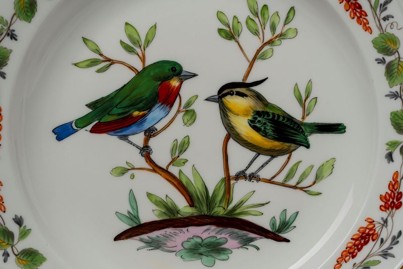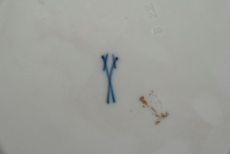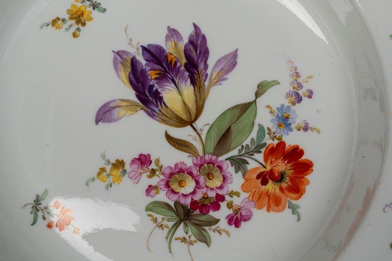 Un piattino da dolce decorato a passerotti su un ramo, un piatto piano con decoro all'orientale e un piatto fondo dipinto a fiori della manifattura di Meissen (lieve sbeccatura lungo in bordo). Un piatto fondo con decoro floreale e profilo dorato manifattura Ginori a Doccia presso Firenze (1870-1890).