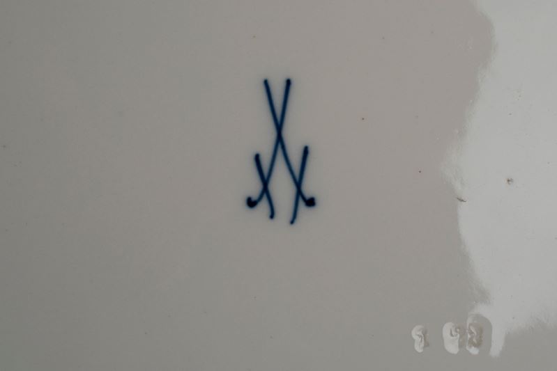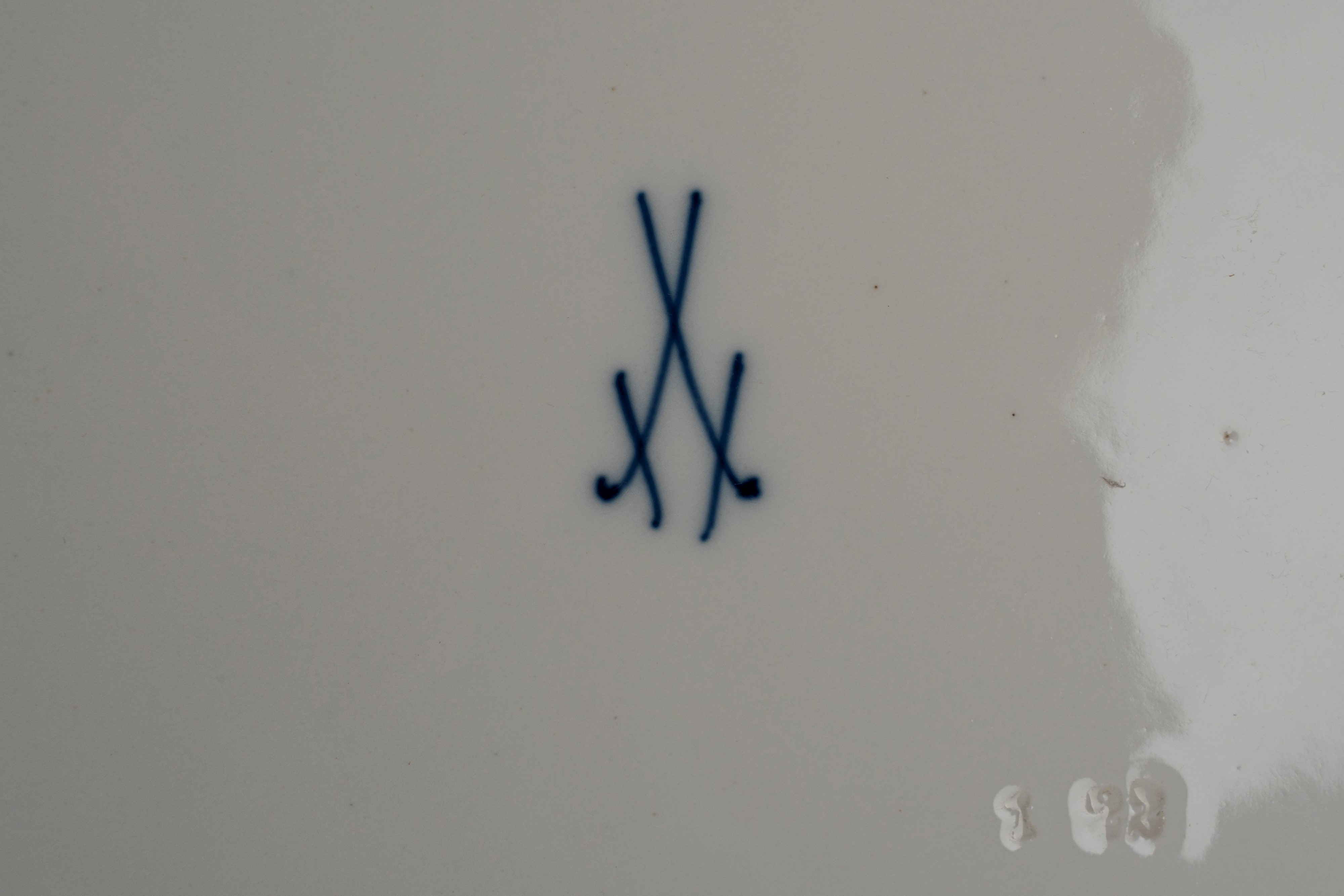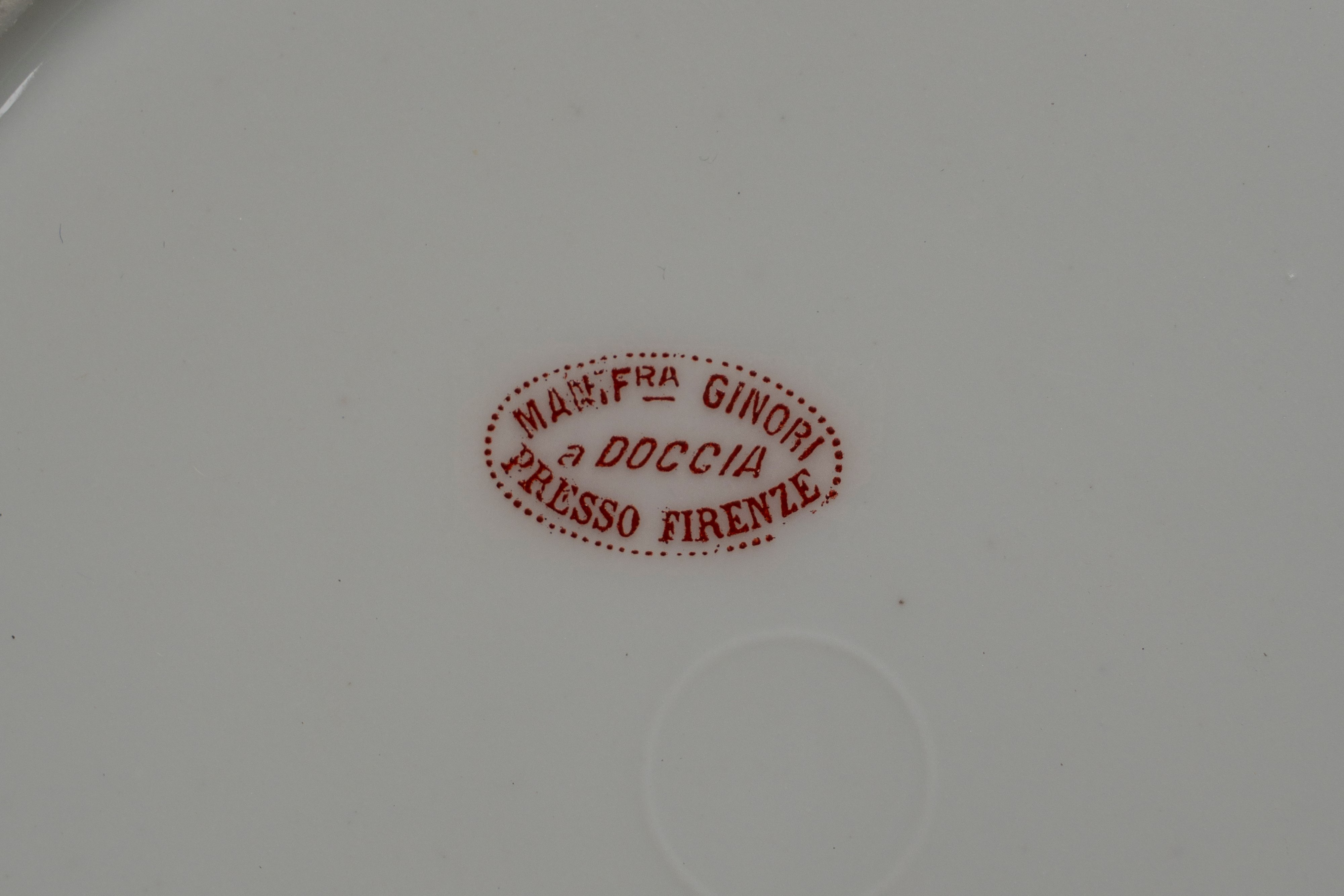 Un piattino da dolce decorato a passerotti su un ramo, un piatto piano con decoro all'orientale e un piatto fondo dipinto a fiori della manifattura di Meissen (lieve sbeccatura lungo in bordo). Un piatto fondo con decoro floreale e profilo dorato manifattura Ginori a Doccia presso Firenze (1870-1890).