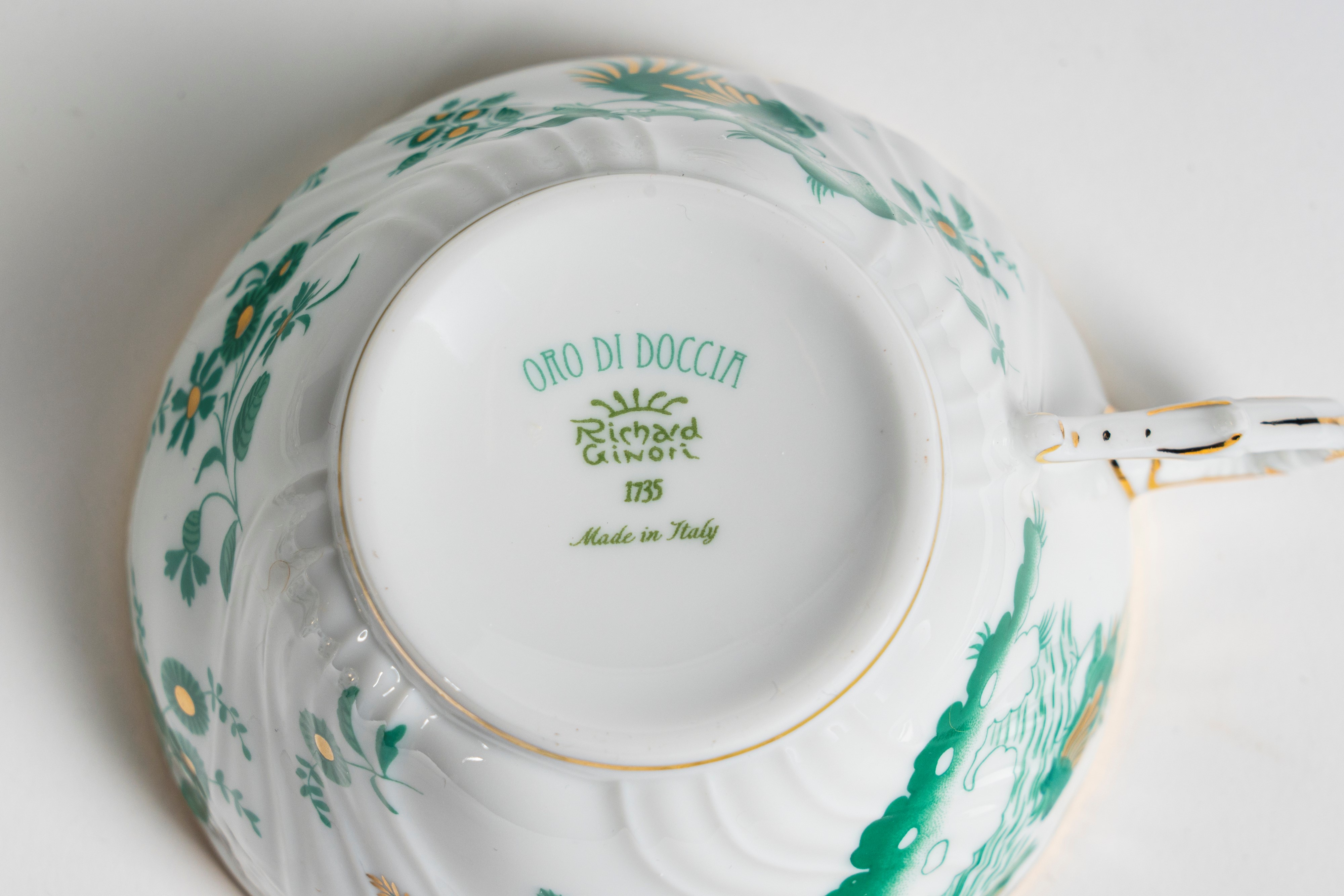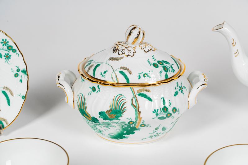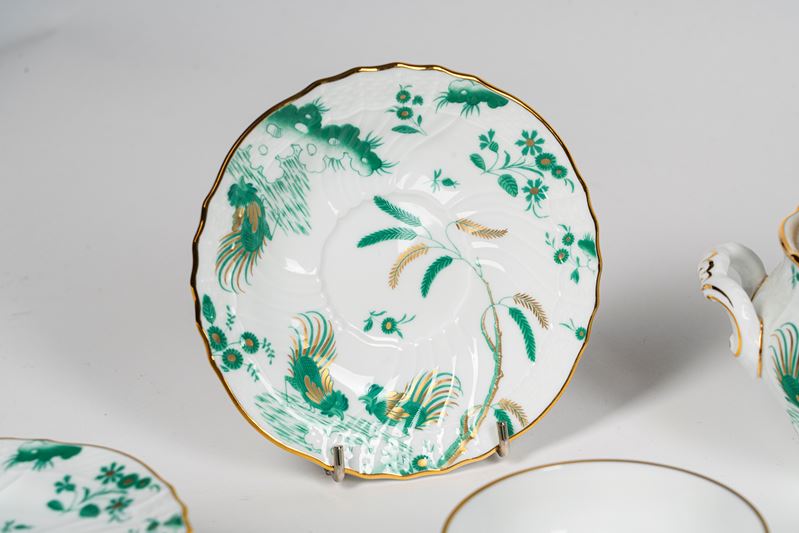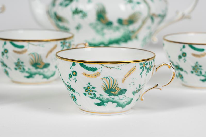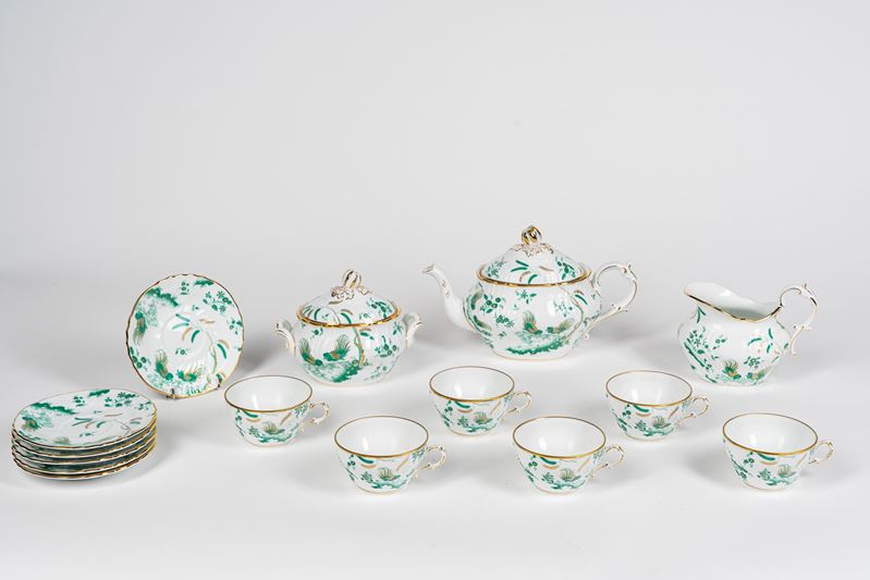 Richard Ginori, servizio da tè in porcellana da sei con profili in oro e decoro nei toni del verde