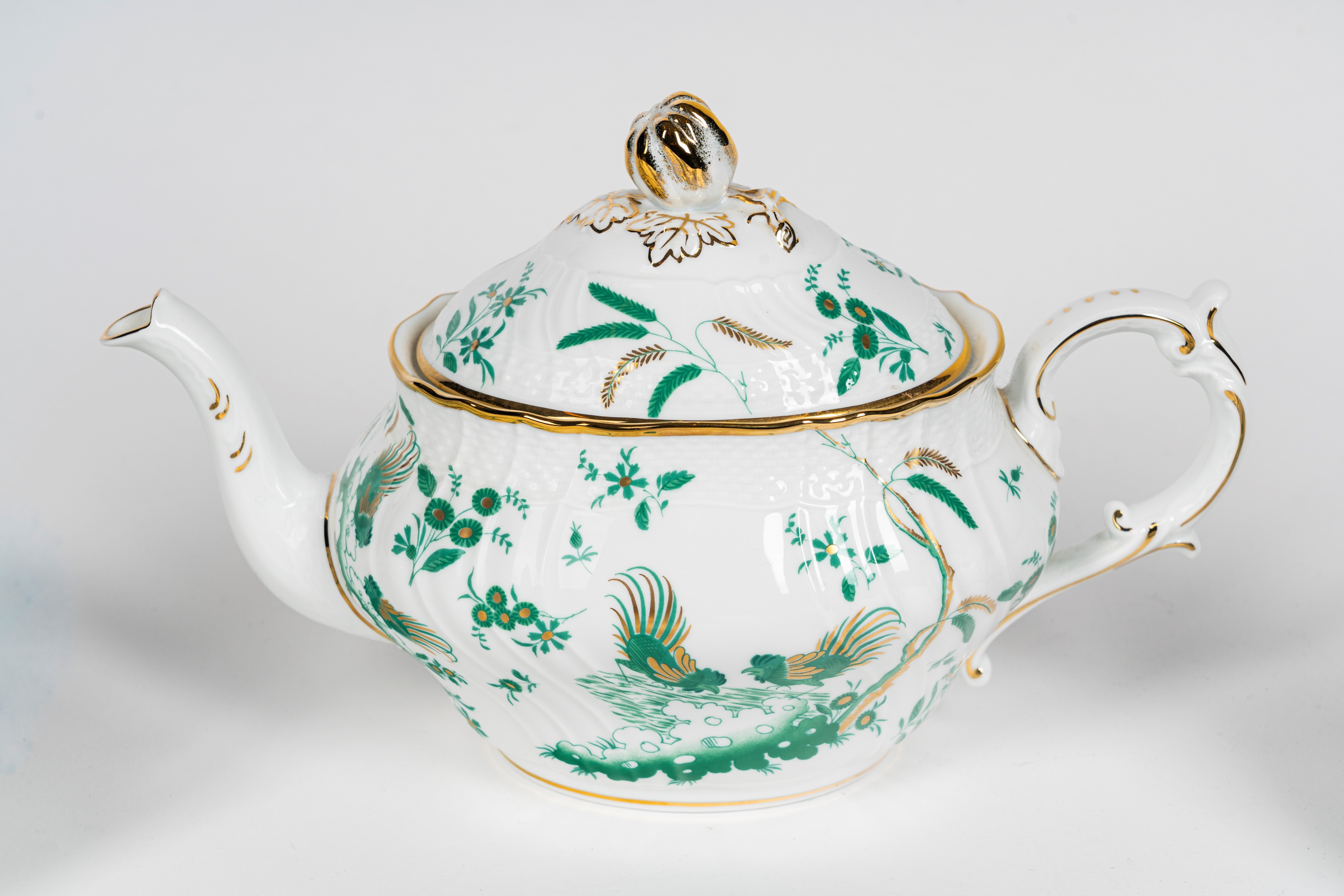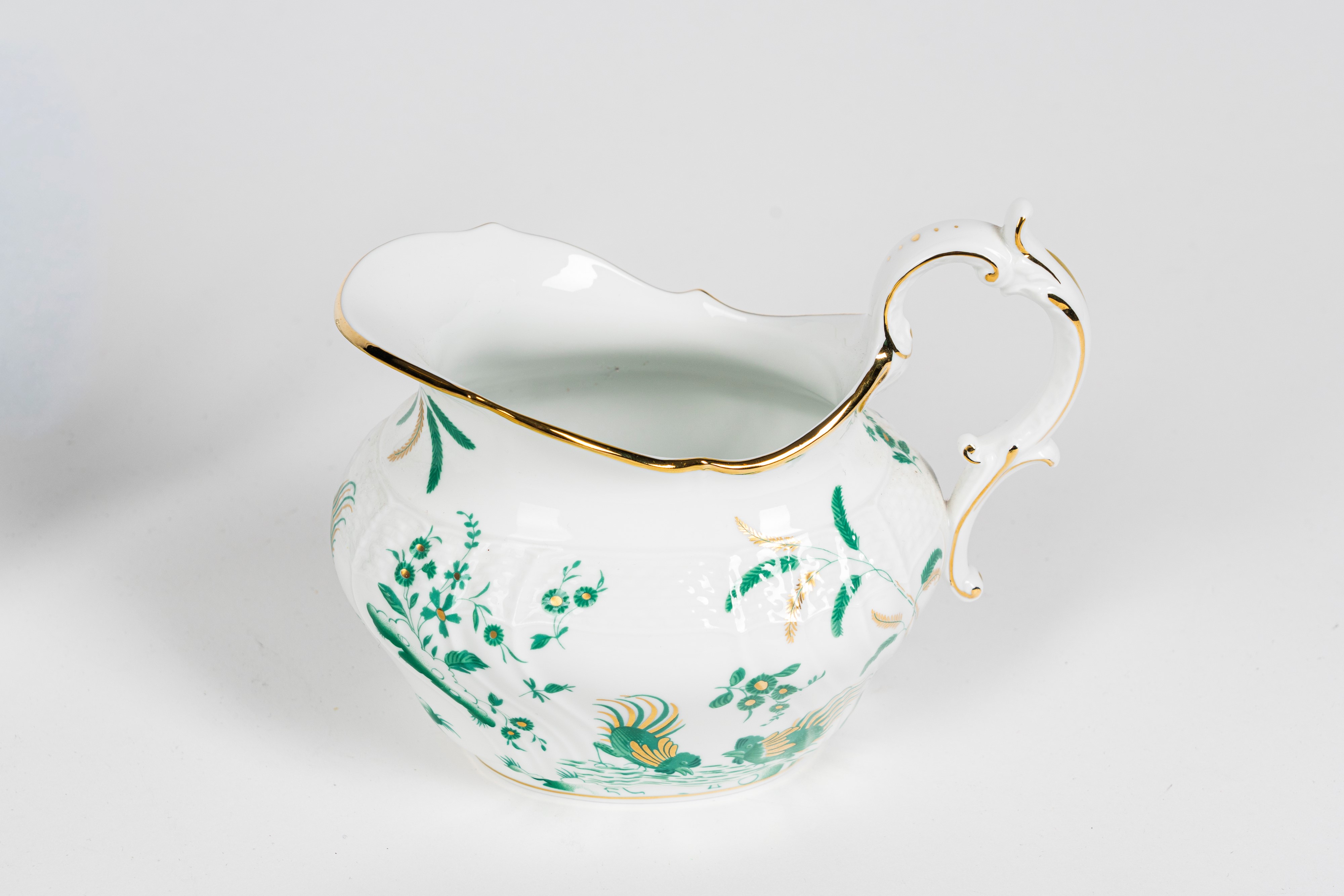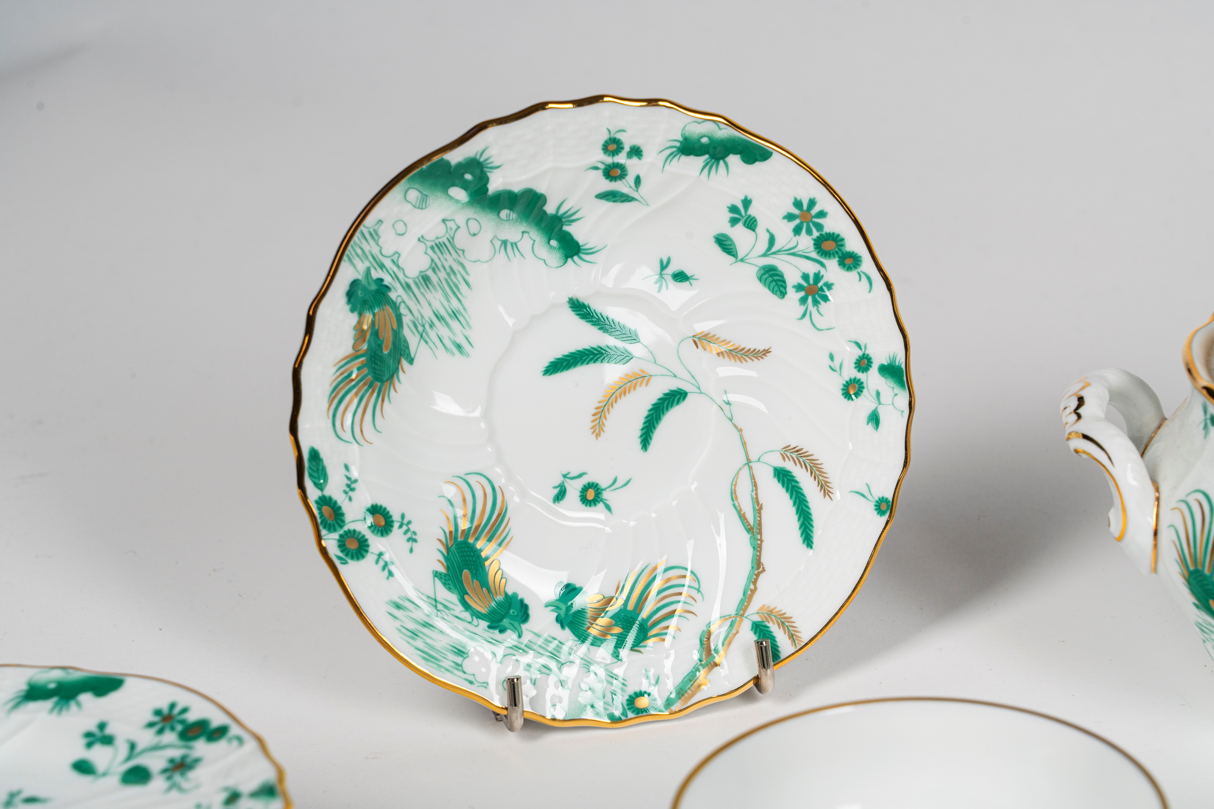 Richard Ginori, servizio da tè in porcellana da sei con profili in oro e decoro nei toni del verde