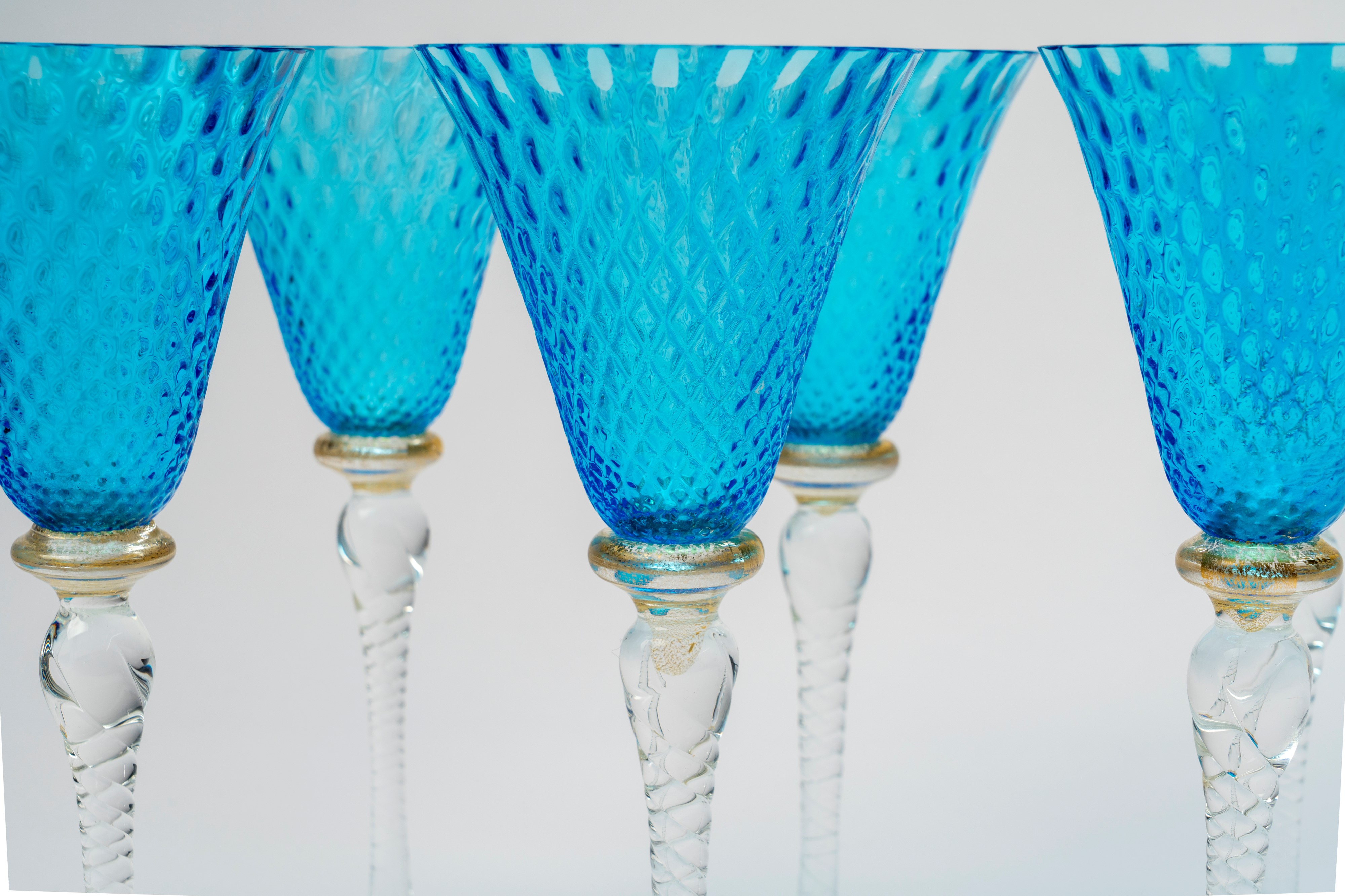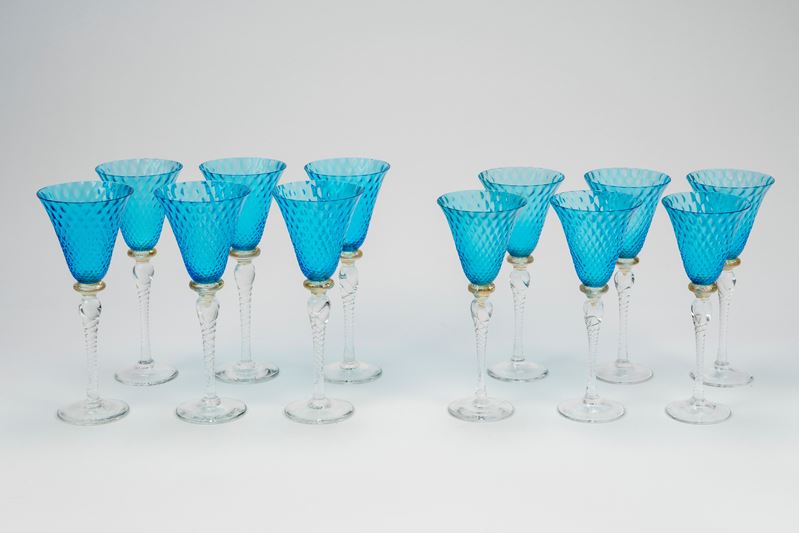 Se calici da vino e sei da acqua in vetro di Murano azzurro e incolore
