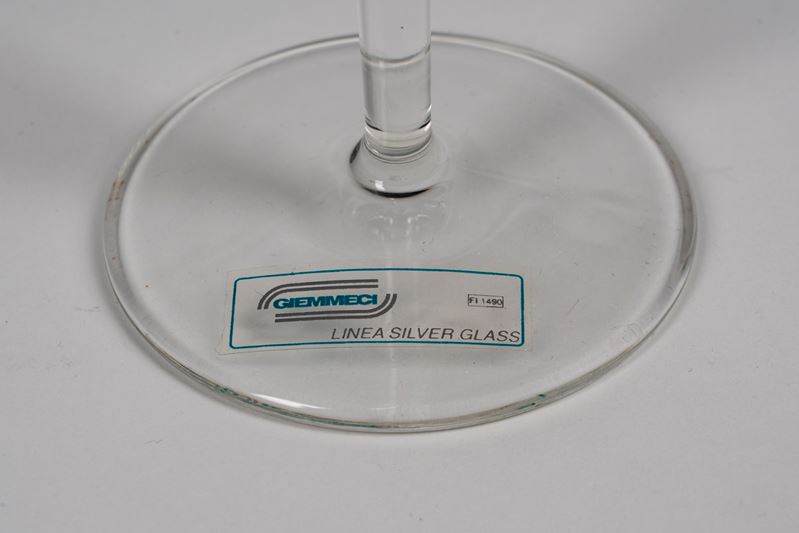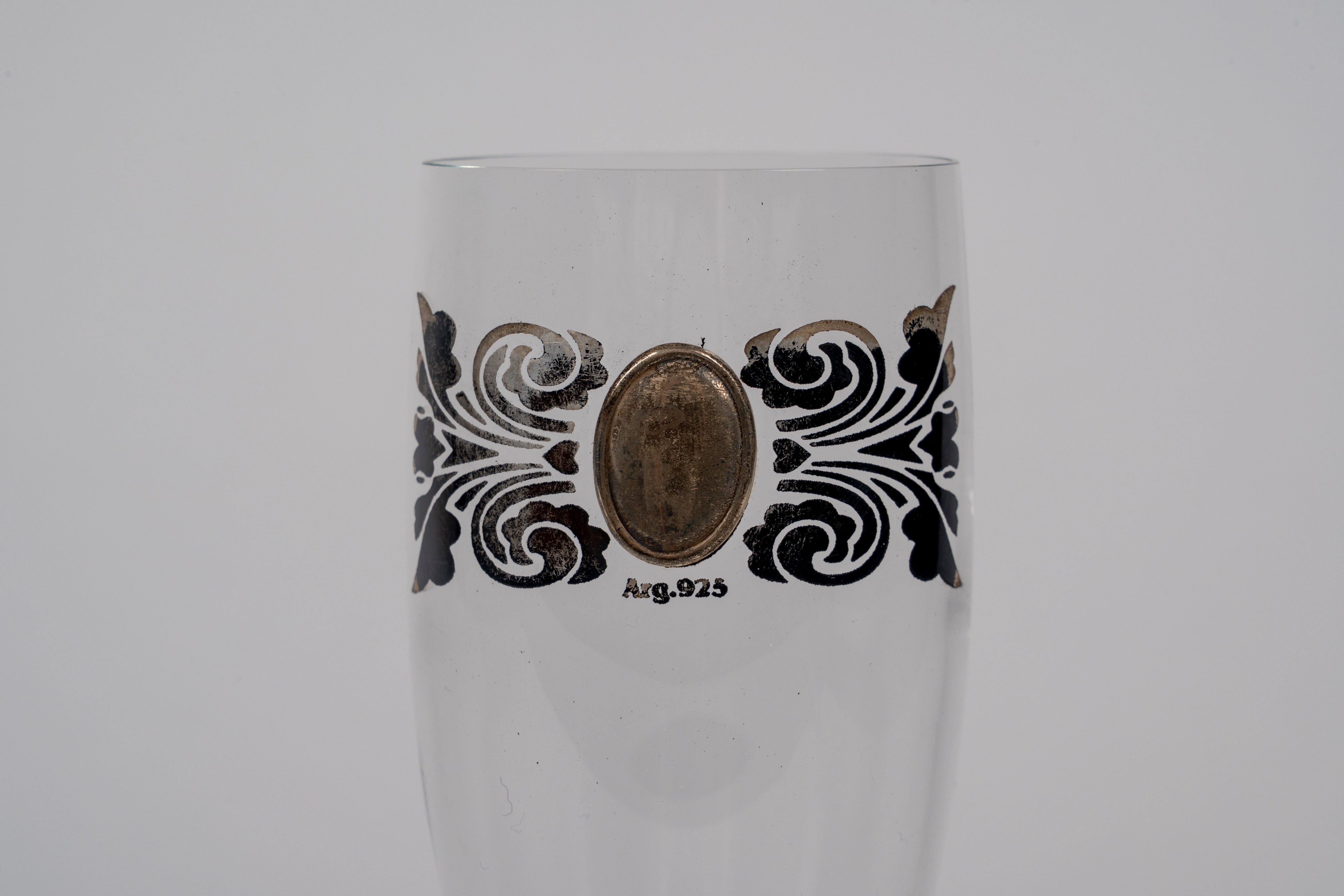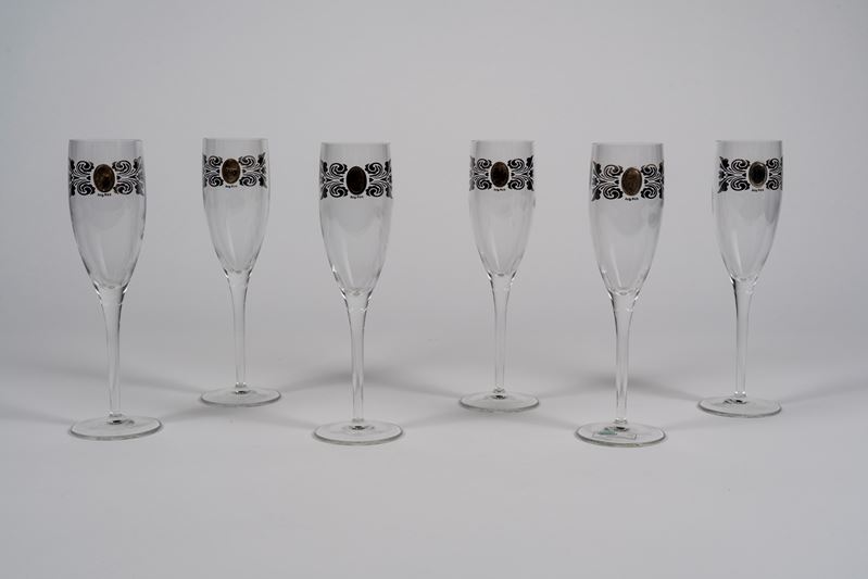 Sei flute con decoro a medaglione a rilievo e volute in argento
