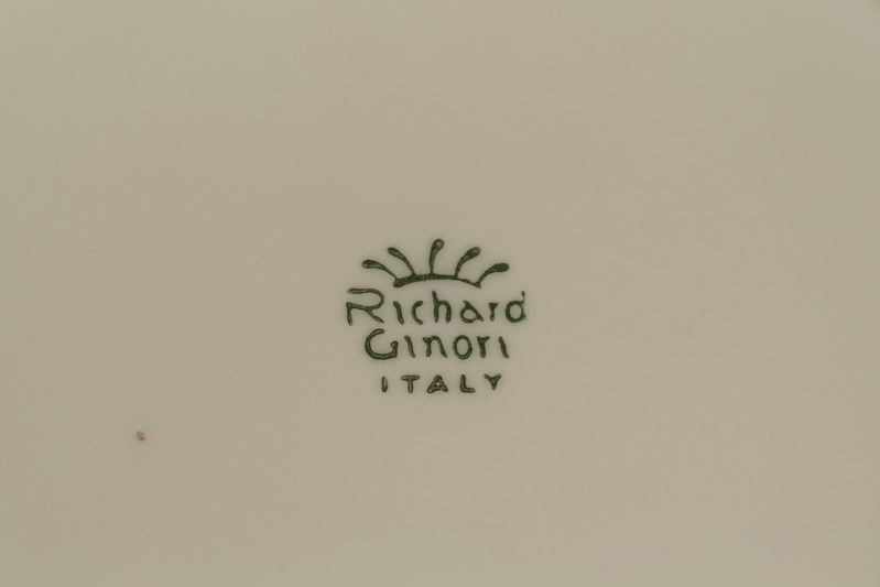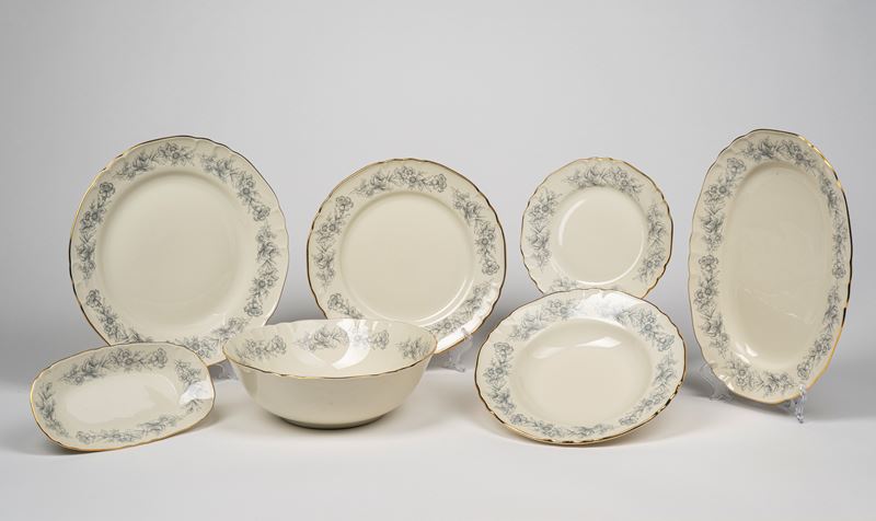 Composto da 12 piatti piani, 12 piatti fondi, 12 piattini da dolce, 1 insalatiera, un piatto tondo da portata, un vassoio e un vassoietto ovale