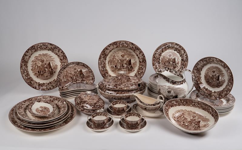 Composto da ventiquattro piatti piani (d cm 25,4), otto fondi (d cm 25), dodici fondi da dessert (d cm 23,5), sei piattini da pane (d cm 18),  un vassoio e un piatto circolare da portata (d cm 32), due ciotole circolari (d cm 23,7), cinque piatti da portata (di cui uno sbeccato lungo il bordo)e due vassoietti biansati di forma ovale (cm max 42,5x35,5), una pescera (cm 51x27), una zuppiera e una legumiera con coperchio, una salsiera con mestolo, sei vassoietti a mezzaluna da antipasto, una ciotola di forma ovale (cm 28x20,5x7,4), una brocca e sei tazze biansate con piattino.