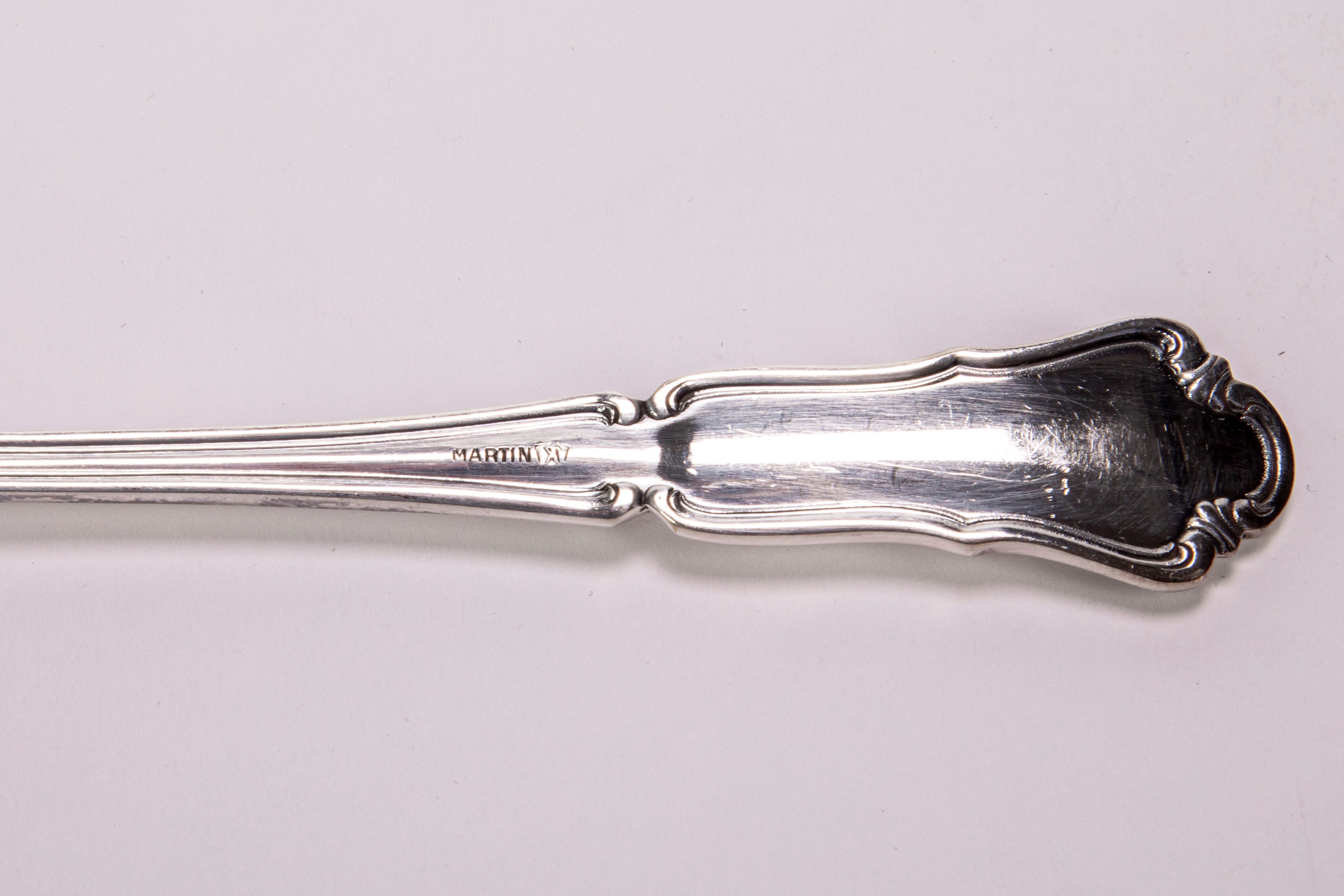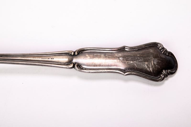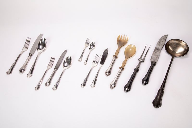 a marca Martin, con prese sagomate scanalate sui bordi composto da 24 forchette, 12 coltelli e 12 cucchiai da portata principale. 12 forchette, 12 coltelli da pesce. 12 forchette, 12 coltelli e 12 cucchiai da antipasto.12 forchettine da dolce e 10 cucchiaini da caffè. 5 posate da servizio.