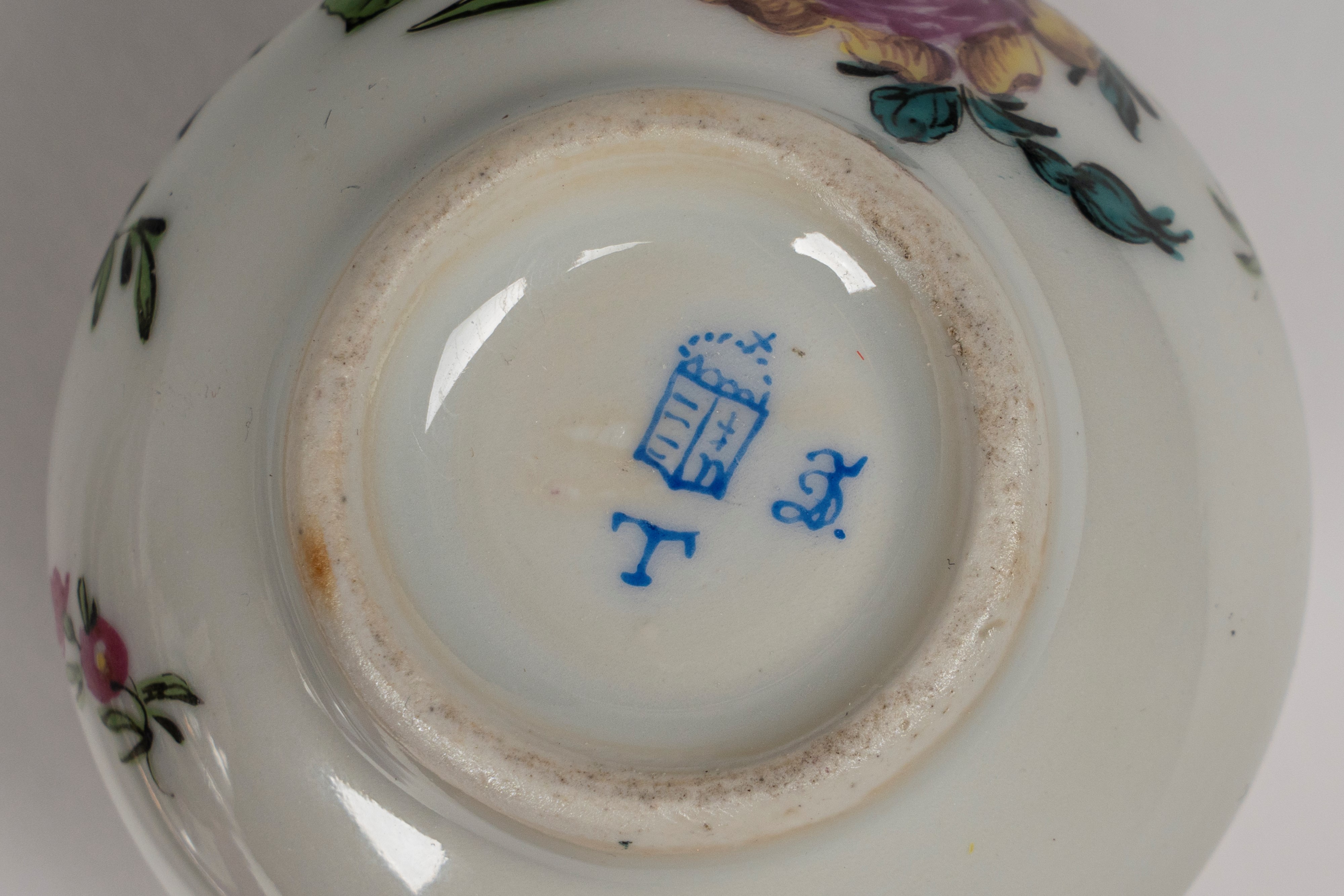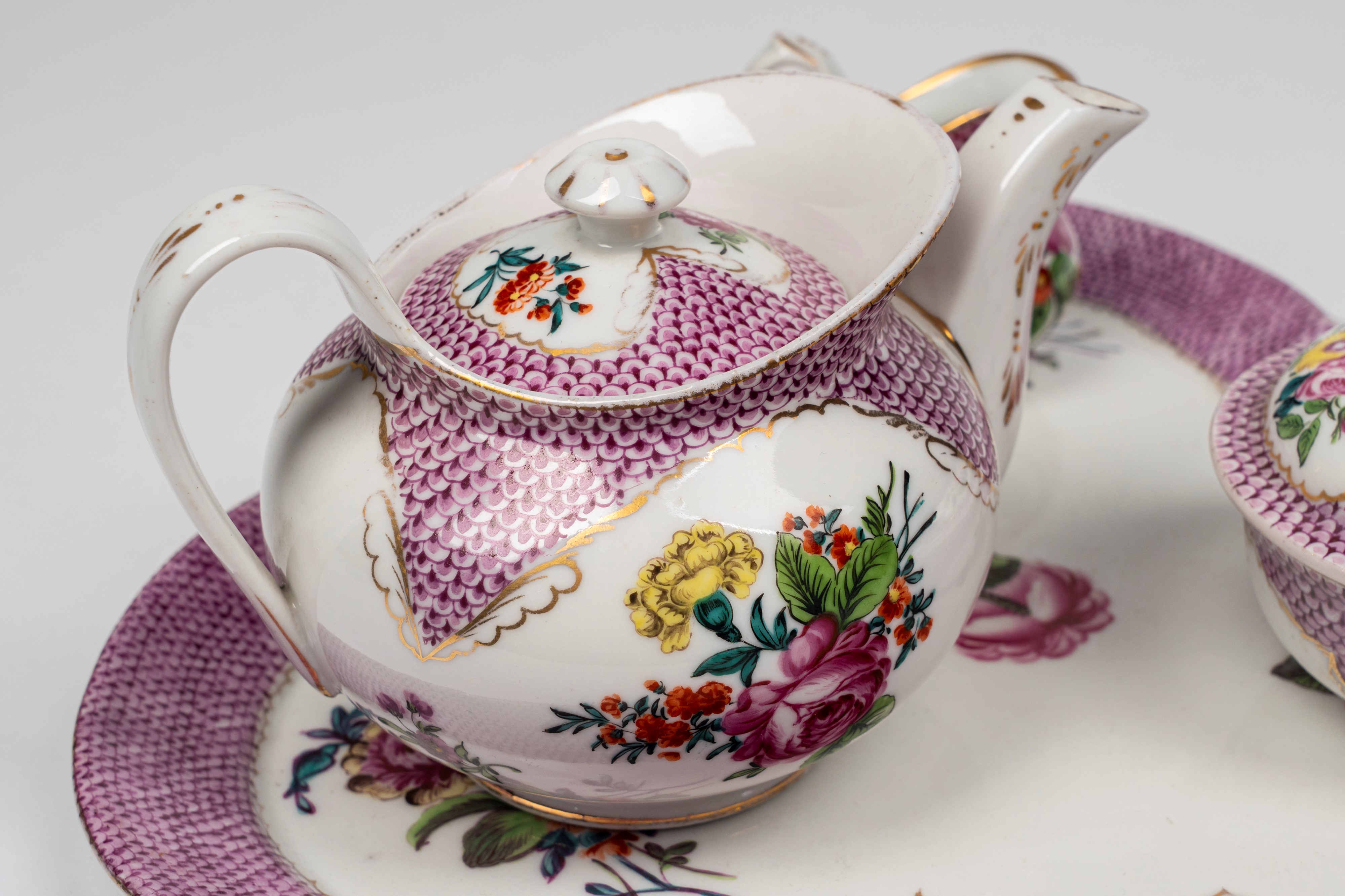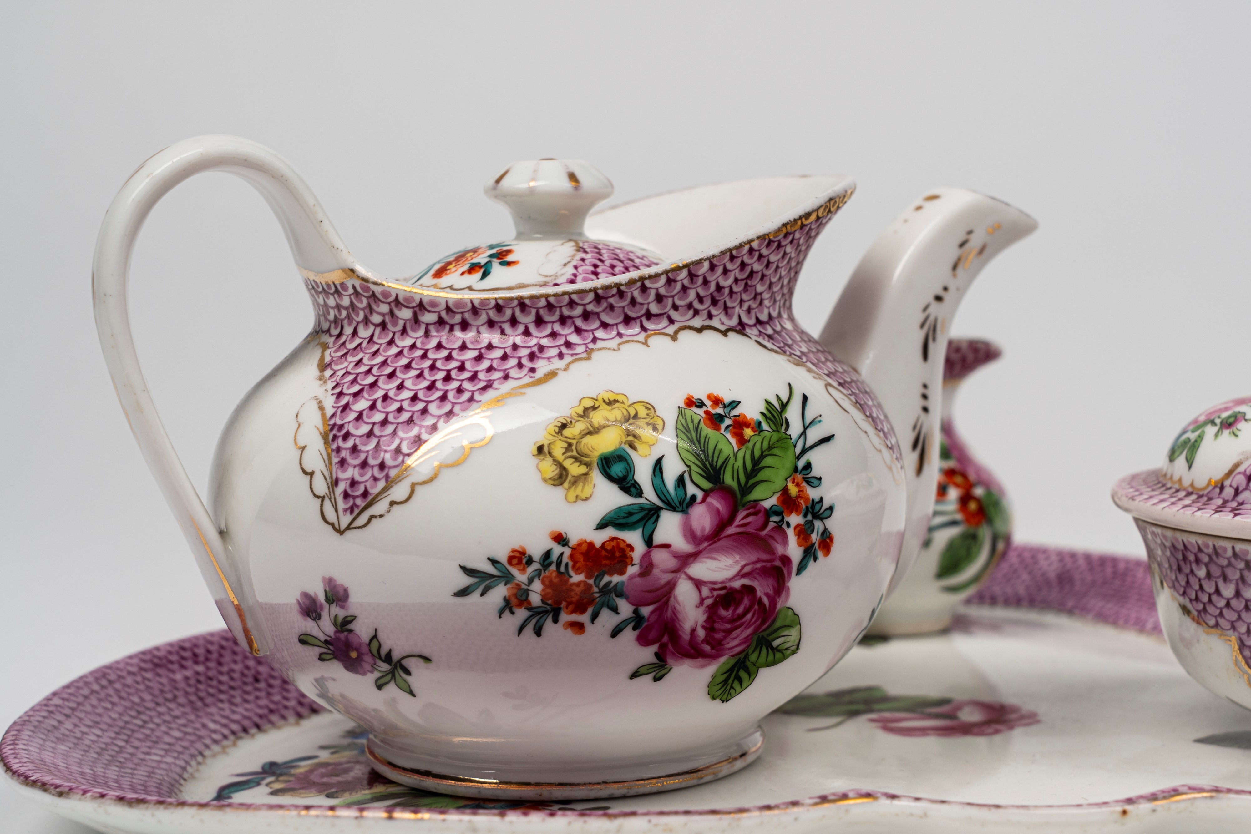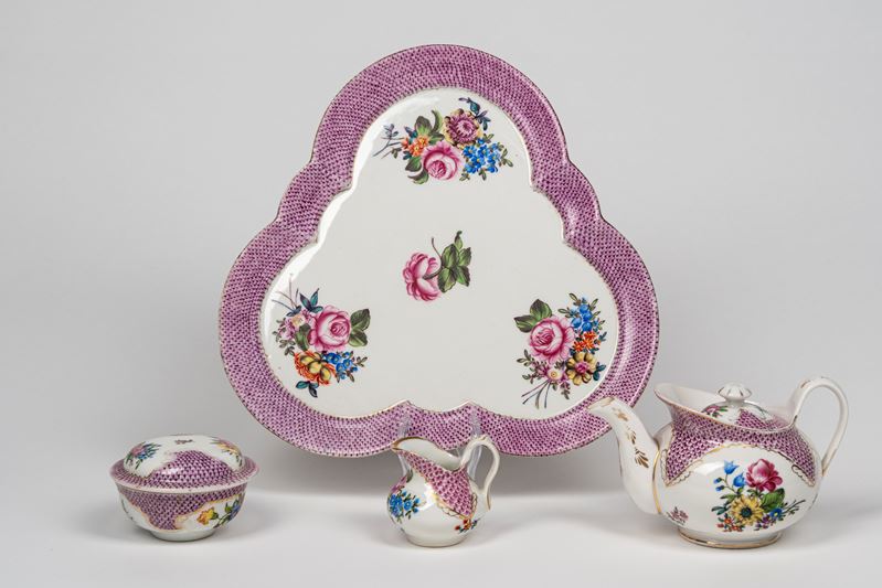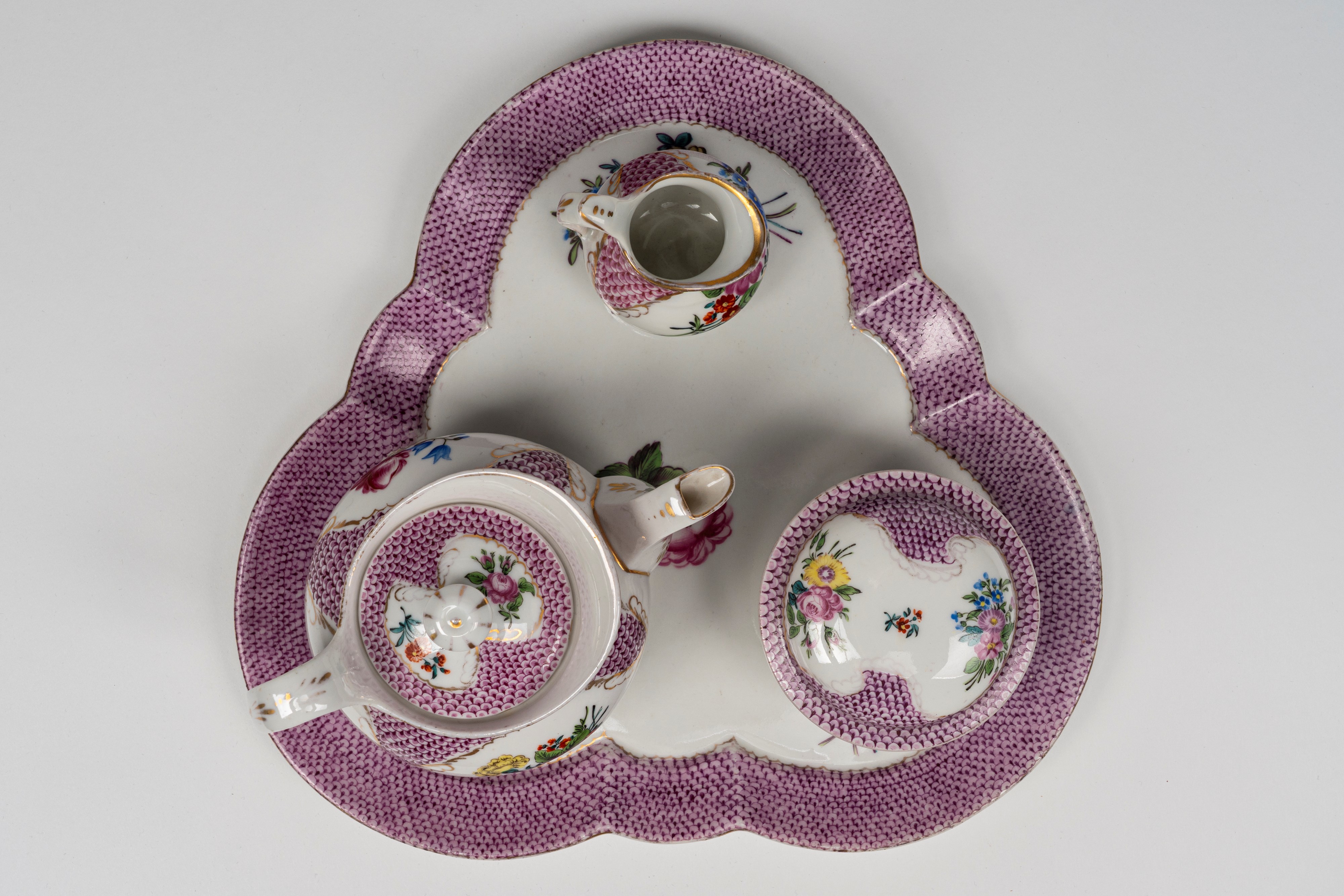 Composto da una teiera, una lattiera, una tazzina con coperchio e un vassoio polilobato. Decoro a bouquet di fiori con bordure a squame nei toni del porpora. Lievi mancanze alle dorature.