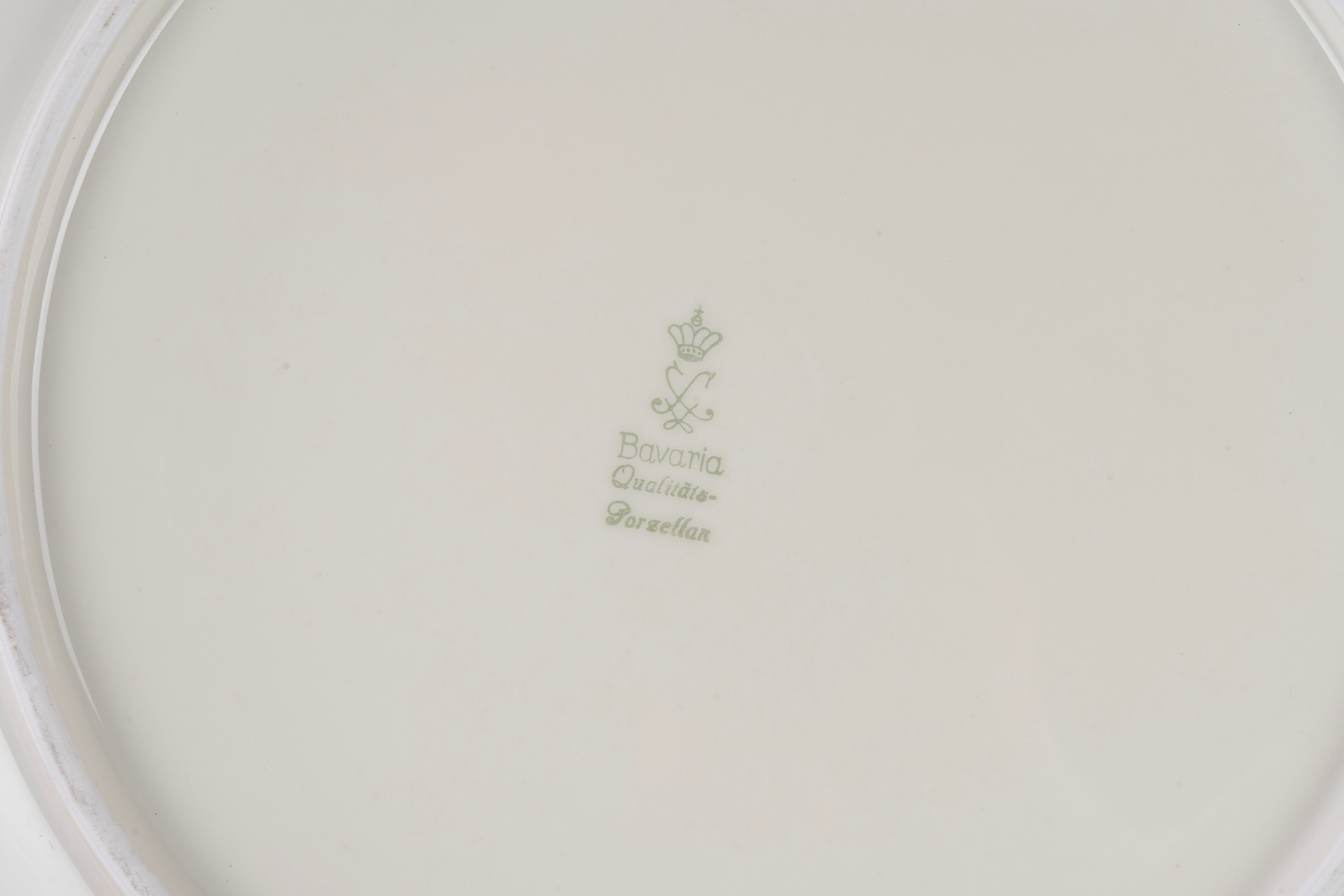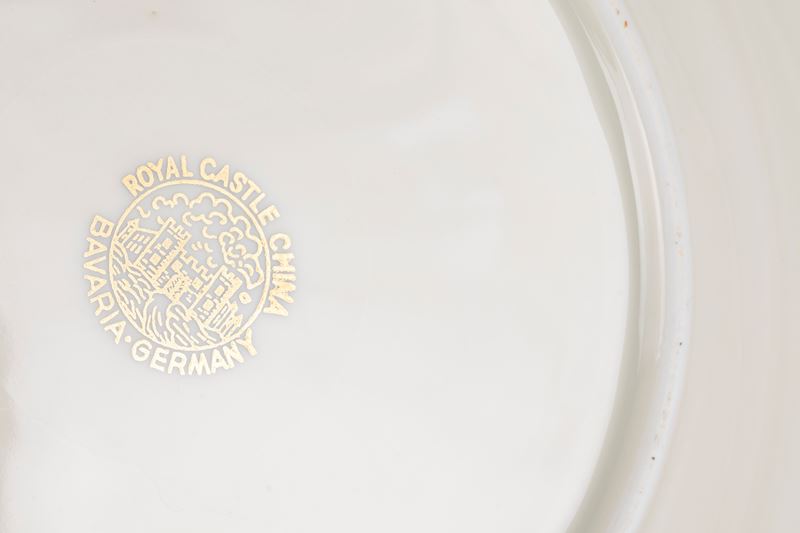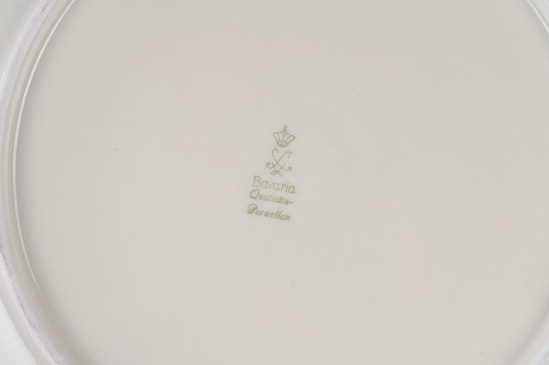 36 piatti piani (diametro cm 24), 12 piatti fondi (diametro cm 24), 11 piatti da frutta (diametro cm 19,5), due zuppiere, un'insalatiera, un piatto da portata tondo, tre piatti da portata ovali di varie misure, due raviere e una salsiera