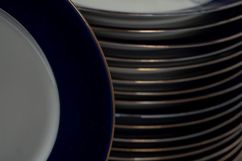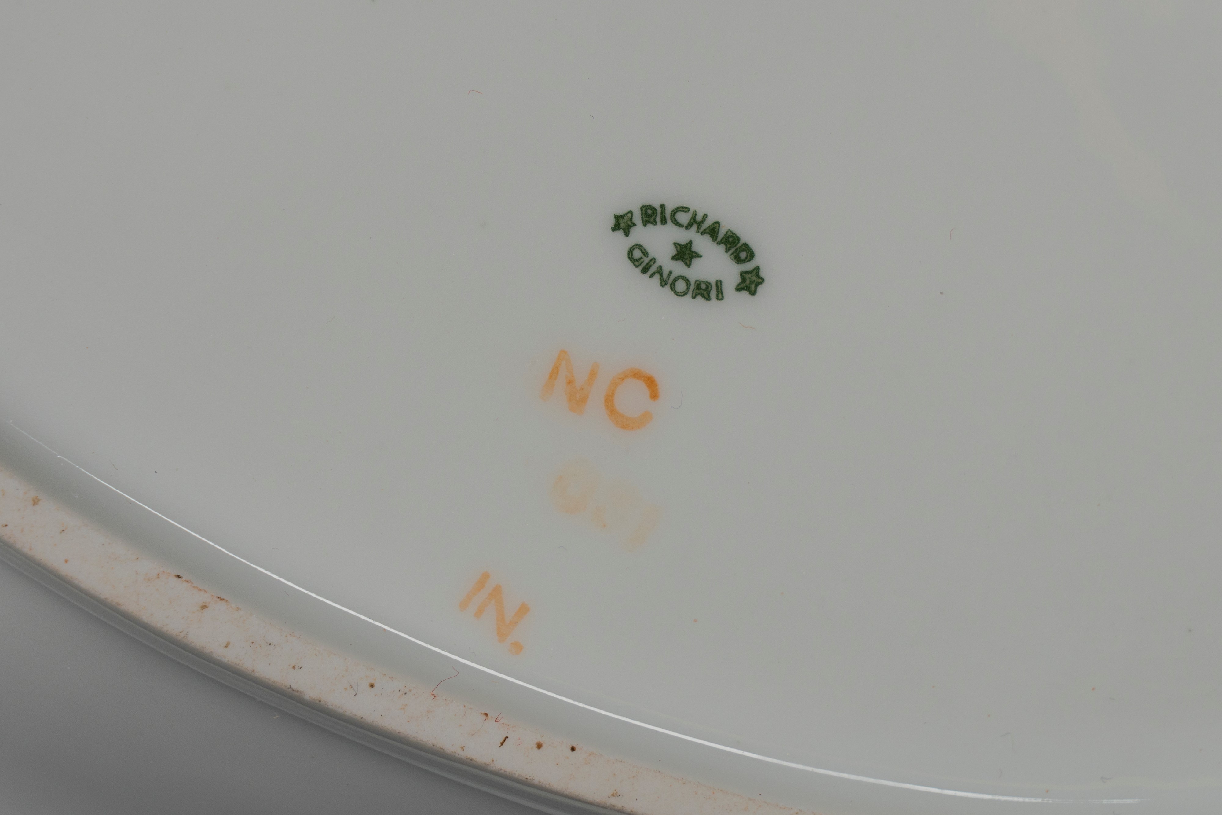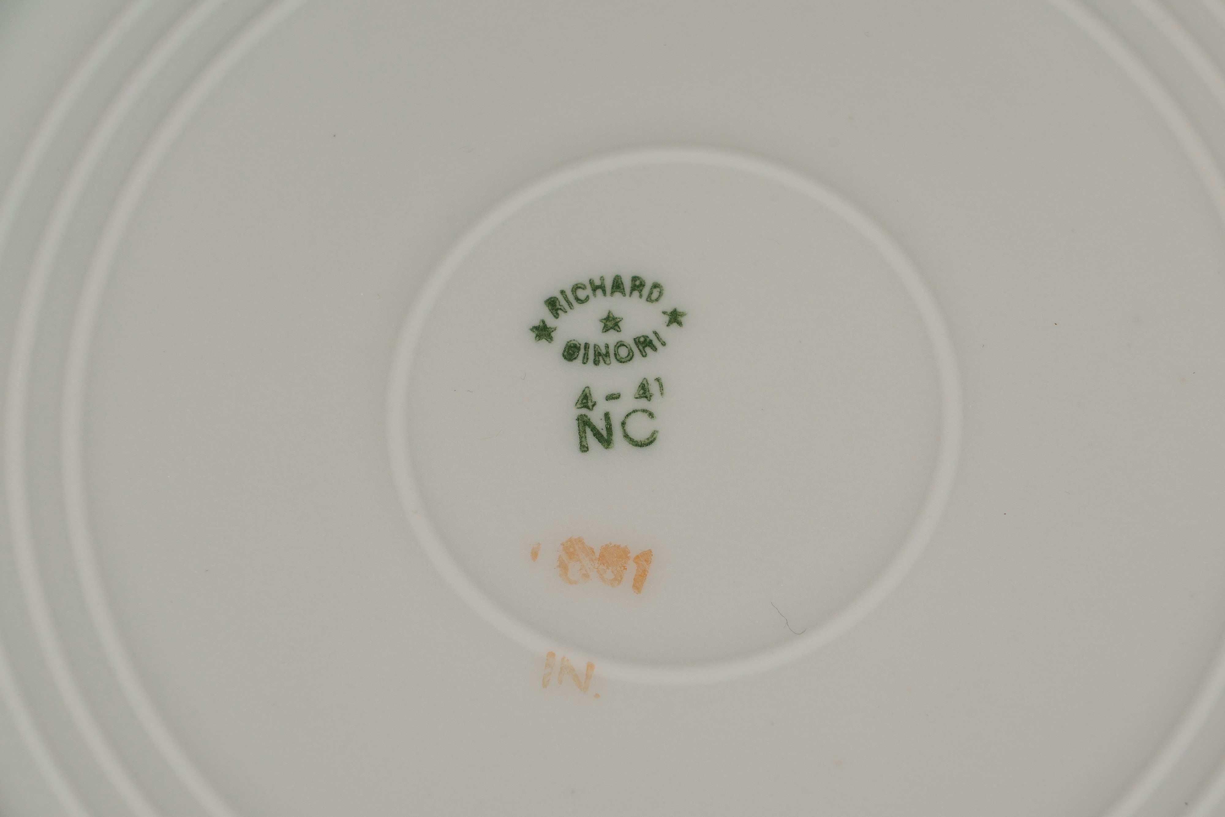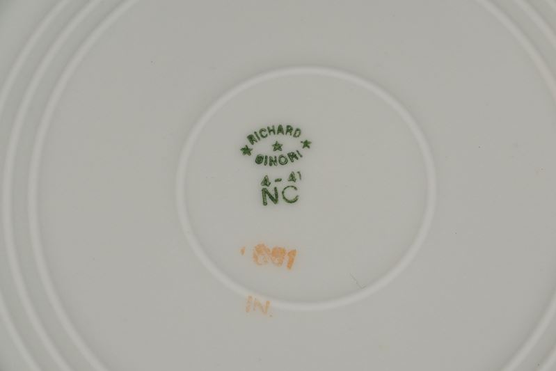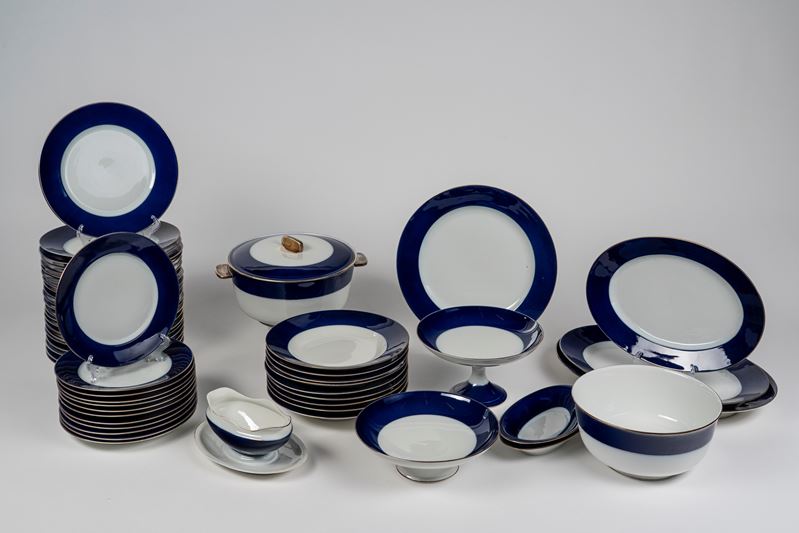 Composto da 22 piatti piani, 9 fondi, 12 da dessert, 2 alzate, 3 piatti ovali da portata, 2 vassoietti ovali, 1 insalatiera, 1 zuppiera, 1 salsiera, e 1 piatto circolare da portata.