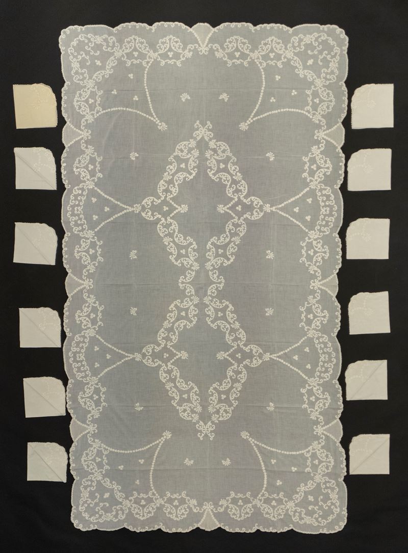 Tovaglia di forma rettangolare in cotone a pelle d'uovo a bordo mosso ricamata con due medaglioni floreali centrali e con ghirlande di fiori lungo il bordo, con dodici tovaglioli
