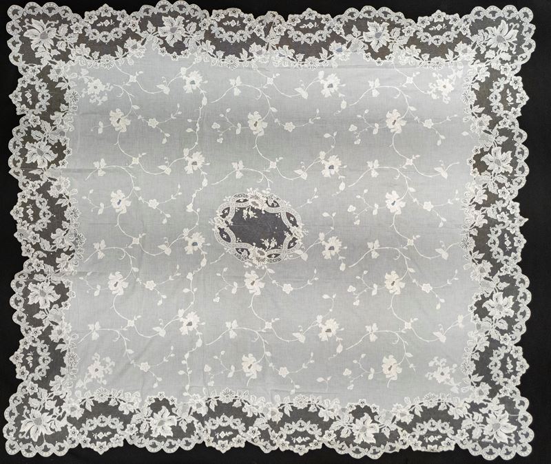 Importante tovaglia in lino decorata con quattro blasoni centrali e motivi floreali lungo il bordo